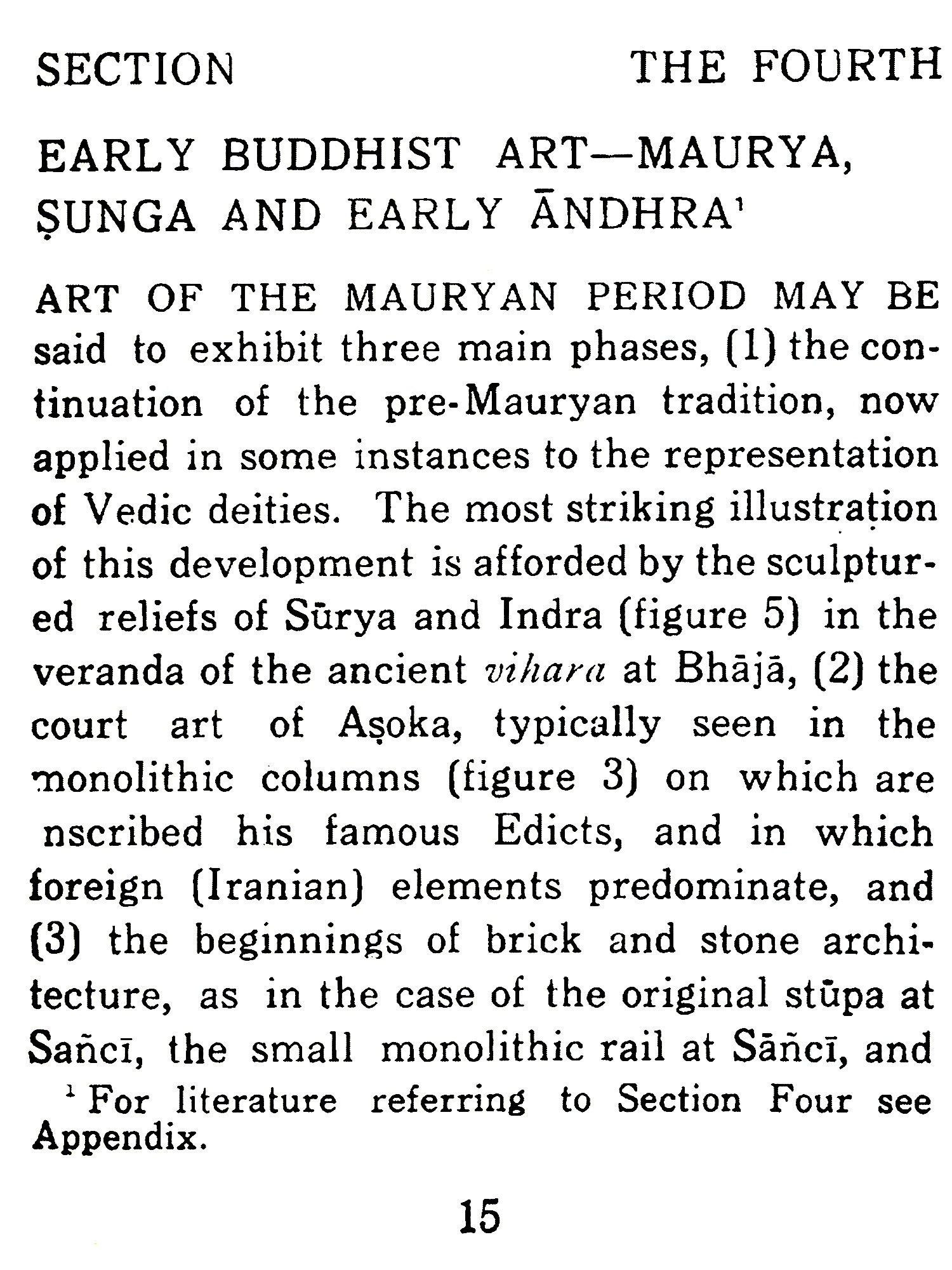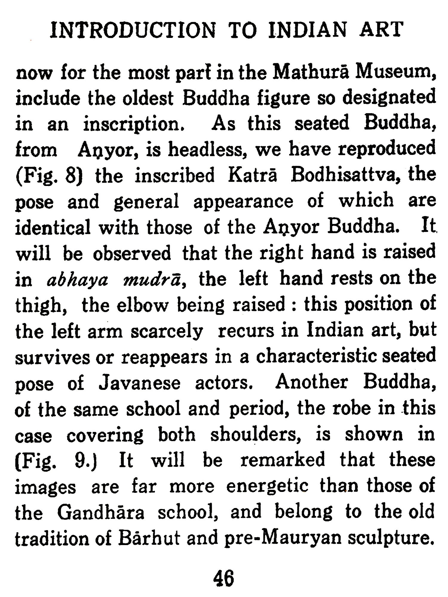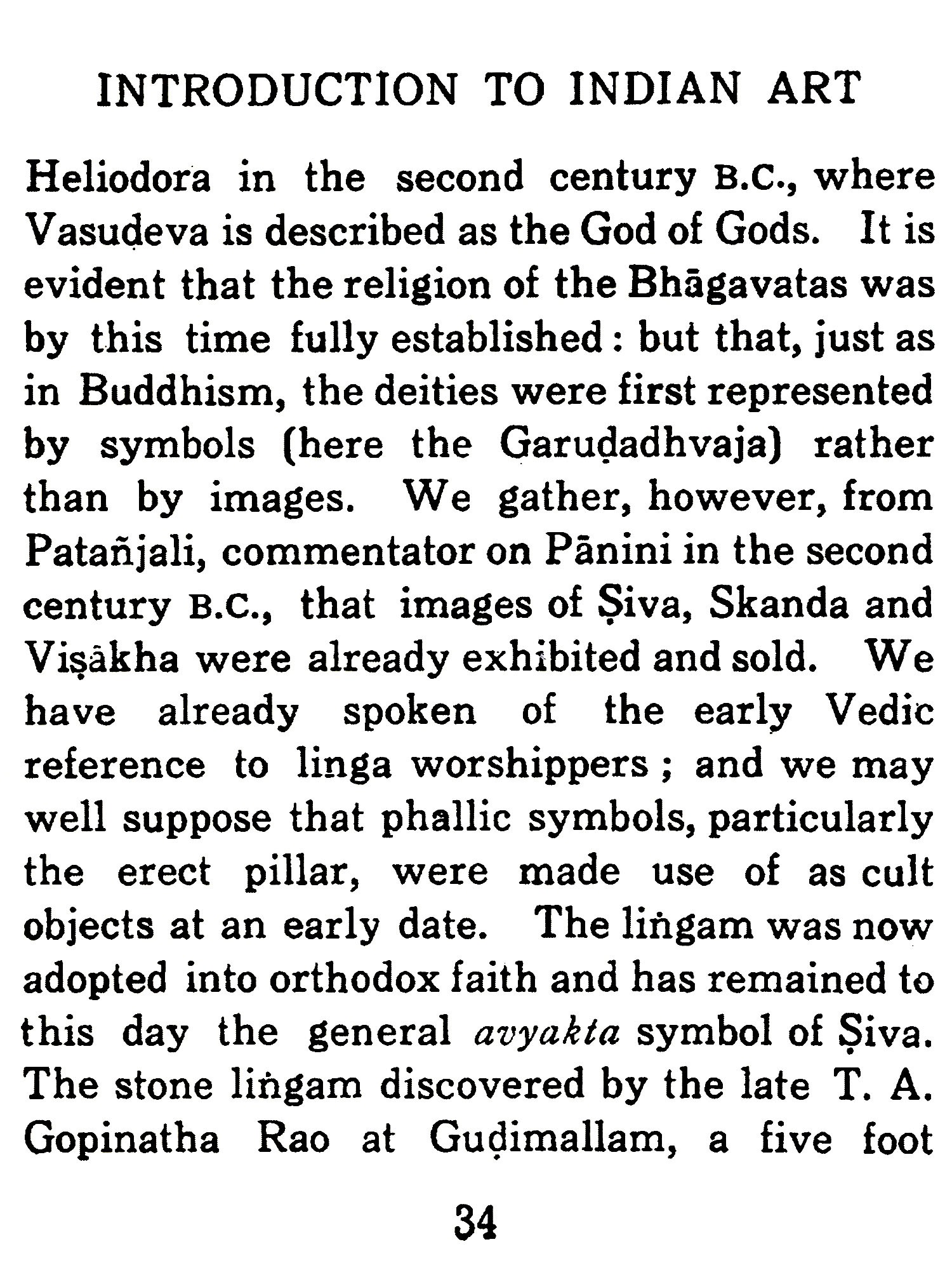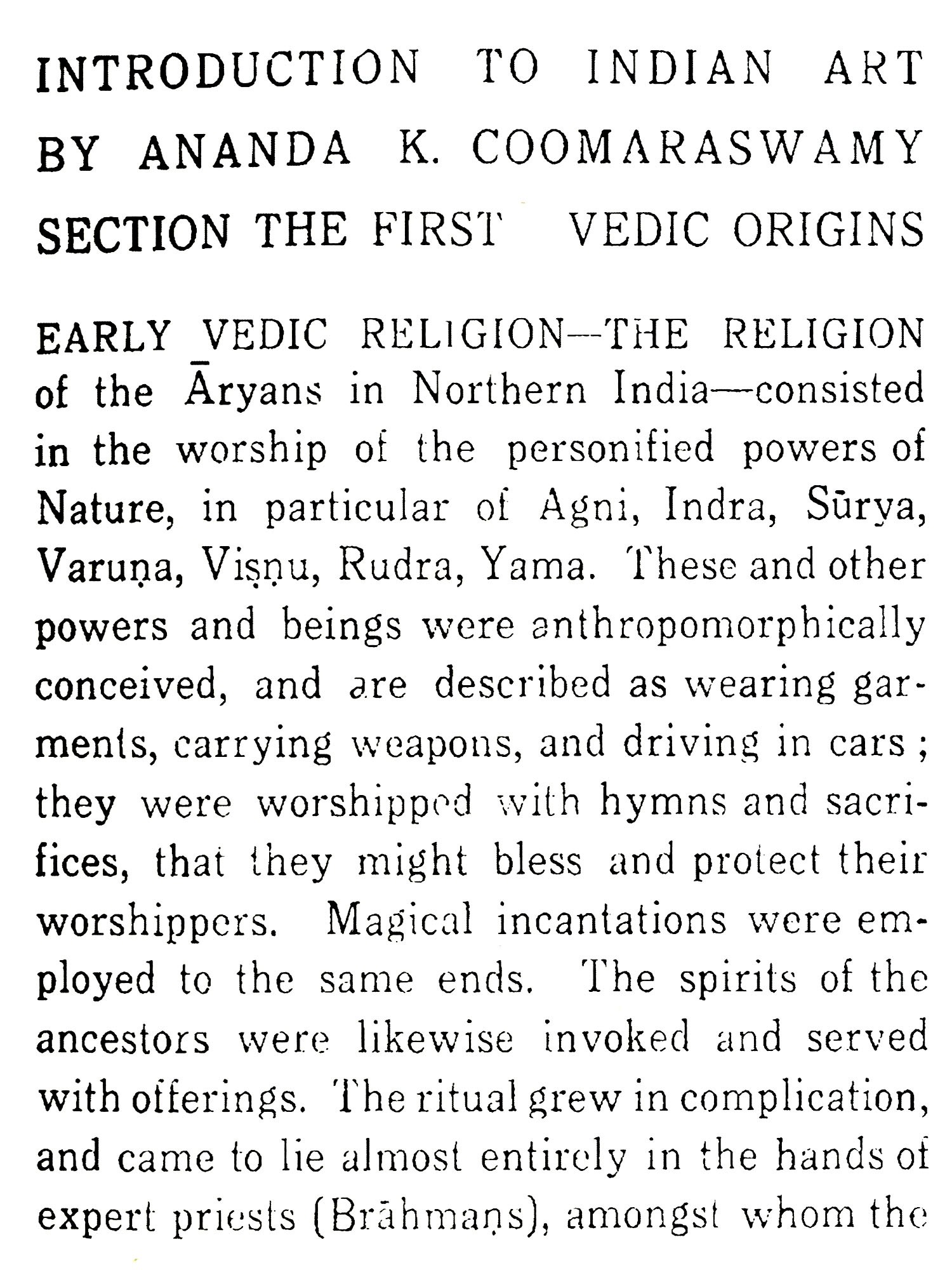 'ART in India,' and 'art' in the modern world mean two very different things. In India, it is the statement of a racial experience, and serves the purposes of life, like daily bread. Indian art has always been produced in response to a demand: that kind of idealism which would glorify the artist who pursues a personal ideal of beauty and strives to express himself, and suffers or perishes for lack of patronage, would appear to Indian thought far more ridiculous or pitiable than heroic. The modern world, with its glorification of personality, produces works of genius and works of mediocrity following the peculiarities of in-dividual artists: in India, the virtue or defect of any work is the virtue or defect of the race in that age. The names and peculiarities of individual artists, even if we could recover them, would not enlighten us: nothing depends upon genius or requires the knowledge of an individual psychology for its interpretation. To understand at all, we must understand experiences common to all men of the time and place in which a given work was produced. All Indian art has been produced by professional craftsmen following traditions handed down in pupillary succession. Originality and novelty are never intentional. Changes in form, distinguishing the art of one age from that of another, reflect the necessities of current theology, and not the invention of genius: changes in quality reflect the varying, but not deliberately varied, changes in racial psychology, vitality, and taste. What is new arises constantly in Indian tradition without purpose or calculation on the part of the craftsman, simply because life has remained over long extended periods an immediate experience. Tradition is a living thing, and utterly unlike the copying of styles which has replaced tradition in modern life. No such failure of energy as archaism represents appears in Indian art before the twentieth century.