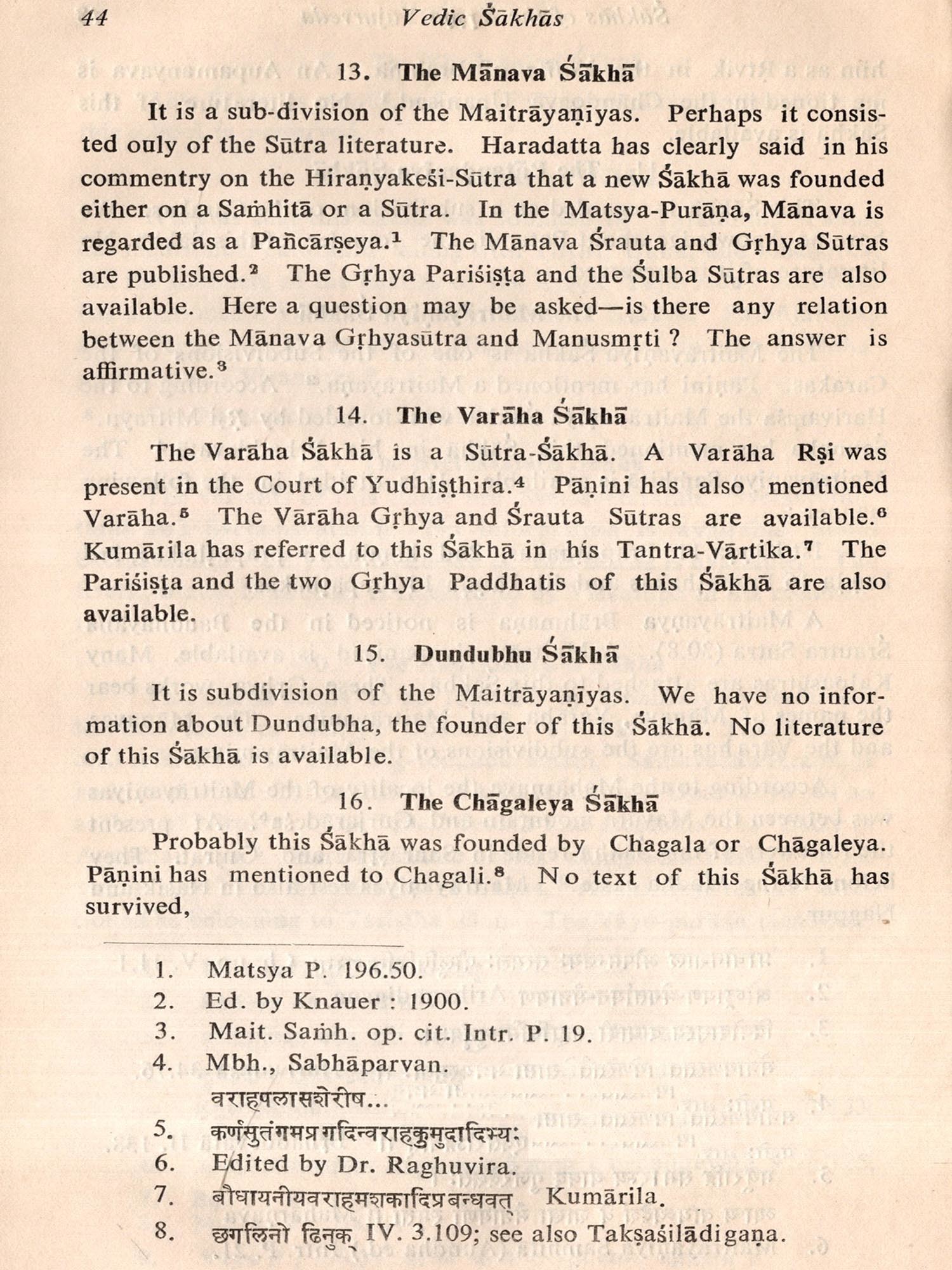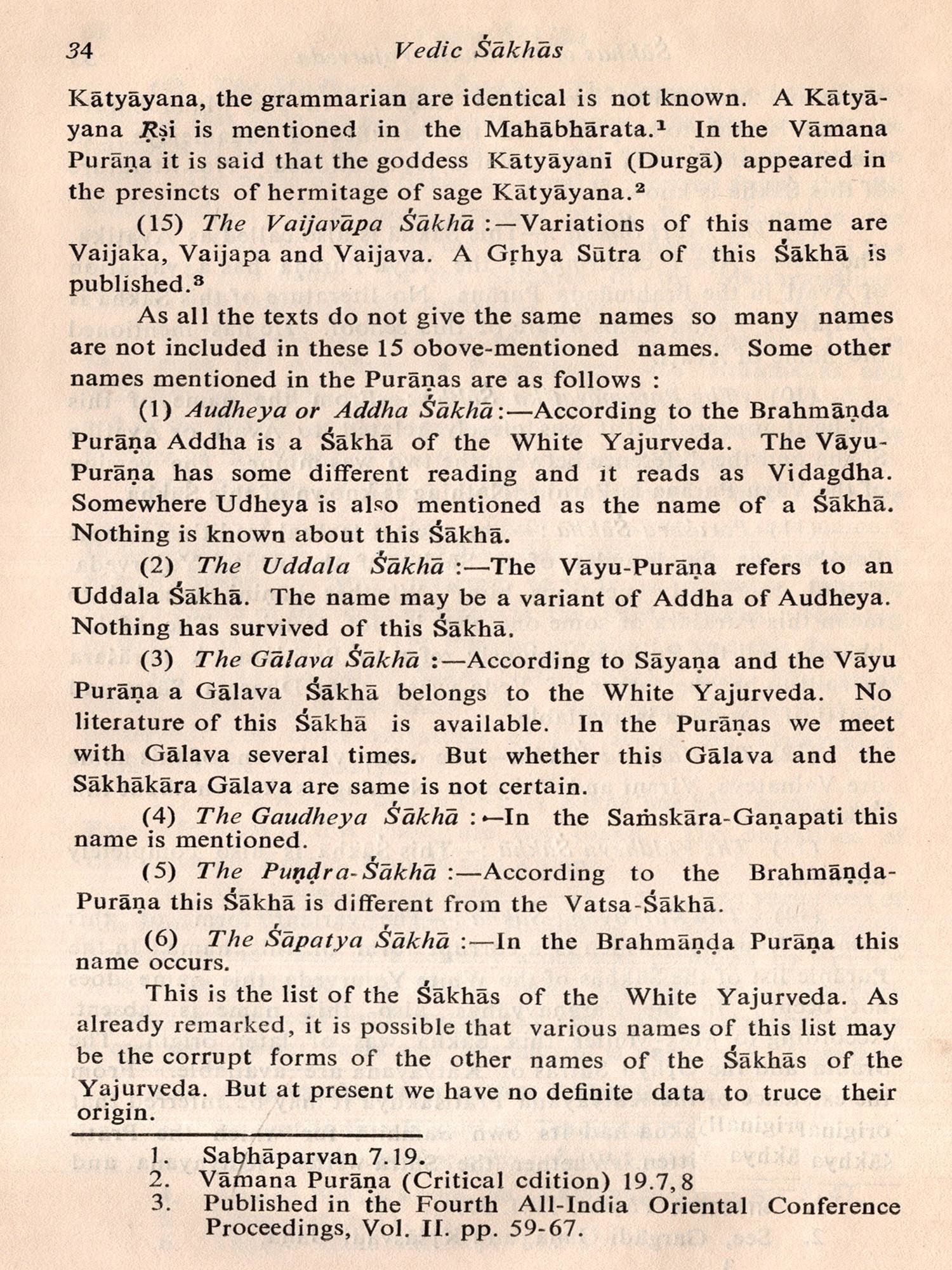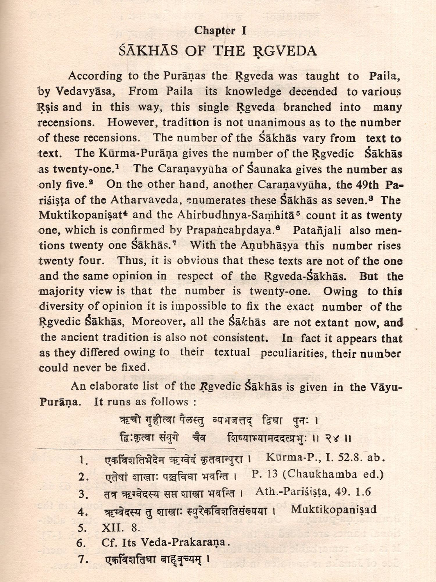 The Vedic Sakhas were of great cultural, literary and of course religious importance both in the Vedic and the post-Vedic period because they institutionalised the practice of the rituals in the group of people who owed allegiance to one of these. Each Sakha in the beginning had its own Samhita, Brahmana, Aranyaka, Upanisad and the Sutras-as that a complete set of literature was made available to the followers of the Sakha. In the course of the time much of this literature was lost and irretrievably mixed up so that now many of the original Sakhas do not even exist. However, since the lure of belonging to a special Sakha was strong many new Sakhas were introduced on the basis of particular Brahmanas and even Sutras. These Sakhas often differed from one another only in minor details of the ritualistic mode of performing the religious rites either on special occasions or in daily life. Since it is the bounden duty of an orthodox Hindu to perform his sacramental rites in accordance with the mode prescribed by his own Vedic Sakha, this lent a sort of continuity and life to these. The onslaught of time with consequent changes in life styles has caused many (or most) of these different Sakhas to survive only in name. It is here that the Puranic literature comes to our help since these often refer to the different Vedic Sakhas by their name. They sometimes also refer to the literaturc associated with these individual Sakhas most of which is now not available.