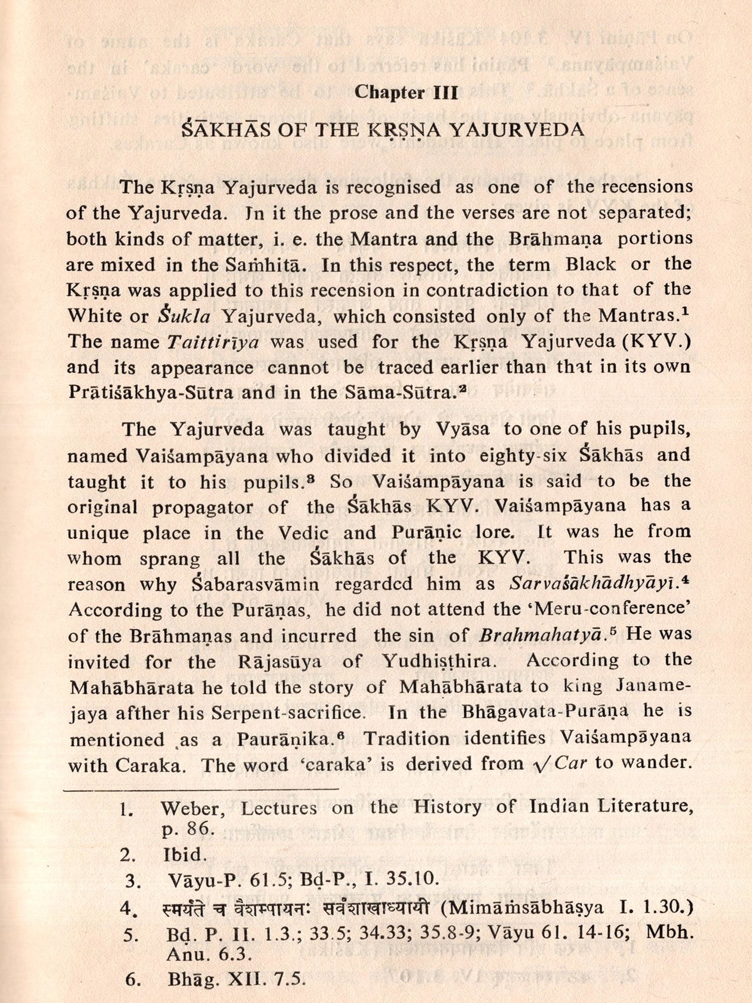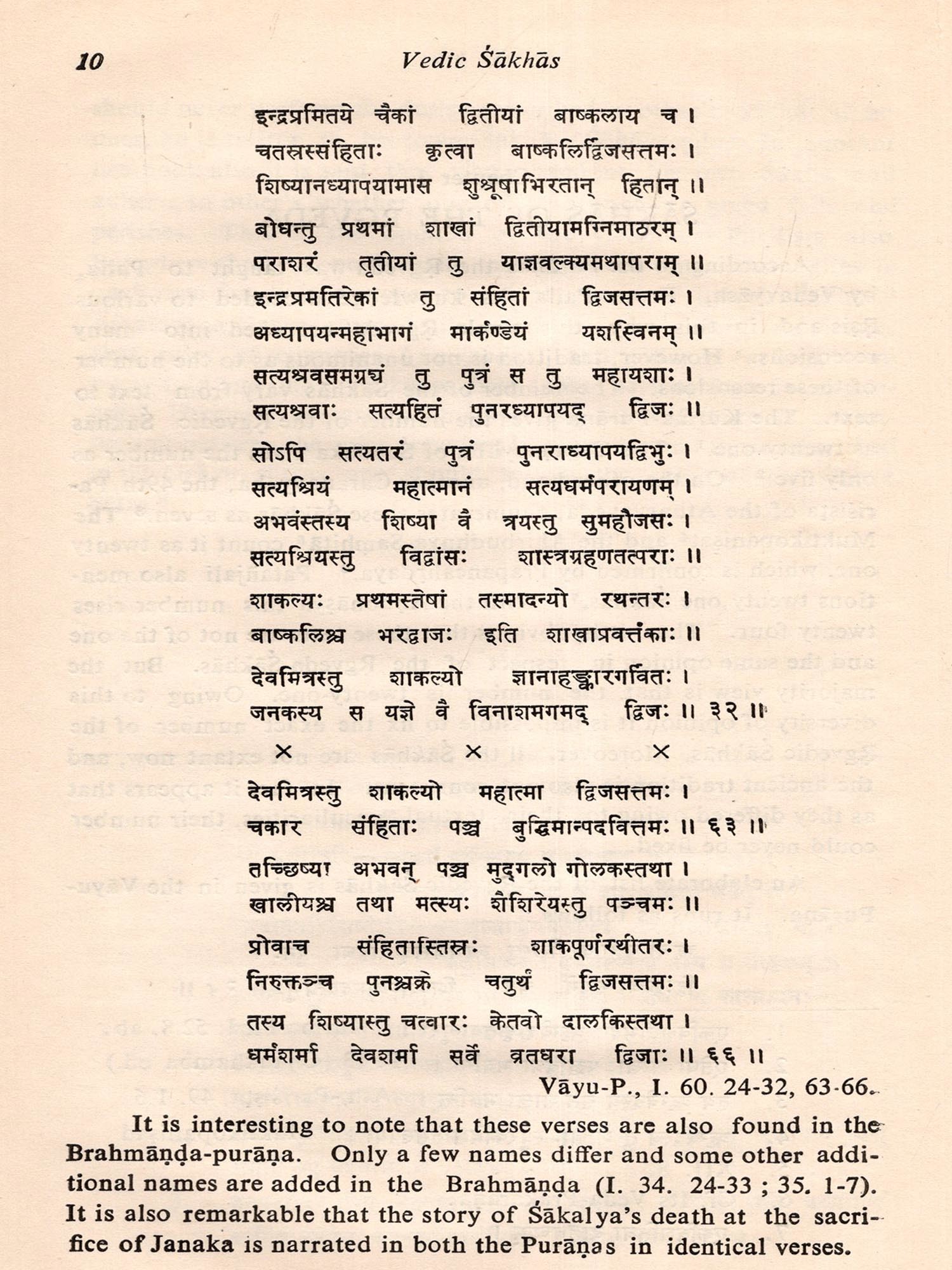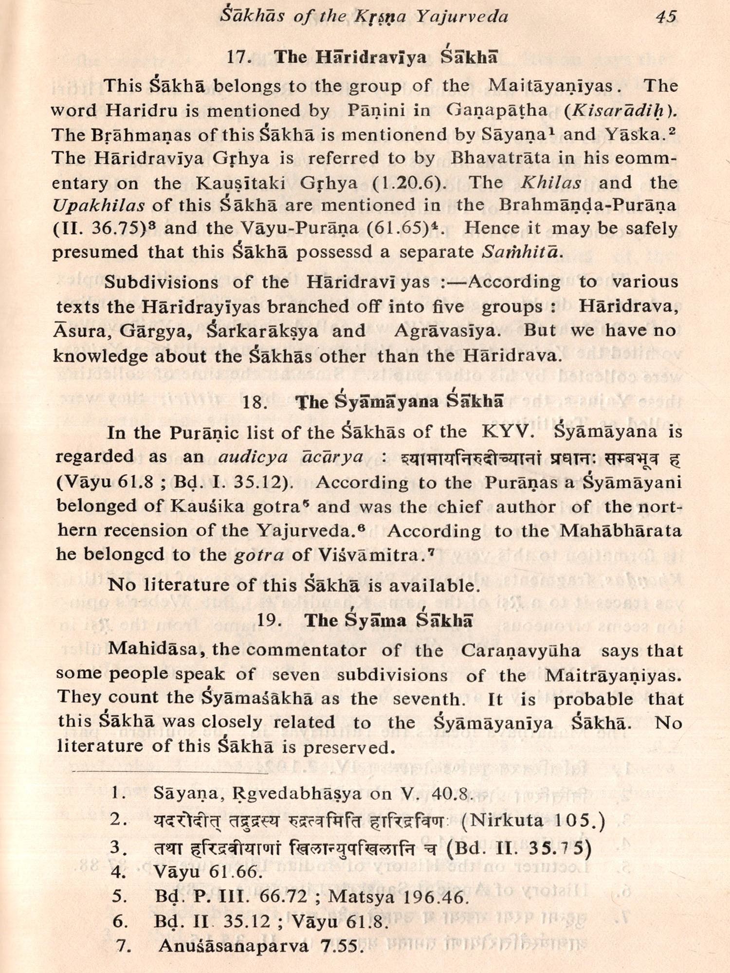 The Vedic Sakhas were of great cultural, literary and of course religious importance both in the Vedic and the post-Vedic period because they institutionalised the practice of the rituals in the group of people who owed allegiance to one of these. Each Sakha in the beginning had its own Samhita, Brahmana, Aranyaka, Upanisad and the Sutras-as that a complete set of literature was made available to the followers of the Sakha. In the course of the time much of this literature was lost and irretrievably mixed up so that now many of the original Sakhas do not even exist. However, since the lure of belonging to a special Sakha was strong many new Sakhas were introduced on the basis of particular Brahmanas and even Sutras. These Sakhas often differed from one another only in minor details of the ritualistic mode of performing the religious rites either on special occasions or in daily life. Since it is the bounden duty of an orthodox Hindu to perform his sacramental rites in accordance with the mode prescribed by his own Vedic Sakha, this lent a sort of continuity and life to these. The onslaught of time with consequent changes in life styles has caused many (or most) of these different Sakhas to survive only in name. It is here that the Puranic literature comes to our help since these often refer to the different Vedic Sakhas by their name. They sometimes also refer to the literaturc associated with these individual Sakhas most of which is now not available.