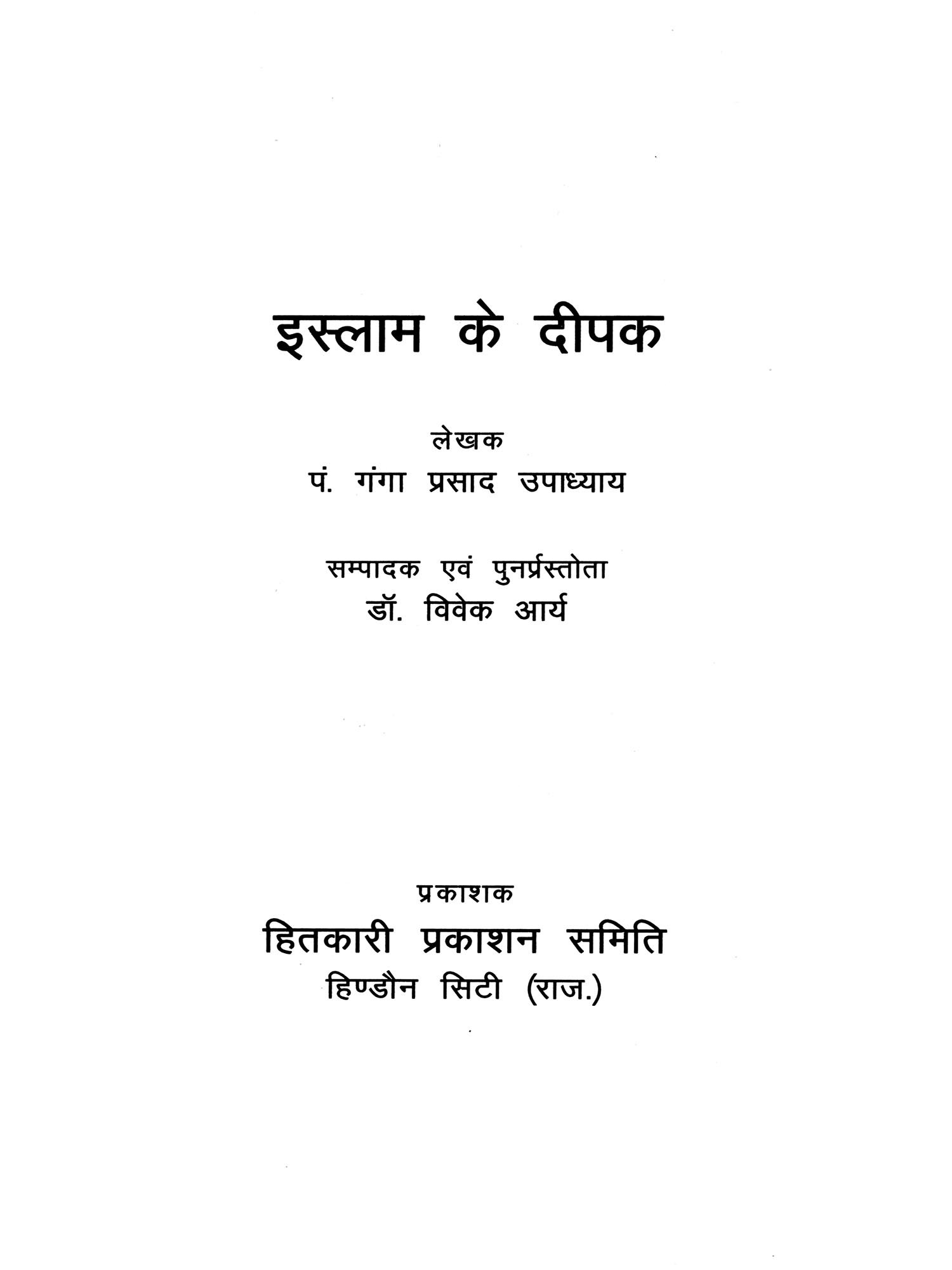 इस्लाम के दीपक पुस्तक सर्वप्रथम उर्दू में 'मसाबीहुल इस्लाम के नाम से प्रकाशित की थी। इसका कालांतर में हिंदी अनुवाद 'इस्लाम के दीपक के नाम से प्रकाशित हुआ था। इस पुस्तक के लेखक पंडित गंगा प्रसाद उपाध्याय हिंदी, अंग्रेजी, उर्दू, फारसी और संस्कृत भाषाओं के प्रकांड पंडित थे। पंडित जी का प्रिय विषय दर्शन था। वैदिक दर्शनों में उनका लेखन आस्तिकवाद, अद्वैतवाद, फिलॉसफी ऑफ दयानन्द आदि पुस्तकों से लेकर सैकड़ों लेखों के रूप में मिलता हैं। वहीं यह पुस्तक इस्लाम सम्बंधित दार्शनिक विषयों के चिंतन का परिणाम है। इस पुस्तक का प्रयोजन पंडित जी के शब्दों में पढ़िए-