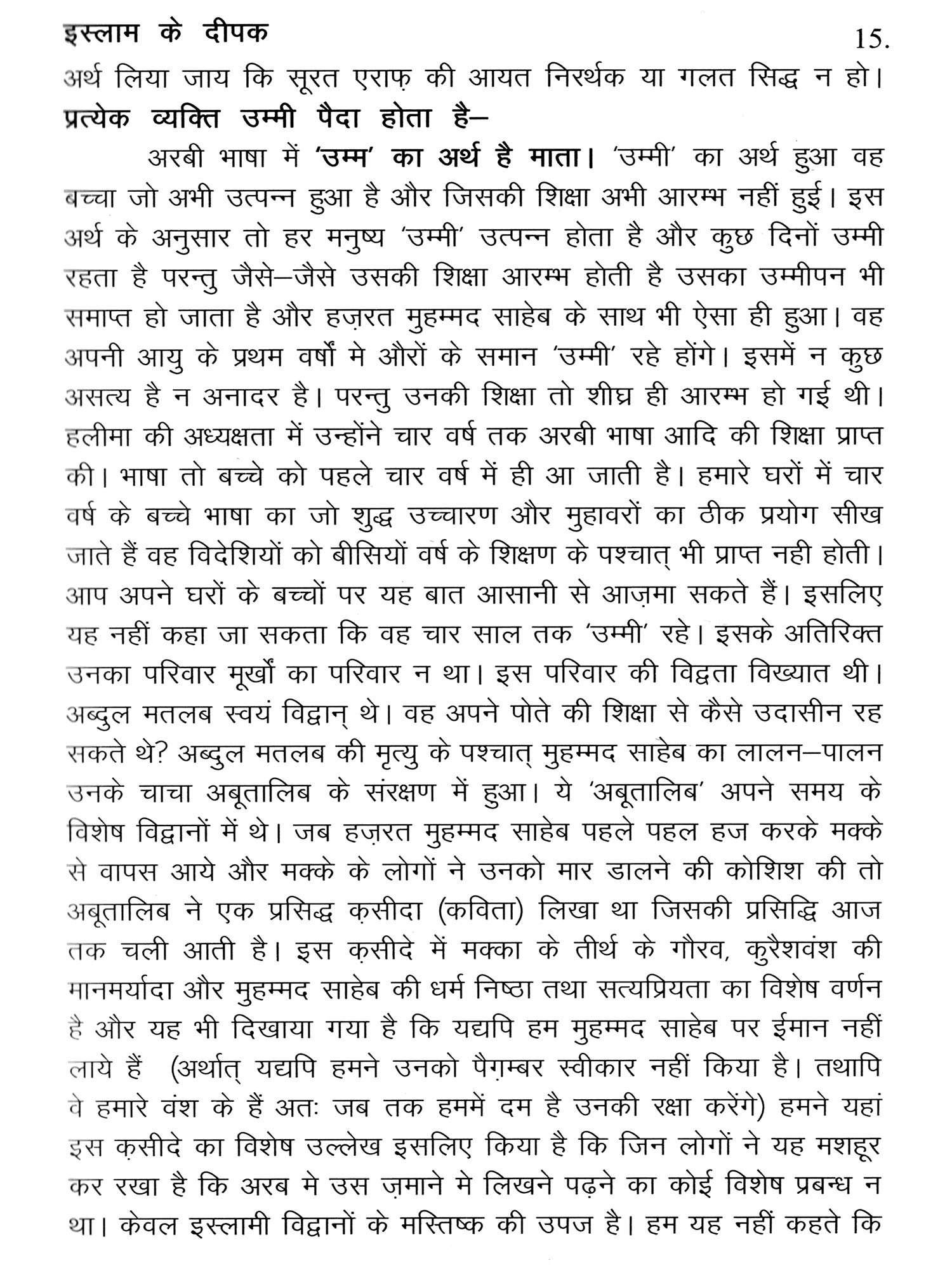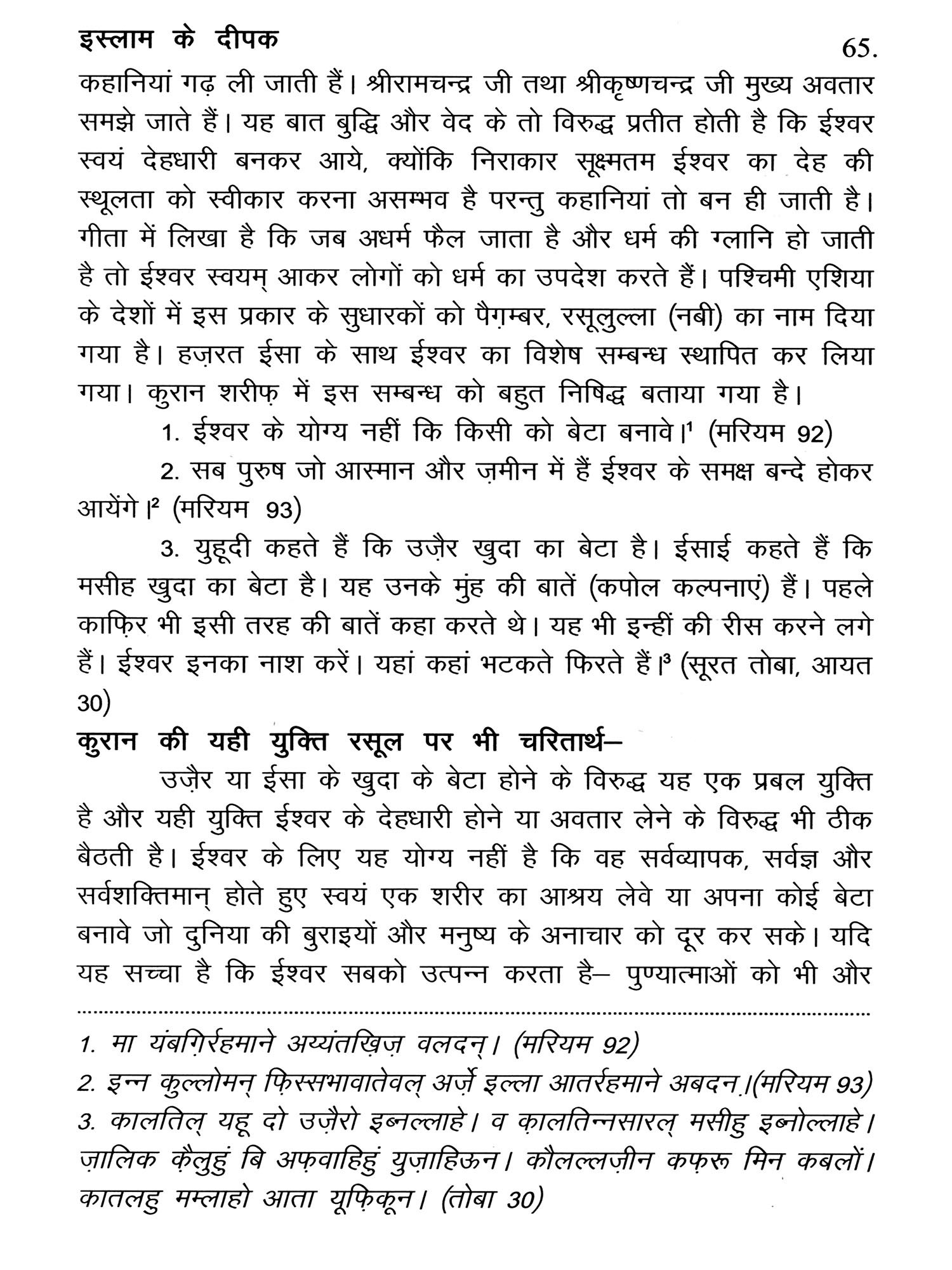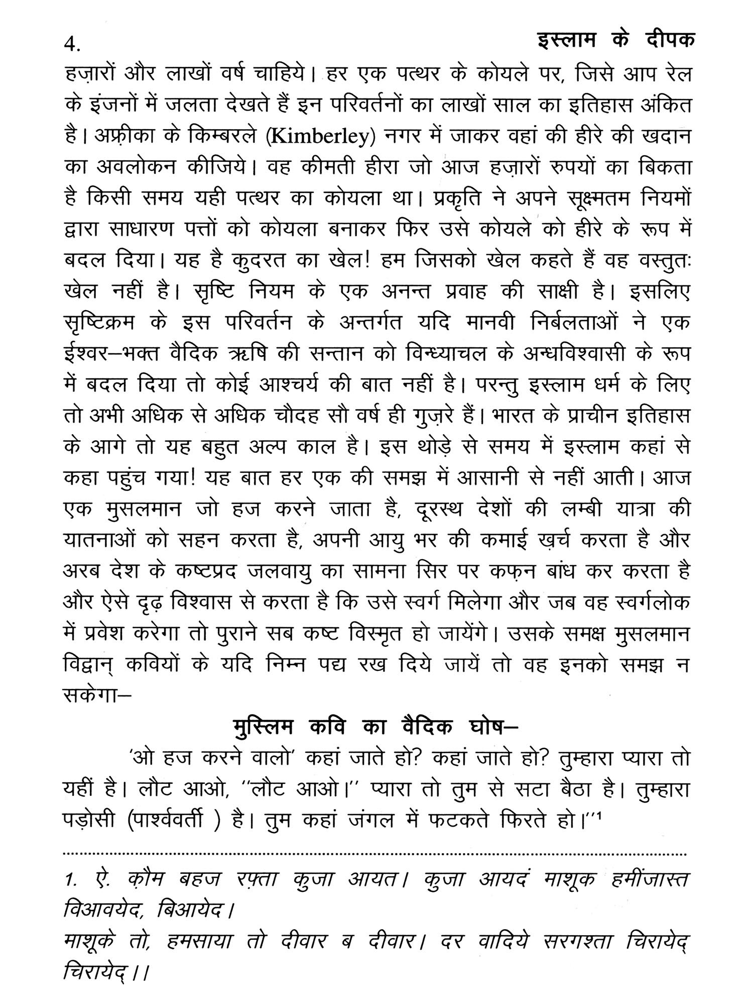 पंडित जी की पुस्तक की विशेषता यह है कि आपने इस पुस्तक के लेखन में इतनी मीठी भाषा का प्रयोग किया है कि इस्लाम को मानने वाले अनुयायी भी इस पुस्तक को पढ़ने के बाद उनकी प्रशंसा किये बिना न रह सके। गंभीर से गंभीर विषय को इतने स्पष्ट और साधारण शब्दों में पंडित जी ने प्रकाशित किया है। इस पुस्तक के अनेक संस्करण पहले कला प्रेस प्रयाग, अमर स्वामी प्रकाशन गाजियाबाद, गंगाप्रसाद उपाध्याय प्रकाशन मंदिर अबोहर, गोविंदराम हासानन्द दिल्ली से प्रकाशित हो चुके हैं। प्रस्तुत संस्करण में कुरान की पाद टिप्पणियां गोविंदराम हासानन्द दिल्ली से प्रकाशित संस्करण से ली गई हैं। हम उनके आभारी है।