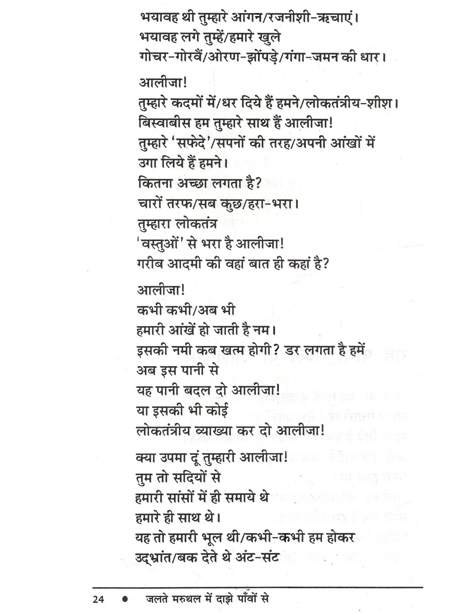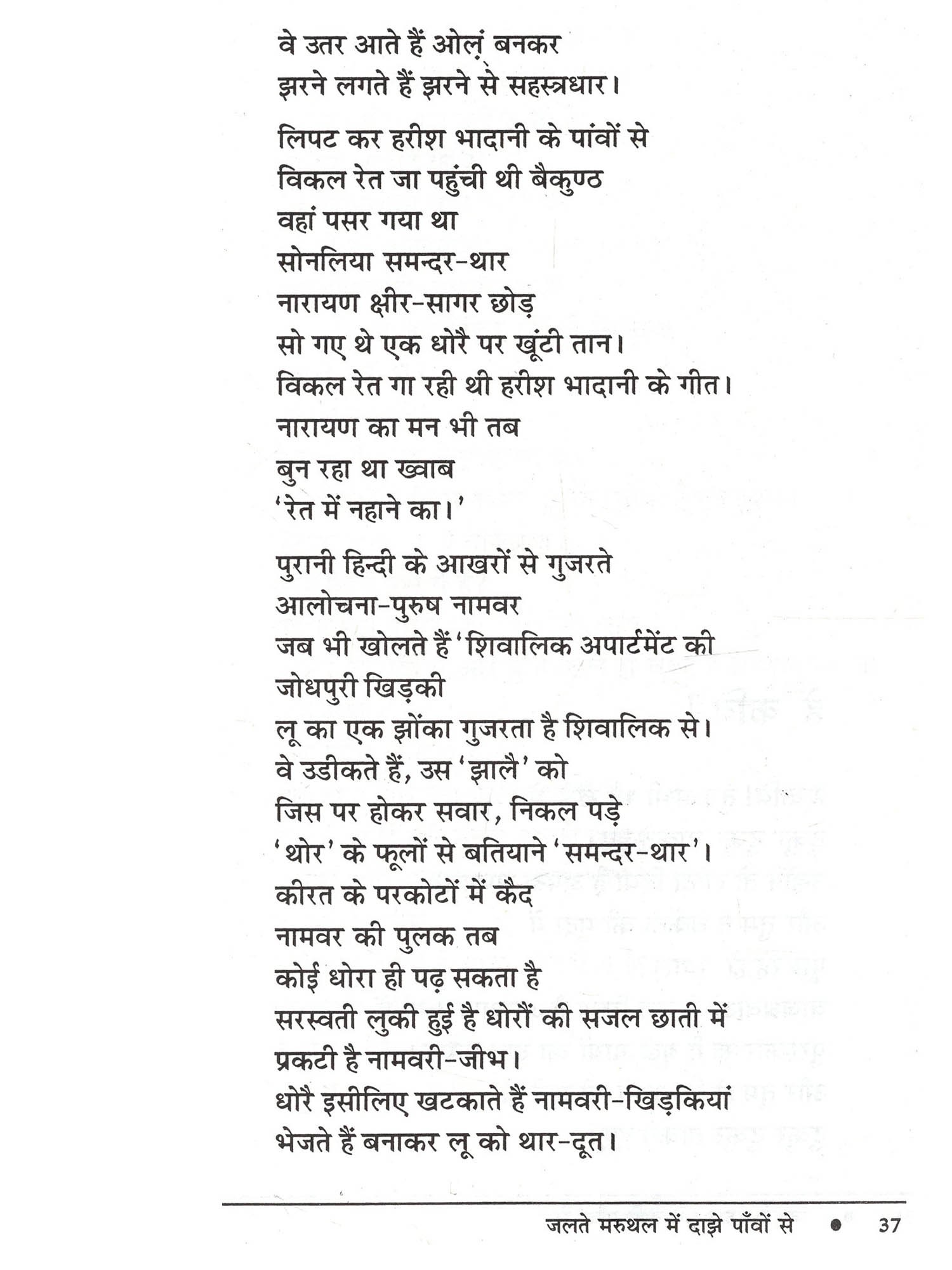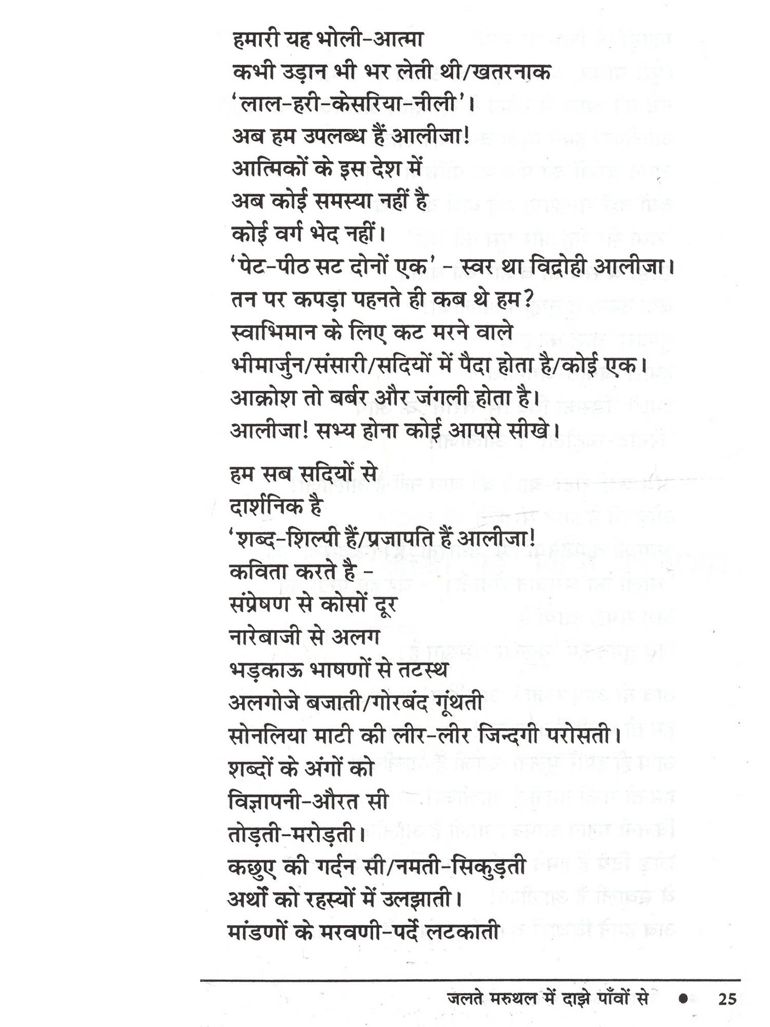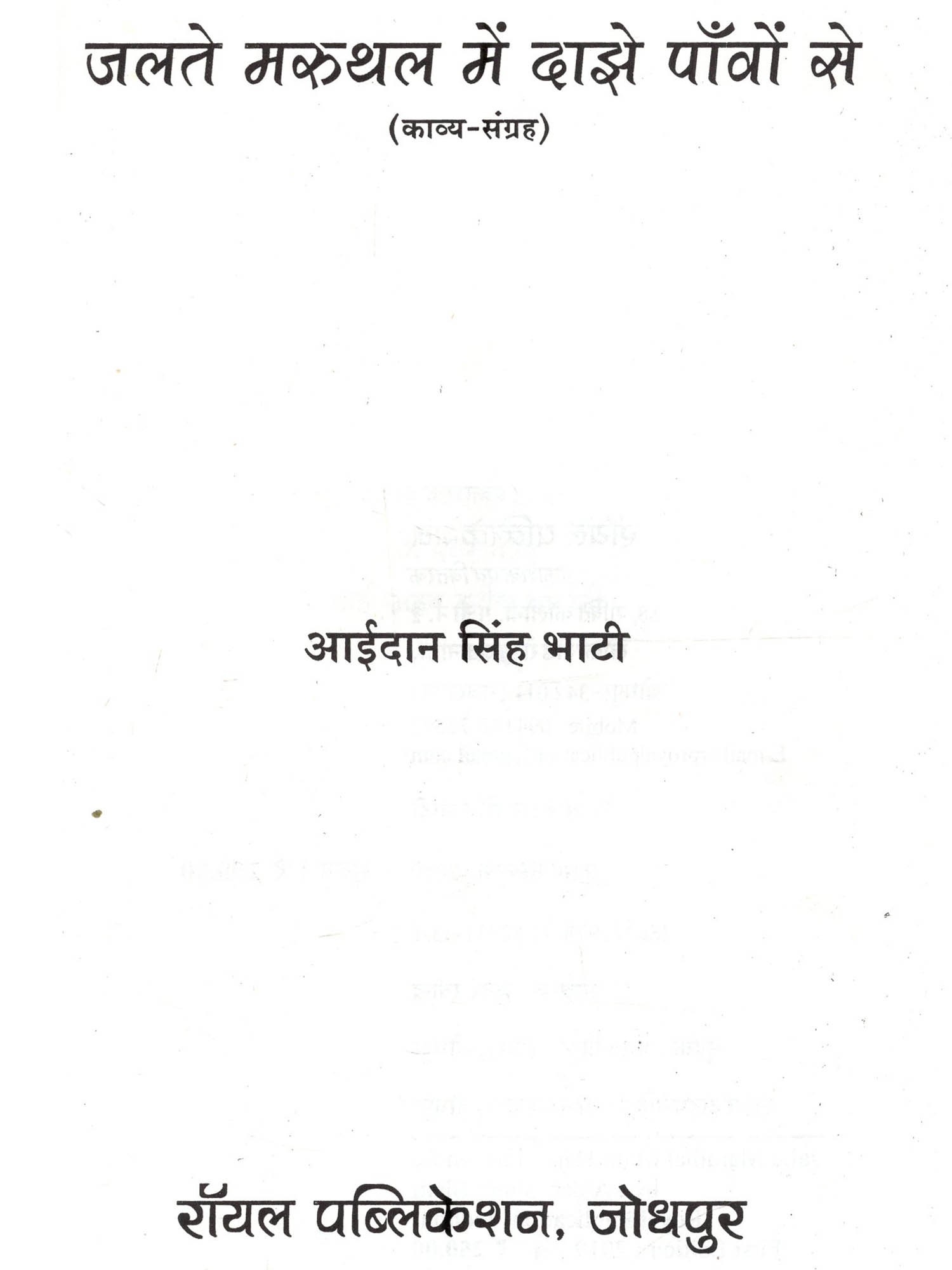 आईदानसिंह भाटी की कविताएँ अपने लोकधर्मी चरित्र के कारण अपनी निजी पहचान बनाती हैं। उनके कविता संग्रह 'आँख हींयै रा हरियल सपना' के पचमढ़ी में लोकार्पित समारोह में सुप्रसिद्ध आलोचक डॉ. नामवरसिंह जी ने मेरी इसी बात का जैसे समर्थन किया था- 'भाषा हमारी आत्मा है, हमारा हथियार है, माध्यम है, इसलिए भाषा से ही परम्परा बोध मिलता है और भाषा ही प्रतिरोध को जन्म देती है। हमारी लोक भाषाओं ने इस सम्बन्ध में महत्त्वपूर्ण कार्य किया है..... आईदानसिंह भाटी की कविताओं में मुझे लोकभाषा के इसी सार्थक व प्रतिरोधी रूप की झलक मिलती है। वे स्थानिकता परम्परा और प्रतिरोध के सौन्दर्य बोध के कवि हैं।' डॉ. भाटी की कविताएँ अपने जनवादी तेवर और देशजता के कारण अलग से पहचानी जा सकती है। स्वप्न और सच्चाई का टकराव इनकी कविताओं में पग-पग पर प्रत्यक्ष है- "मेरी कविता / खाटी खोदे / रेत उलीचे जूंणें भुगते / सुबह शाम की डांडी नापे जै जैकारों और प्रचारों की आंधी में सपने बोए रंग सावणिया।" 'जलते मरुथल में दाझे पाँवों से' की कविताओं में कवि ने वैश्वीकरण और बाजारवाद के विरुद्ध स्थानीयता और आंचलिकता को खड़ा किया है। पूँजी और तकनीक के दो पाटों के बीच पिसते मनुष्य को बचाना ही इन कविताओं का मुख्य सरोकार है। ऐसे कठिन समय में जबकि कविता लिखना एक मुश्किल काम है