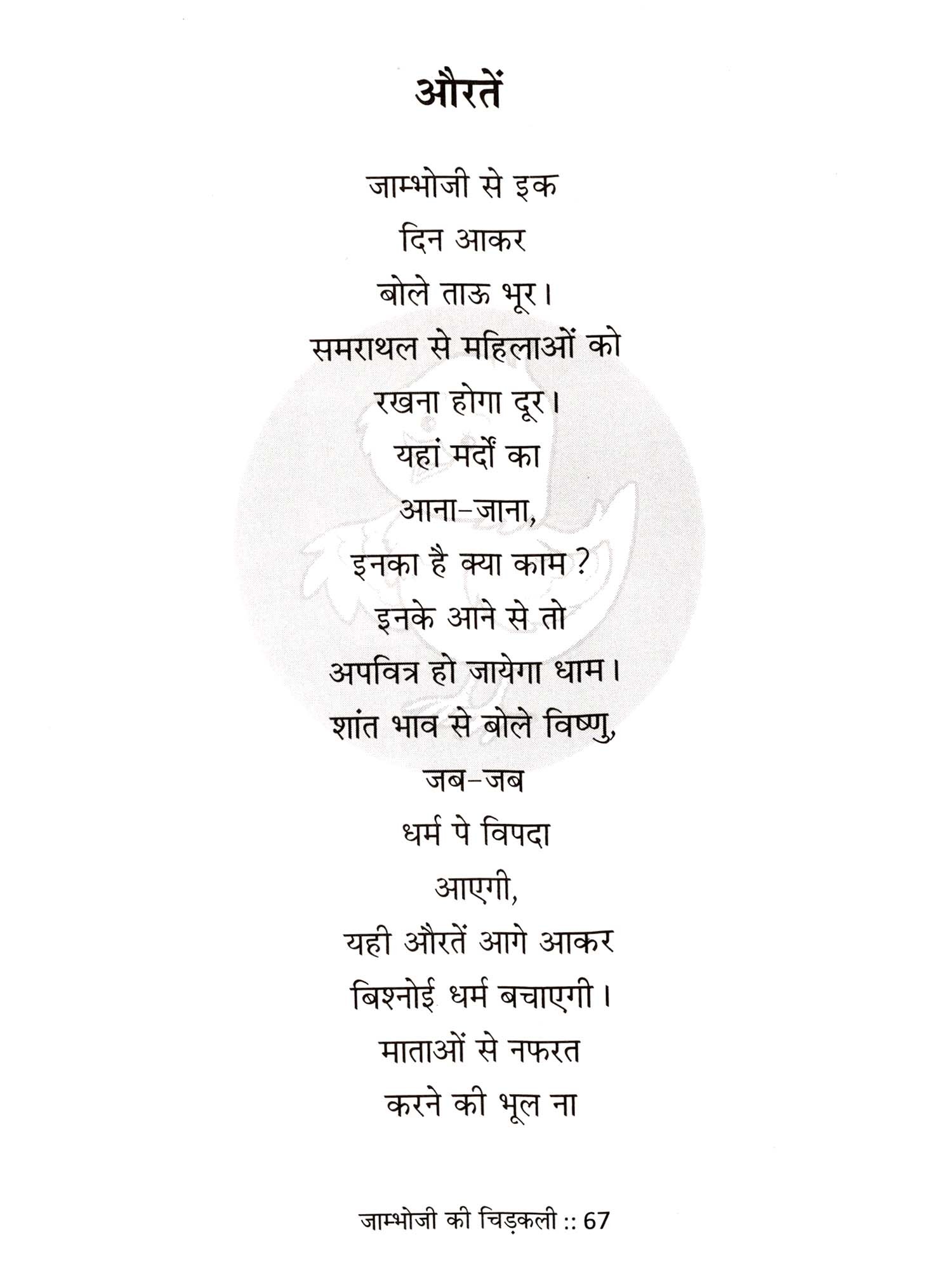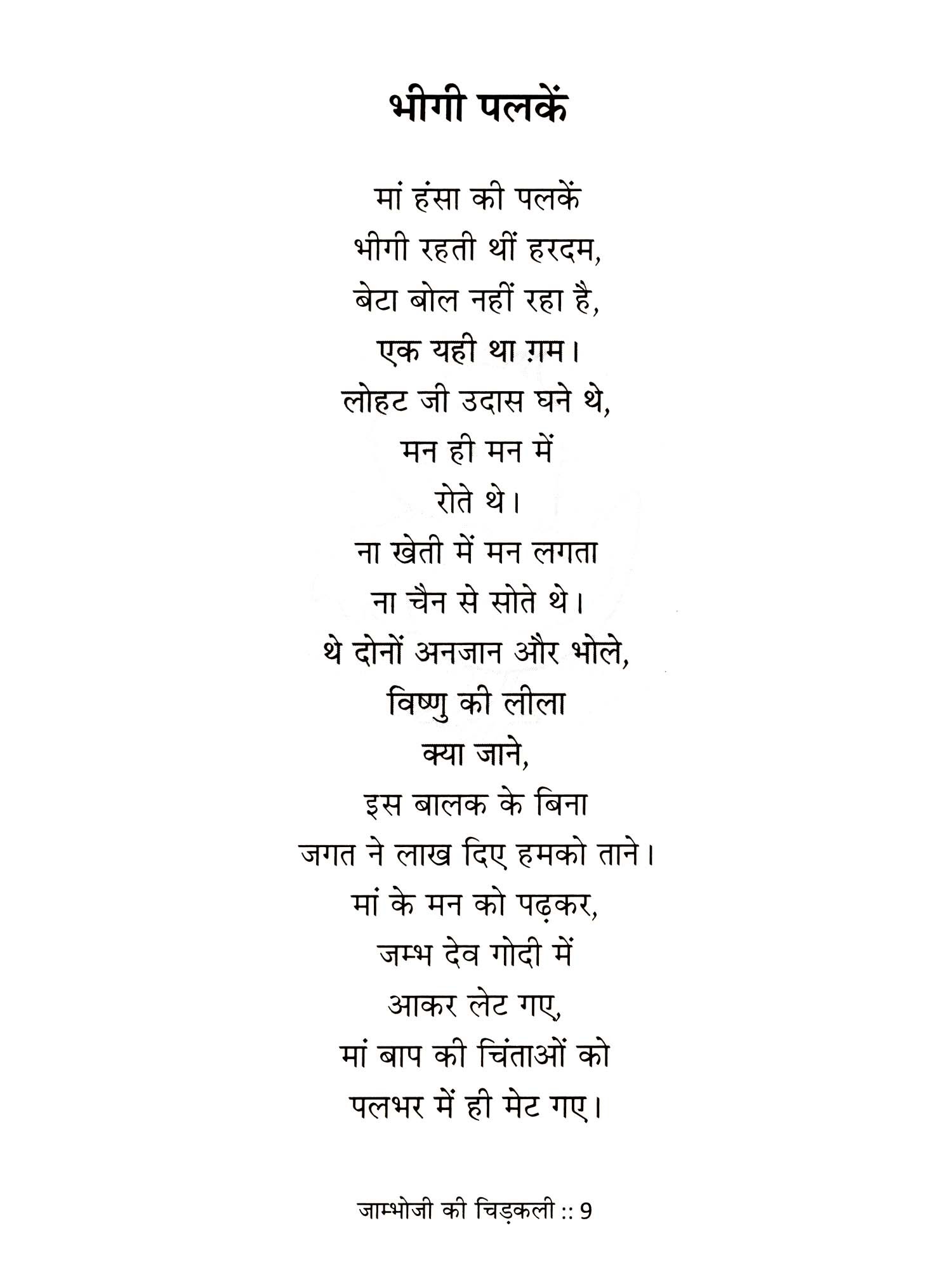 जाम्भाणी साहित्य जितना समृद्ध है उतना ही कालजयी भी, मानवीय मूल्यों के लिए जो शंखनाद समराथल से हुआ था उसी परम्परा को हमारे संतों, कवियों, चिंतकों, शहीदों ने सदैव अक्षुण बनाए रखा है। 'जाम्भोजी की चिड़कली' बाल-कविता संग्रह, सम्पर्क और सूचना क्रांति के दौर में कुछ पल ऐसे तलाश करने की कोशिश करता है, जहां जीवन में हरापन नजर आए। आज का बालक कहीं अधिक सजग विश्व में रह रहा है। जहां फुरसत के क्षण सूचनाओं के हड़कम्प में दब गए हैं। इन परिस्थितियों में केवल खिलौनों का स्वरूप ही नहीं बदला, भाषा व शब्दों की परिपाटी भी बदल गई है। बच्चों ने खुद अपनी भाषा विकसित करनी शुरू कर दी है। इसे स्वीकार करने से बिल्कुल भी परहेज इस संग्रह में नहीं किया गया है। जाम्भोजी के जीवन की घटनाओं और उनके बाद जाम्भाणी जीवन मूल्यों के संघर्ष को ये कविताएं रेखांकित करती हैं। उनतीस नियमों की दृढ़ता और विरोधाभासी जीवन शैली के साथ-साथ मानवीय प्रवृत्तियों, छलनाओं, संवेदनाओं, वर्जनाओं, उपदेशों, अंदेशों को कविताओं का विषय बनाया गया है। प्रकृति व जीव-जन्तुओं के लिए बलिदान देने की गौरवशाली परम्परा को भी स्थान दिया गया है। इतनी महान जीवन शैली और आध्यात्मिक परम्परा को कह पाने में खुद को मैंने बहुत छोटा पाया। अनायास हुई भूलों को सुझावों के साथ स्वीकारने को मैं सदैव तत्पर रहूंगा।