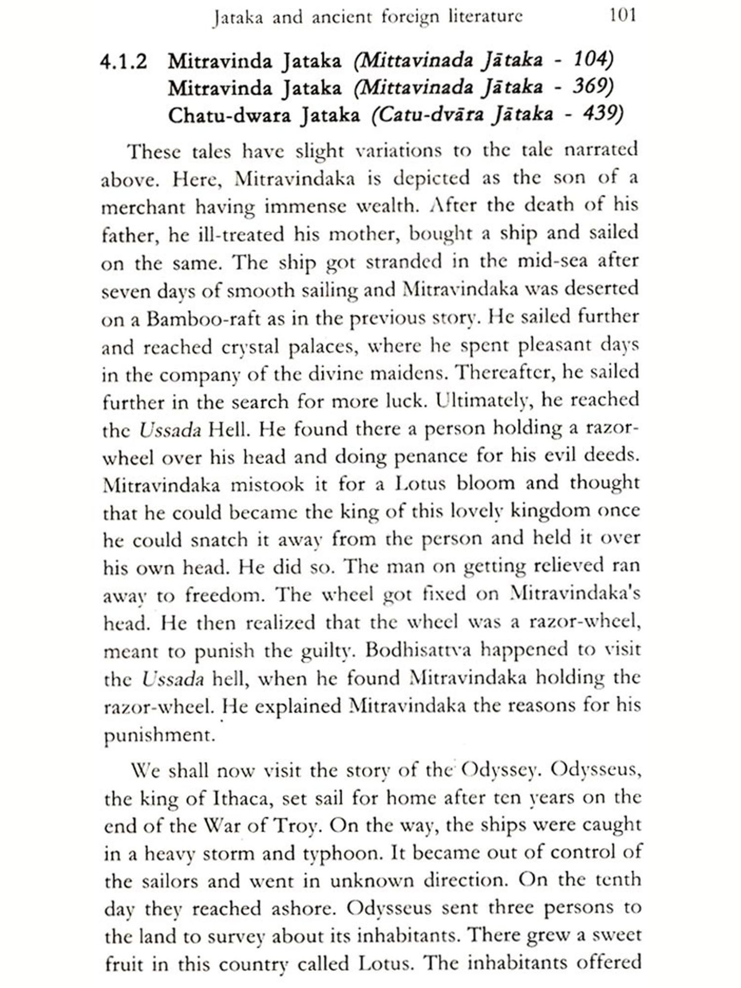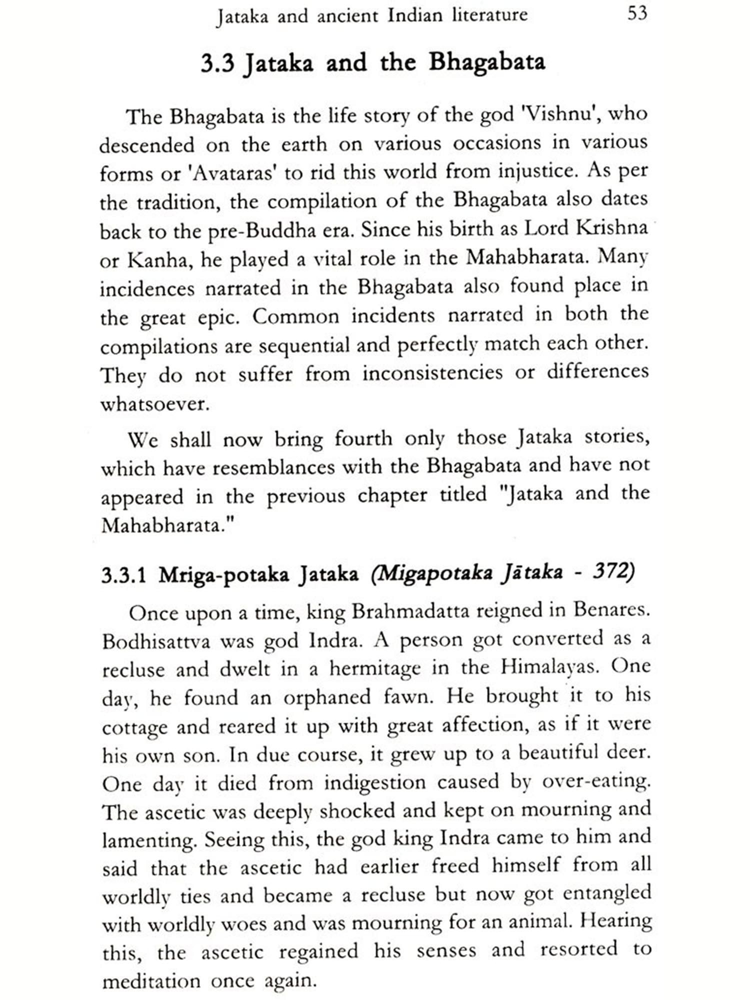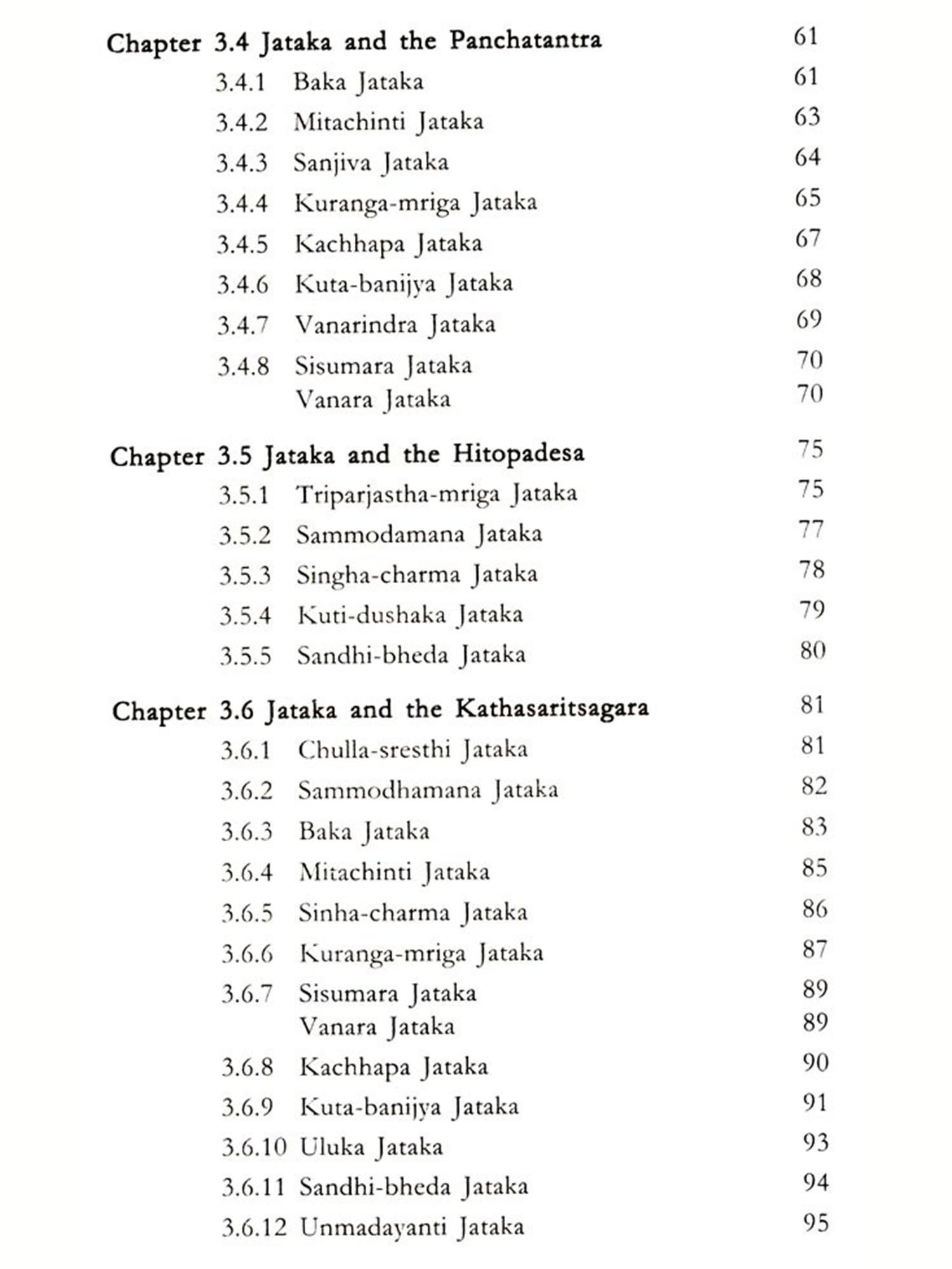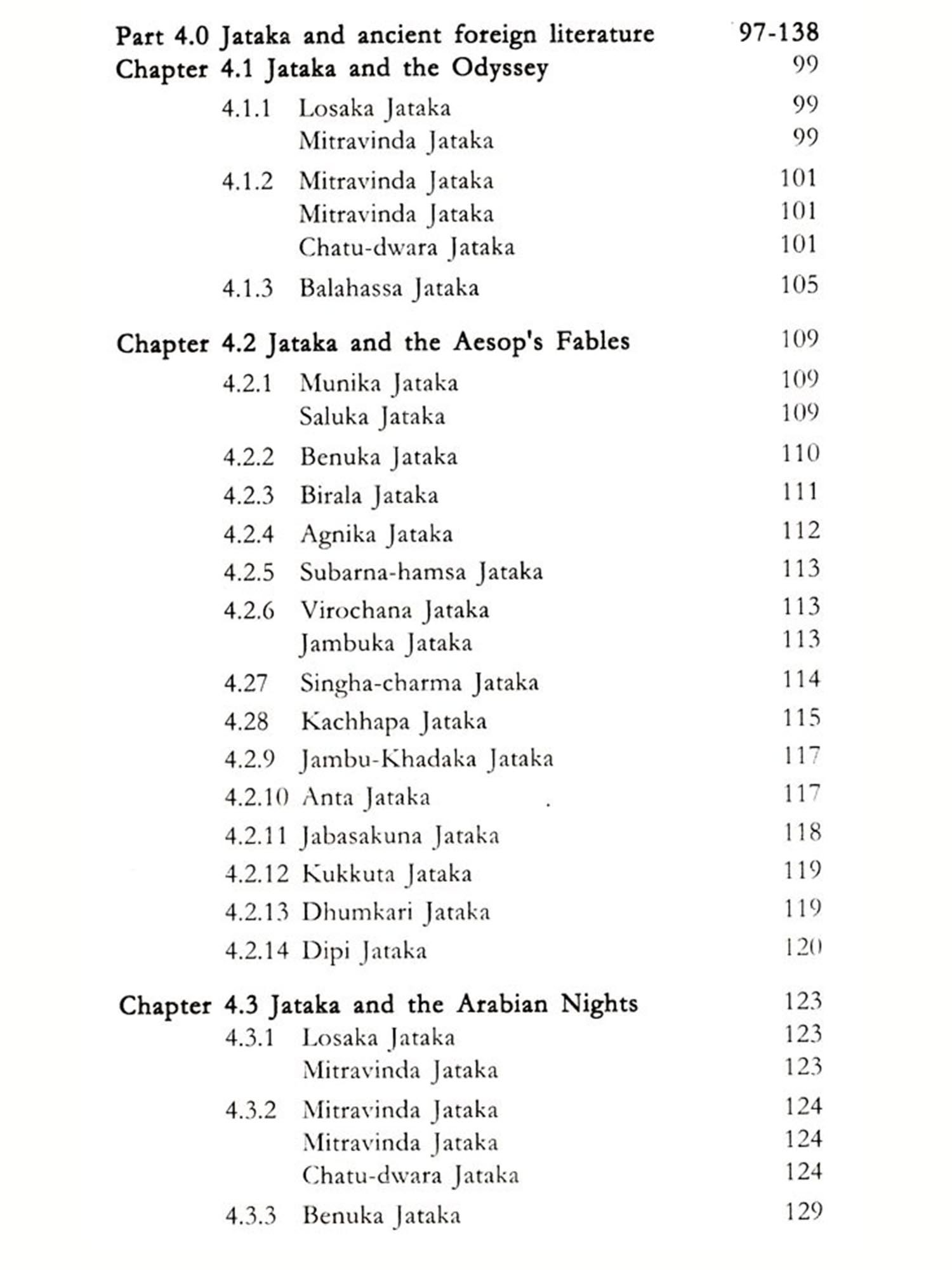 This interesting phenomenon attracted me to study the important compilations of indigenous as well as foreign origins. Since it is an endless subject in itself, a borderline had to be drawn carefully so that the study could be focussed on the relevant areas meaningfully. Accordingly, three each of pre and post Buddha indigenous compilations namely; the Ramayana, the Mahabharata, the Bhagabata, the Panchatantra, the Hitopadesa and the Kathasaritsagara were selected and studied. To ascertain the Jataka's relationship with the foreign literatures, three famous compilations, relating to the previous, contemporary and later periods have also been analysed. These are the Odyssey, the Aesop's Fables and the Arabian Nights.