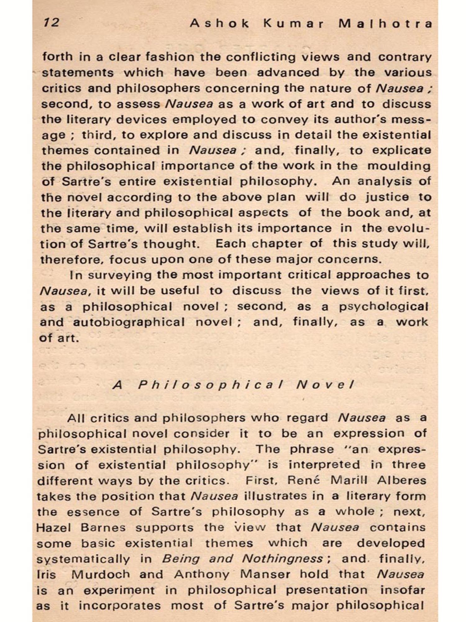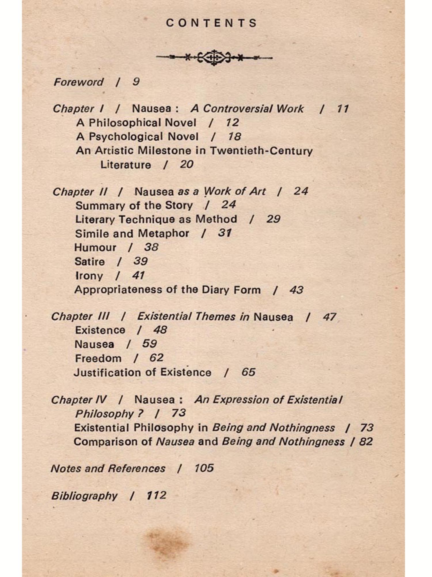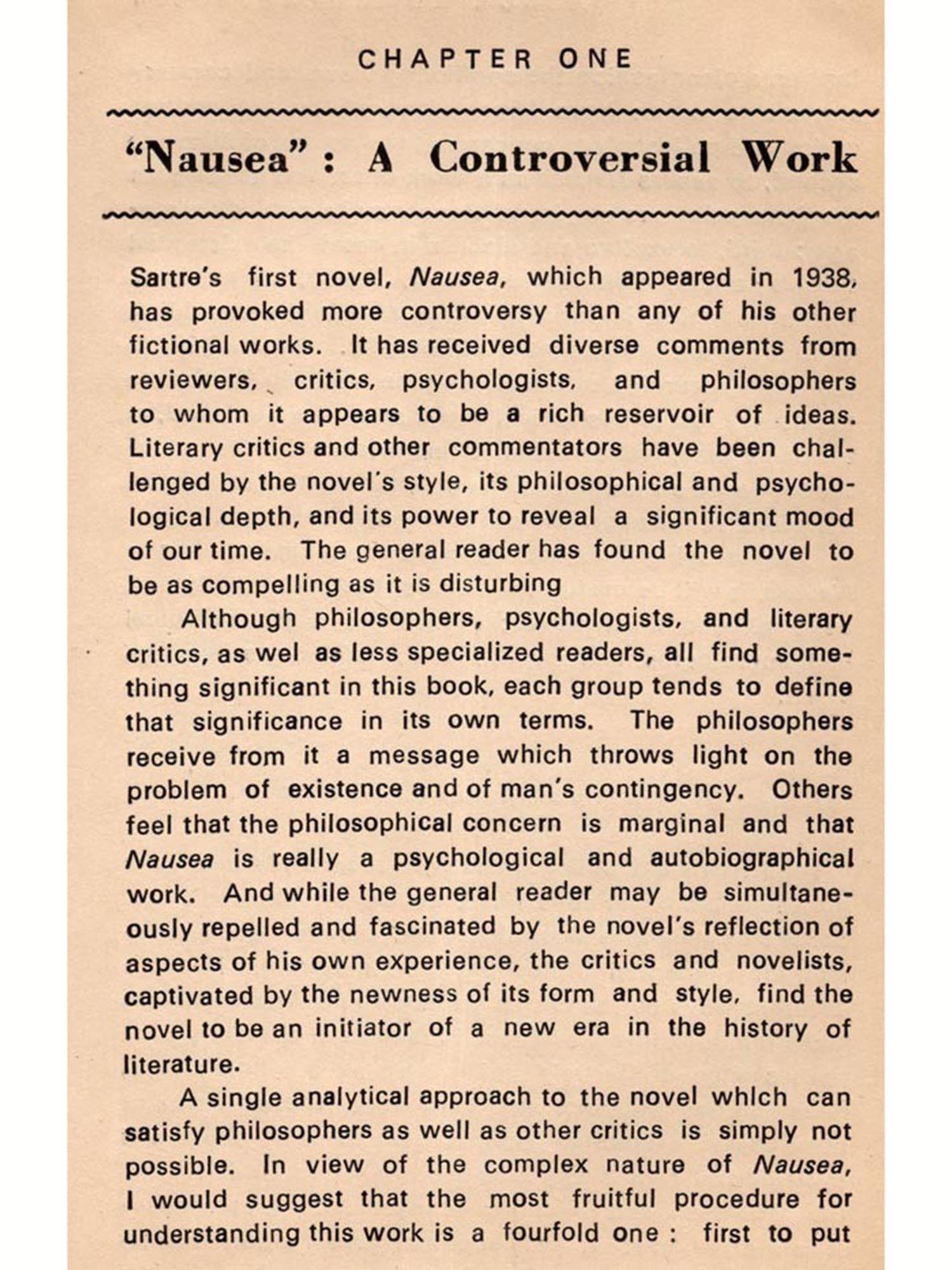 The book is directed to the grassroots course in Sartre's brand of existential philosophy. My experience in teaching introductory courses in philosophy has convinced me that the philosophy of Sartre can be best introduced to students through Nausea which is replete with existential themes. It is easier for the beginner to identify himself with Roquentin and his use of the pheno-menological method in Nausea than with Sartre and his abstract and vague descriptions of this method in Being and Nothingness. The ideal of philosophy as a presup-positionless discipline is also best conveyed through the character and experiences of Roquentin who by living his universal doubt reveals existence in its immediacy.