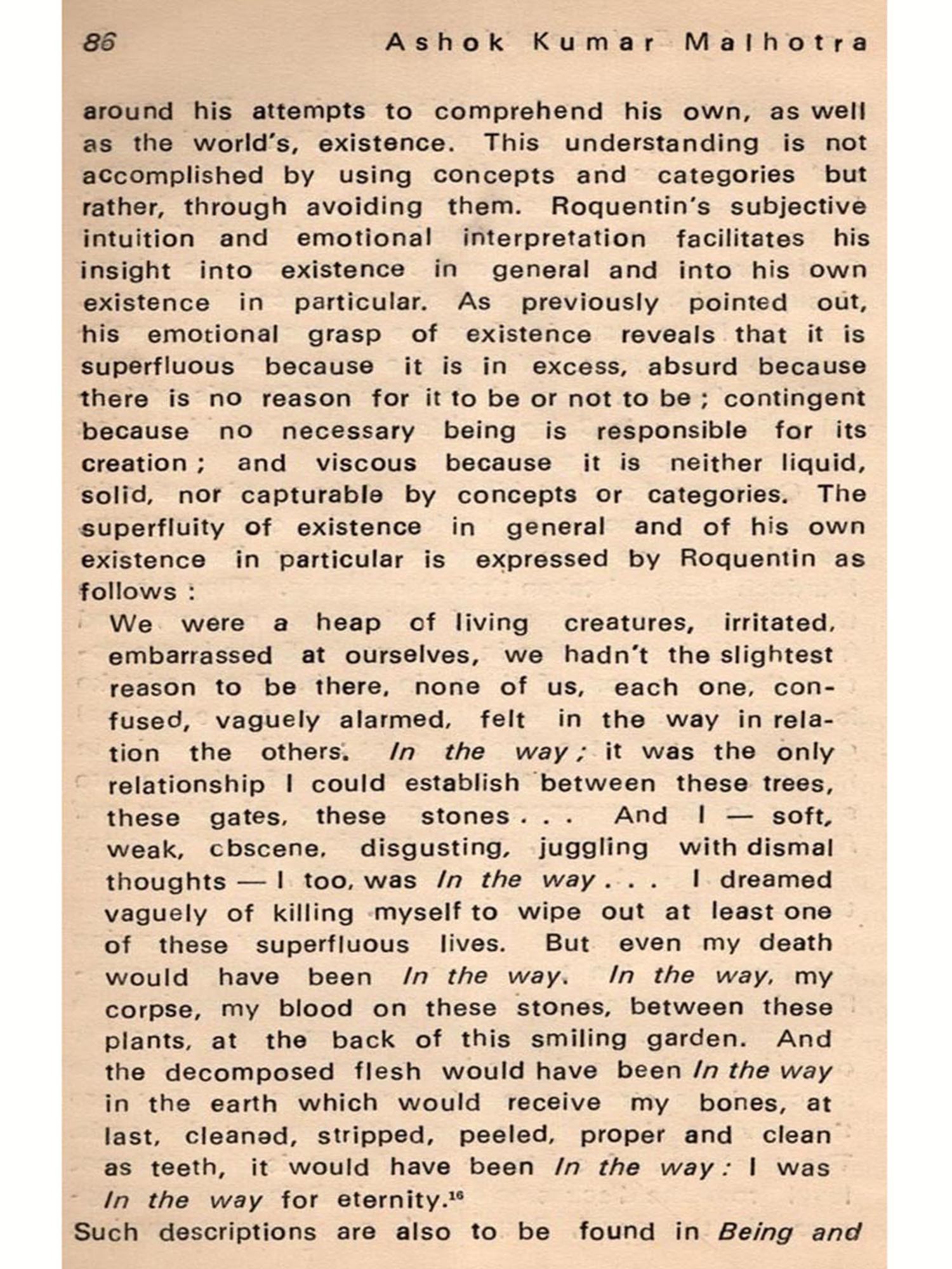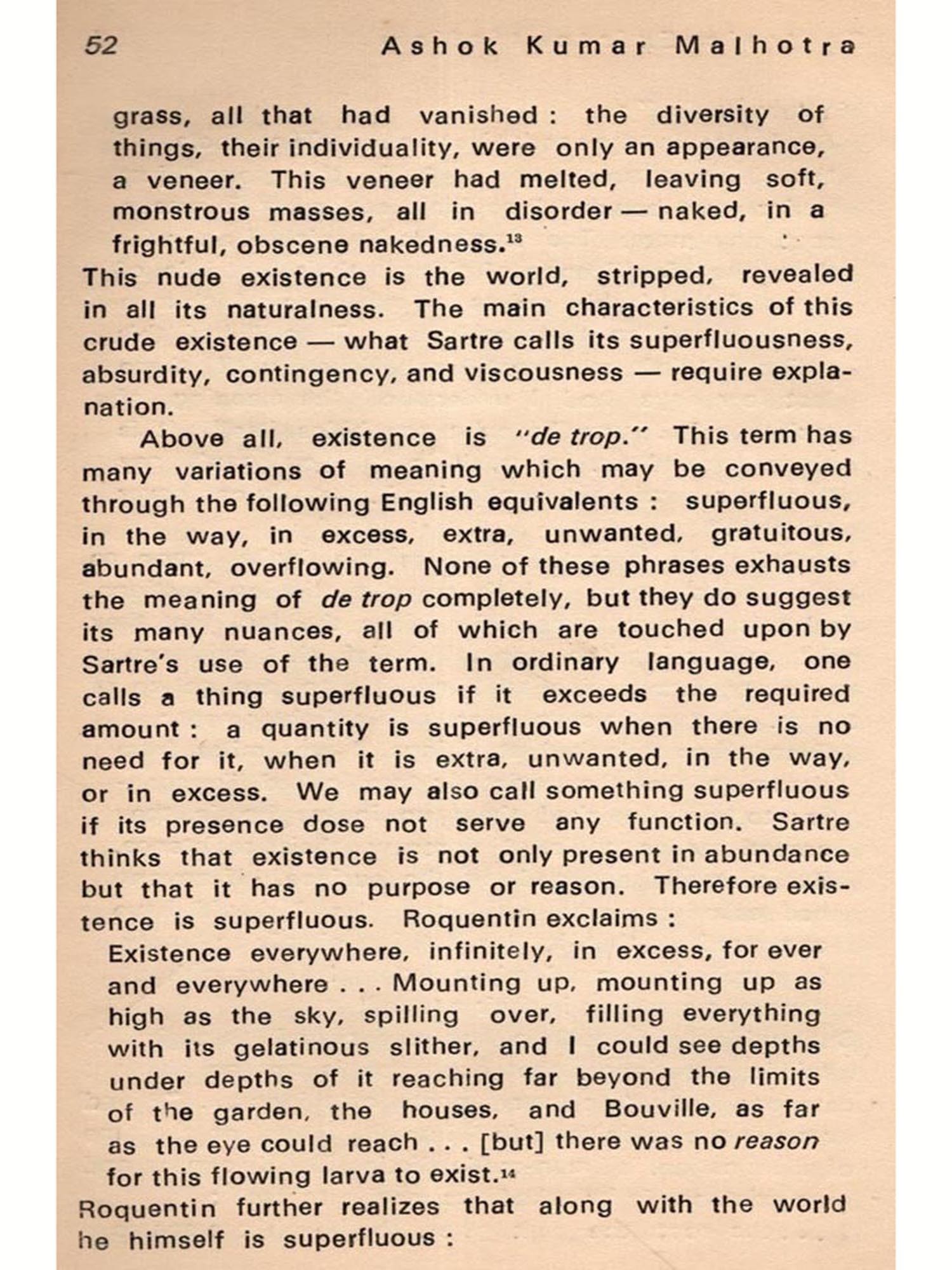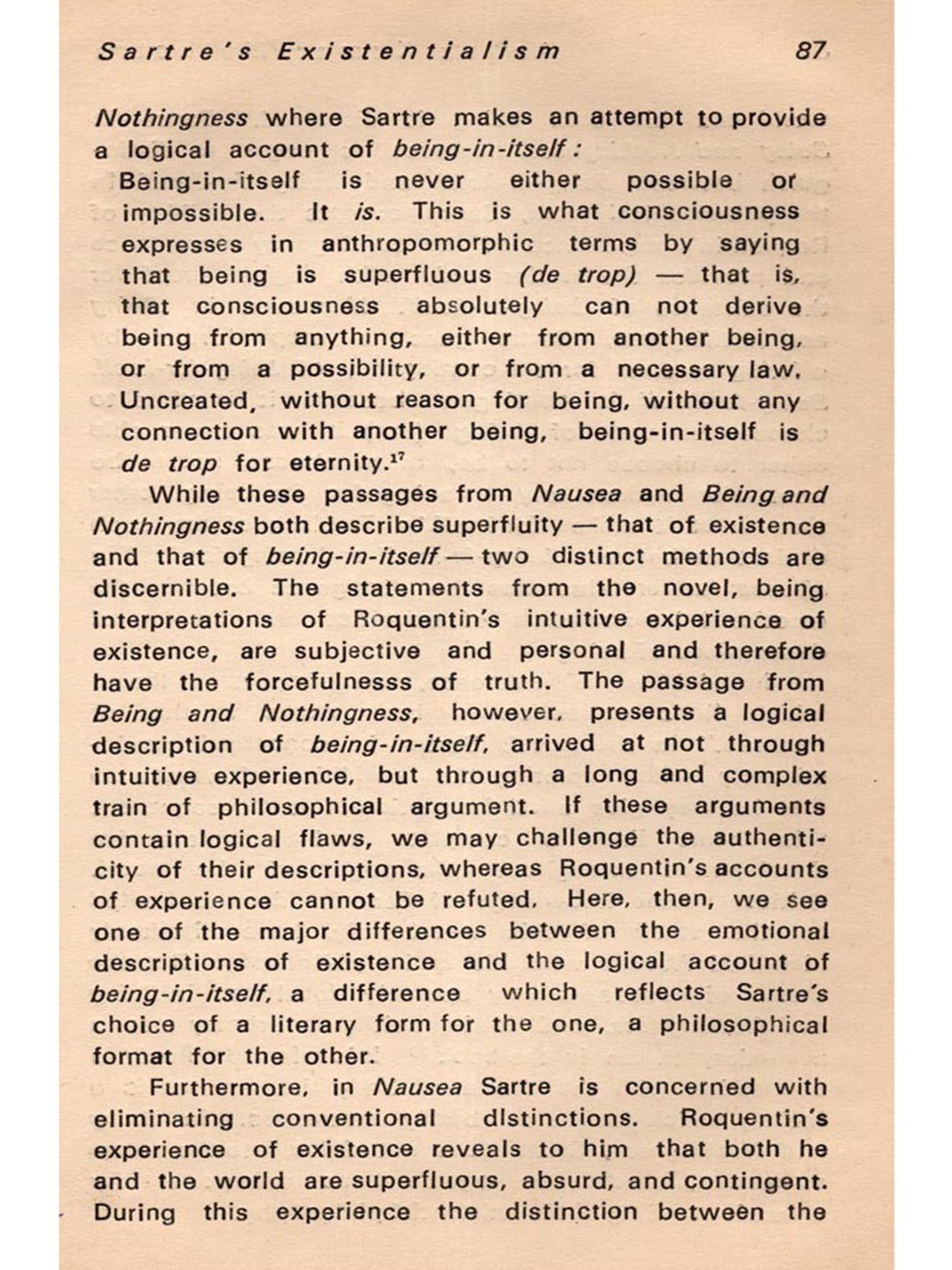 The book does not claim to be a substitute for Sartre's popular novel Nausea or his philosophical work Being and Nothingness. However, it can be treated as a companion volume which by simplifying the complex phraseology can be a handy guide for comprehending the above two works.