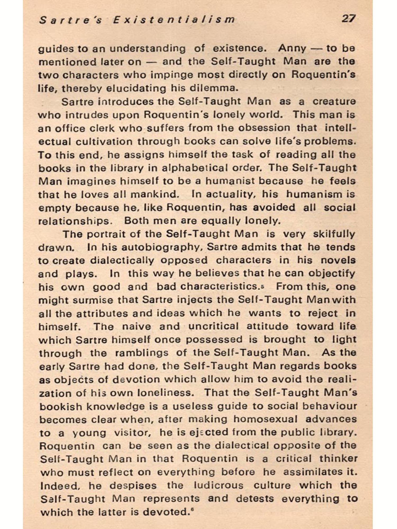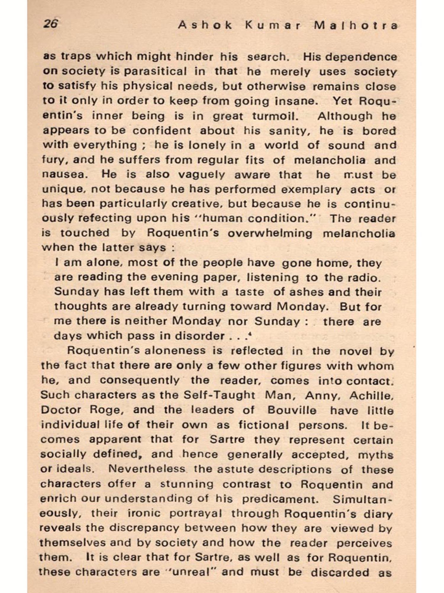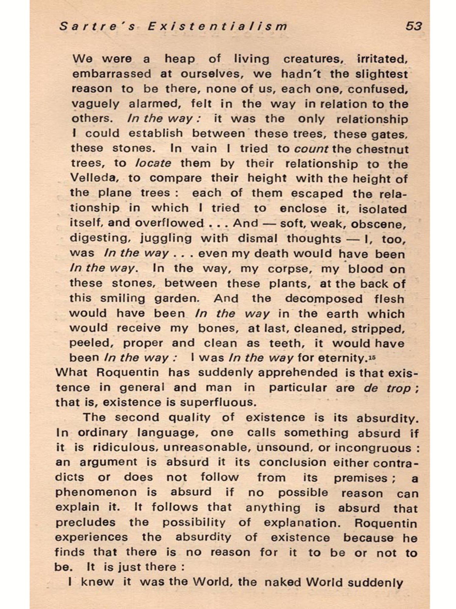The book does not claim to be a substitute for Sartre's popular novel Nausea or his philosophical work Being and Nothingness. However, it can be treated as a companion volume which by simplifying the complex phraseology can be a handy guide for comprehending the above two works.