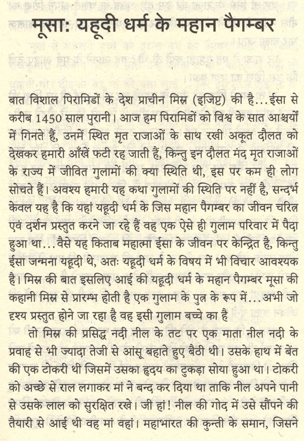 ईसा के इस जीवन और दर्शन की चर्चा के पूर्व उन परिस्थितियों का वर्णन भी आवश्यक है जिसमें ईसा पैदा हुए थे। उल्लेखनीय है कि ईसा जन्मना यहूदी थे। बाइबिल के पुराने नियम में यहूदी धर्म की उत्पत्ति तथा यहूदी जाति के इतिहास की विस्तार से कथा है। यहूदी धर्म की वास्तविक कथा प्रारम्भ होती है मूसा से, जिन्होंने मिस्र देश में गुलामी का जीवन जी रहे अपने इजराइली बन्धुओं को ईश्वर के निर्देशन में एक नए देश, इजराइल, पहुंचाया था। इस यात्रा के दौरान ही उन्हें स्वयं ईश्वर से दशादेश (दस आदेश) प्राप्त हुए जो यहूदी धर्म के मुख्य नियम हैं। उल्लेखनीय है कि ईसा उस दाऊद के वंश के थे जिसने यहूदी जाति को एक नई ऊंचाई तक पहुंचाया था। इसी वंश में महान प्रज्ञावान राजा सालोमन भी हुआ था जिसकी सूक्तियों ने यहूदी धर्म को नैतिकता का श्रेष्ठ पाठ पढ़ाया था और फिर वे अनेकानेक नबी भी ईश्वर ने यहूदियों को दिए थे जिन्होंने यहूदियों को धर्म के प्रति बराबर जागरूक किया था। इन्होंने यह भविष्यवाणी भी की थी कि दाऊद के वंश में एक ऐसा मसीहा पैदा होगा जो यहूदियों को तमाम कष्टों से मुक्ति दिलाएगा, जो उनके लिए अपने आप का बलिदान कर देगा। किन्तु लम्बे समय तक राजनीतिक गुलामी में फंसे यहूदी, जिन्हें अभिमान था कि वे ईश्वर की सर्वश्रेष्ठ सन्तान है, ईसा को स्वीकार नहीं कर पाए... उनके आध्यात्मिक राज्य को नहीं समझ पाए और उन्होंने बजाय सिंहासन पर बैठाने के, उन्हें सलीब पर लटकाया, सोने के मुकुट की जगह उन्हें कांटों का ताज पहनाया। यहूदी धर्म का यह परिचय हमने इस किताब में थोड़े विस्तार से प्रथम अध्याय ईसा के पूर्व में दिया है।