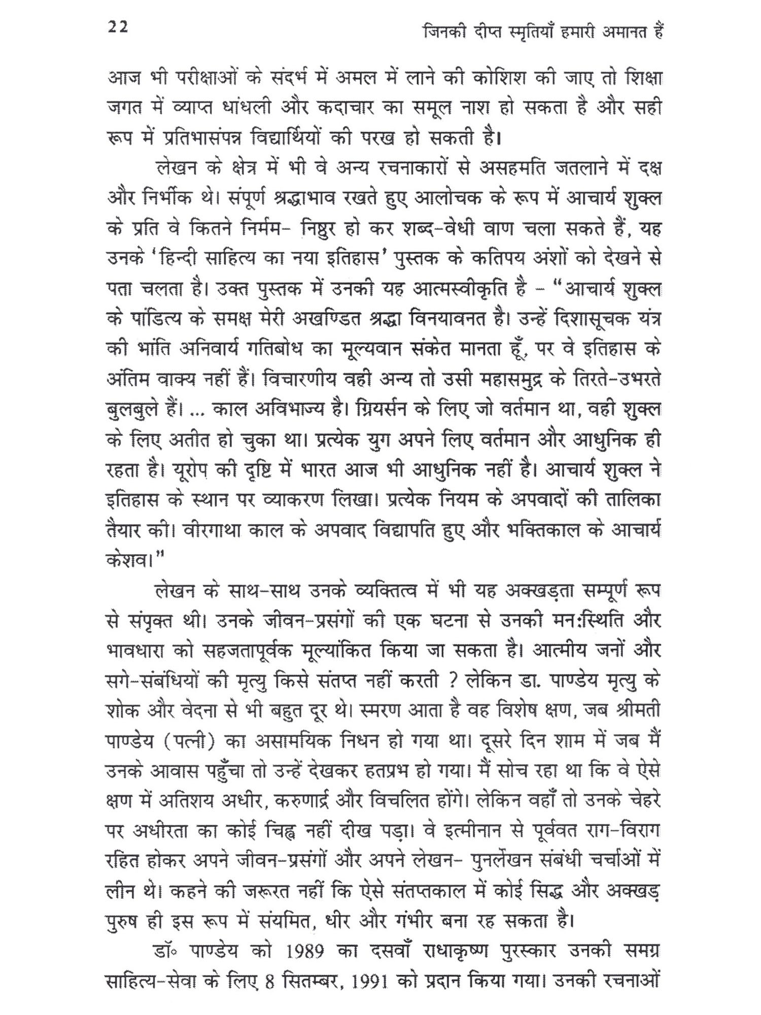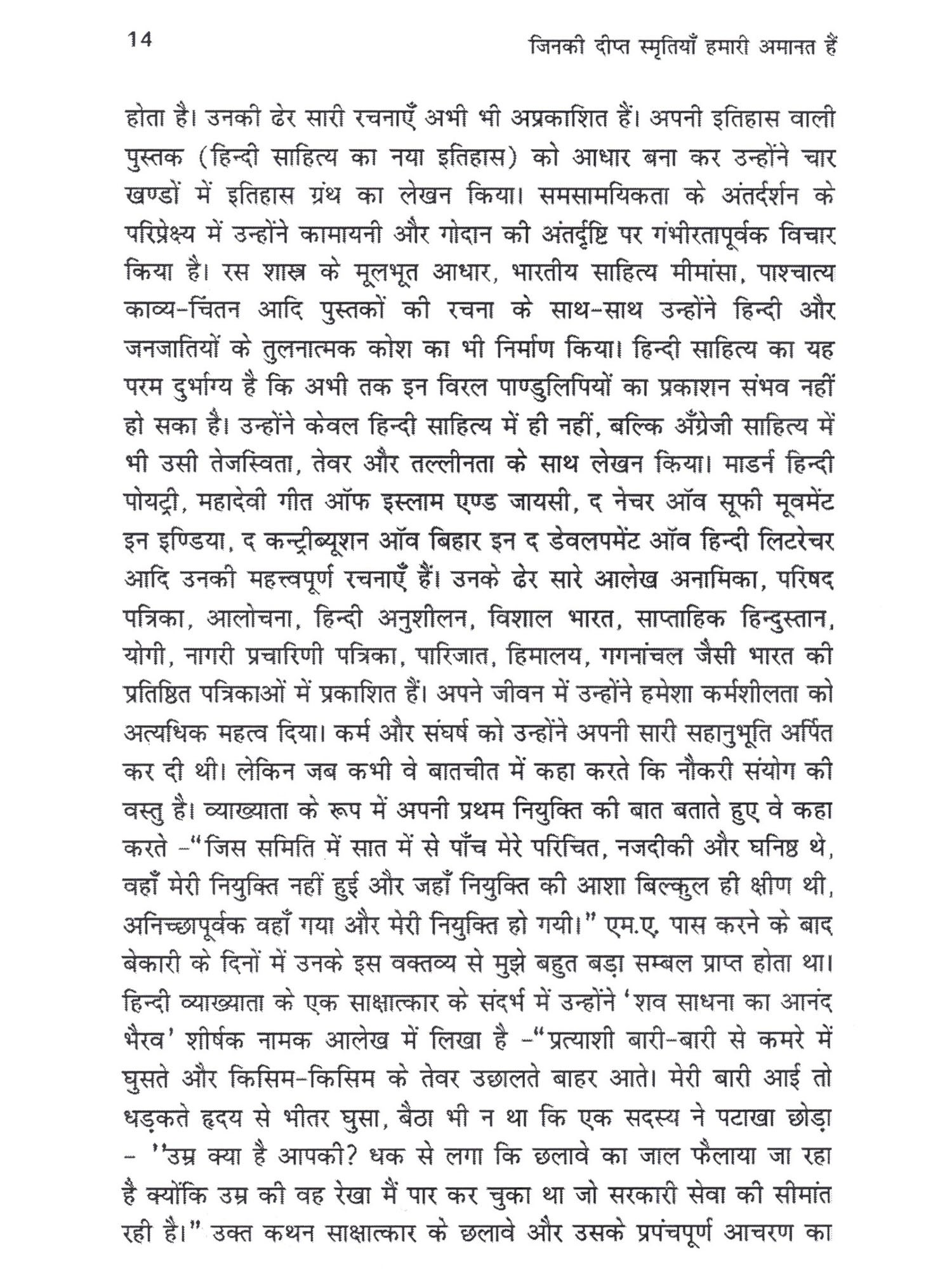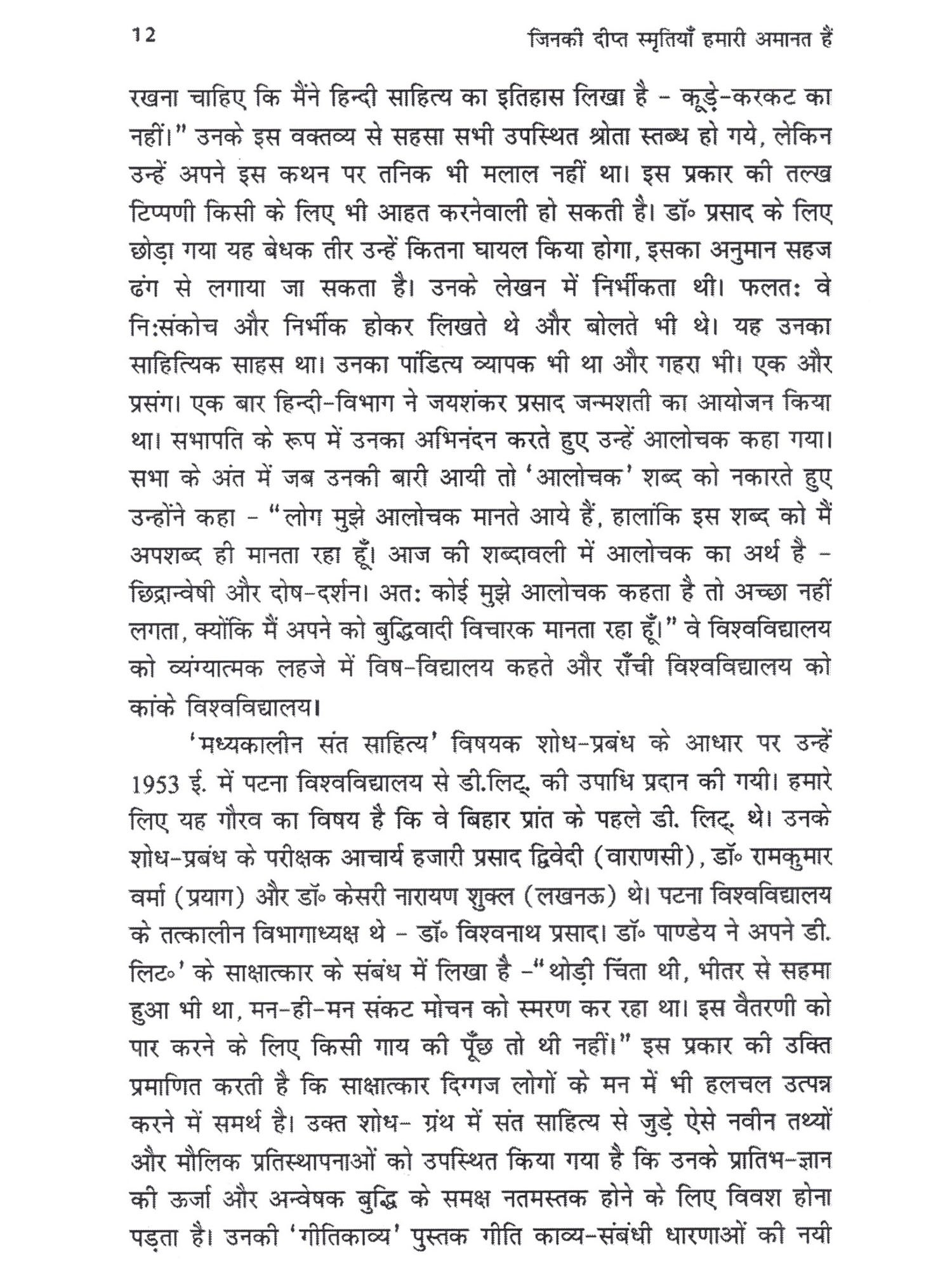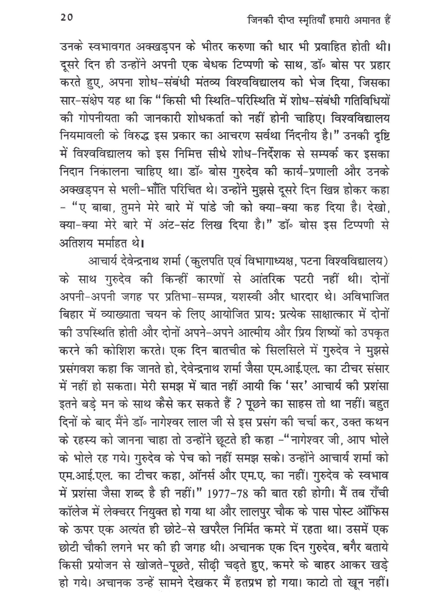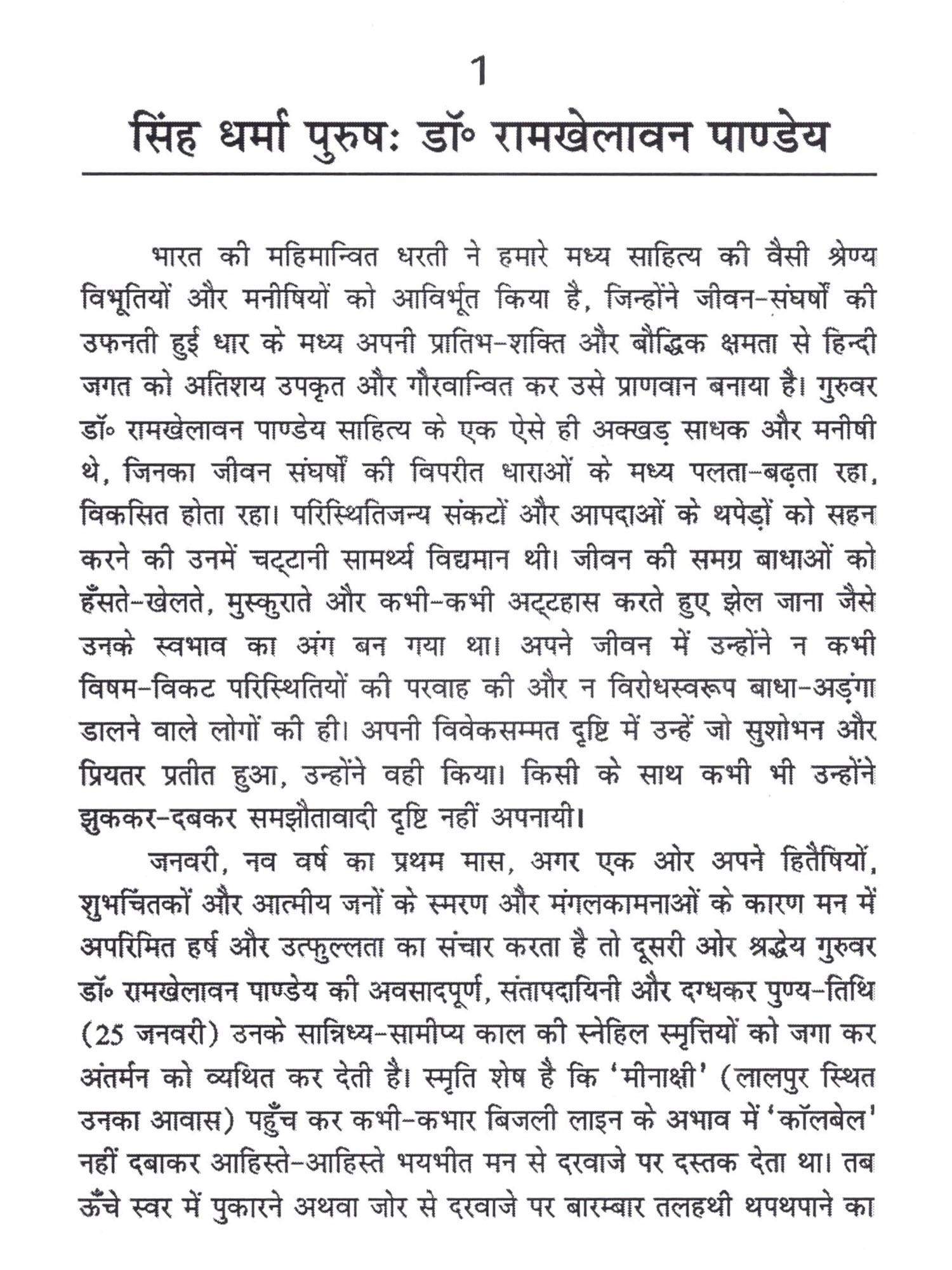 प्रस्तुत पुस्तक के बारह संस्मरणात्मक आलेख हमारी जाग्रत अन्तर्वृत्तियों के जीवंत दस्तावेज हैं। निःसंदेह, महान विभूतियों की शुभकर, सुसंगत और सुचितित मनोधाराओं, उनके त्यागमय और संघर्षशील जीवन की गाथाओं, उनका स्वाभिमानी और चिंतनशील व्यक्तित्व तथा उनके द्वारा निर्देशित पथ के अनुकरण मात्र से हमारे जीवन की राहें निष्कंटक, सुगम और उन्नतशील हो जाती हैं। महान आत्माओं की सवृत्तियाँ। हमारे आभ्यन्तर में जीवनी शक्ति का अवबोध कराकर हममें साहस, धैर्य और मानवीय मूल्यों का अबाध संबार करती हैं। इसके साथ-ही-साथ जीवन जीने और संघर्षरत रहकर उसे उदात्त, श्रेष्ठ और उत्तमोत्तम बनाने की आकांक्षा भी उत्पन्न करती हैं। पुस्तक के सम्पूर्ण आलेखों को तीन कोटियों में रखकर देखा जा सकता है। प्रथम कोटि में विश्वविद्यालय से सम्बद्ध शिक्षाशास्त्रियों, विद्वानों और साहित्यकारों पर आधारित आठ आलेख हैं। दूसरे भाग में विदेशों से आये हुए परमार्थ साधक मिशनरियों से जुड़े हुए तीन आलेख हैं, जिन्होंने समर्पित भाव से संत्रस्त, पीड़ित और वंचित मानवता की अनवरत सेवा की है। अंतिम आलेख गार्हस्थ्य जीवन से जुड़ा हुआ है, जिसमें 'बाबा' के घर के रख-रखाव, रुतबा और मालिकाना प्रभाव का अंकन इस दृष्टि से किया गया है कि घर-गृहस्थी के संचालन के निमित्त शासन अनुशासन और संयमित जीवन तथा निःस्वार्थ प्रवृत्ति का होना अत्यावश्यक है। हिसाबी और हथ-चिपक जीवन भी अभिनंदनीय और वरेण्य है। बड़े-बुजुर्गों के अनुभवजन्य विचारों ने हमें जिस पथ से अभिगमन करने का संदेश-निर्देश दिया है, वही स्तुत्प और अभिप्रेरक है। सच है कि मानव-जीवन त्याग, तपस्या, समर्पण सदाशयता और संत हृदय की साधुता की गरिमा महि के लगातार अभिमंडन से ही उच्चस्थ और समुज्ज्वल क माता है। पुस्तक के सम्पूर्ण आलेख हमारे भीतर के सुभा मानुष-भाव को जगाकर हमें सचेतन और संस्कारशील बनाने में समर्थ हैं। संस्कारशीलता मानव जीवन की अनमोल धरोहर है।