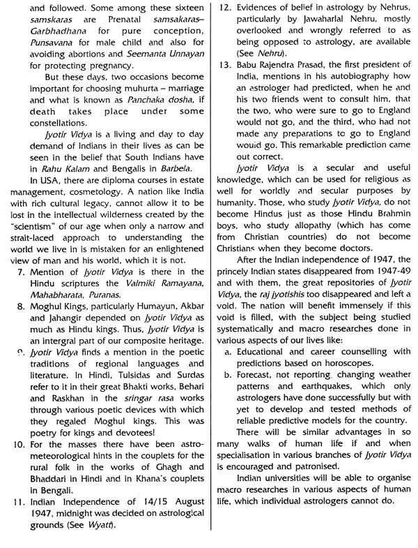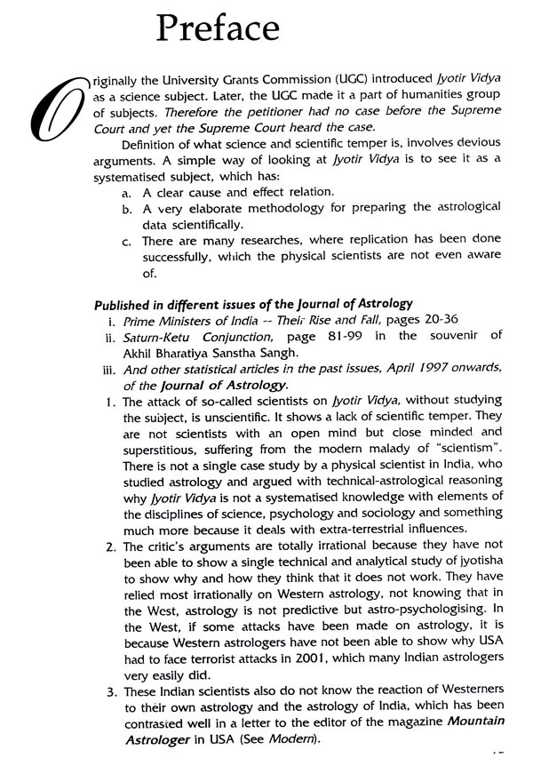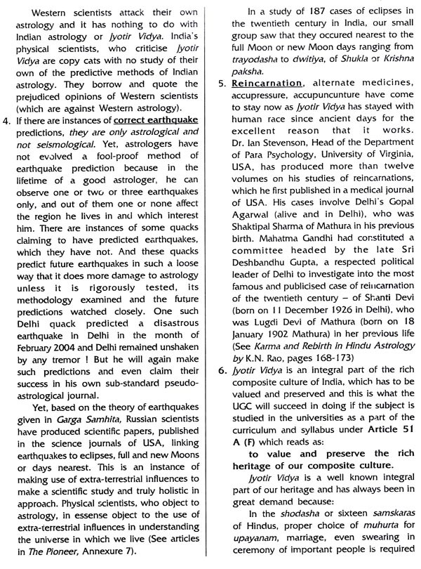 Many of these Indian critics are not even aware that they are colonial slaves even after fifty years of Indian independence. They are copycats, who accept, blindly and unscientifically. the prejudices of western scientists against western astrology. They do not know that there is an oceanic difference between Hindu astrology, which is a vast and well-developed system of predictive method while western astrology, which is psychological, has hardly any impressive body of predictive success to show. Indian astrologers predict for individuals and for collectivises. These are available in compiled evidences, some of which has been shown in this book.
