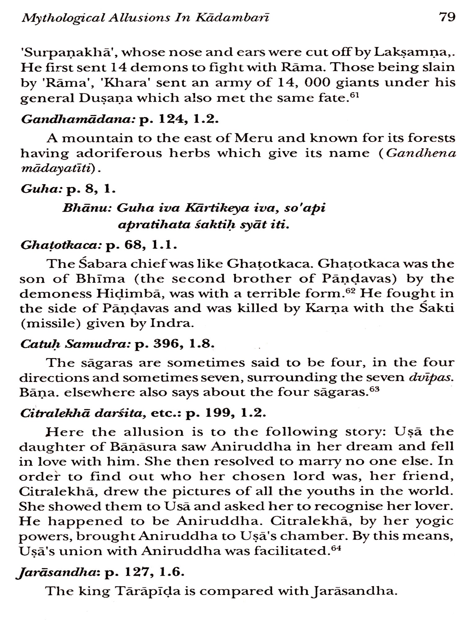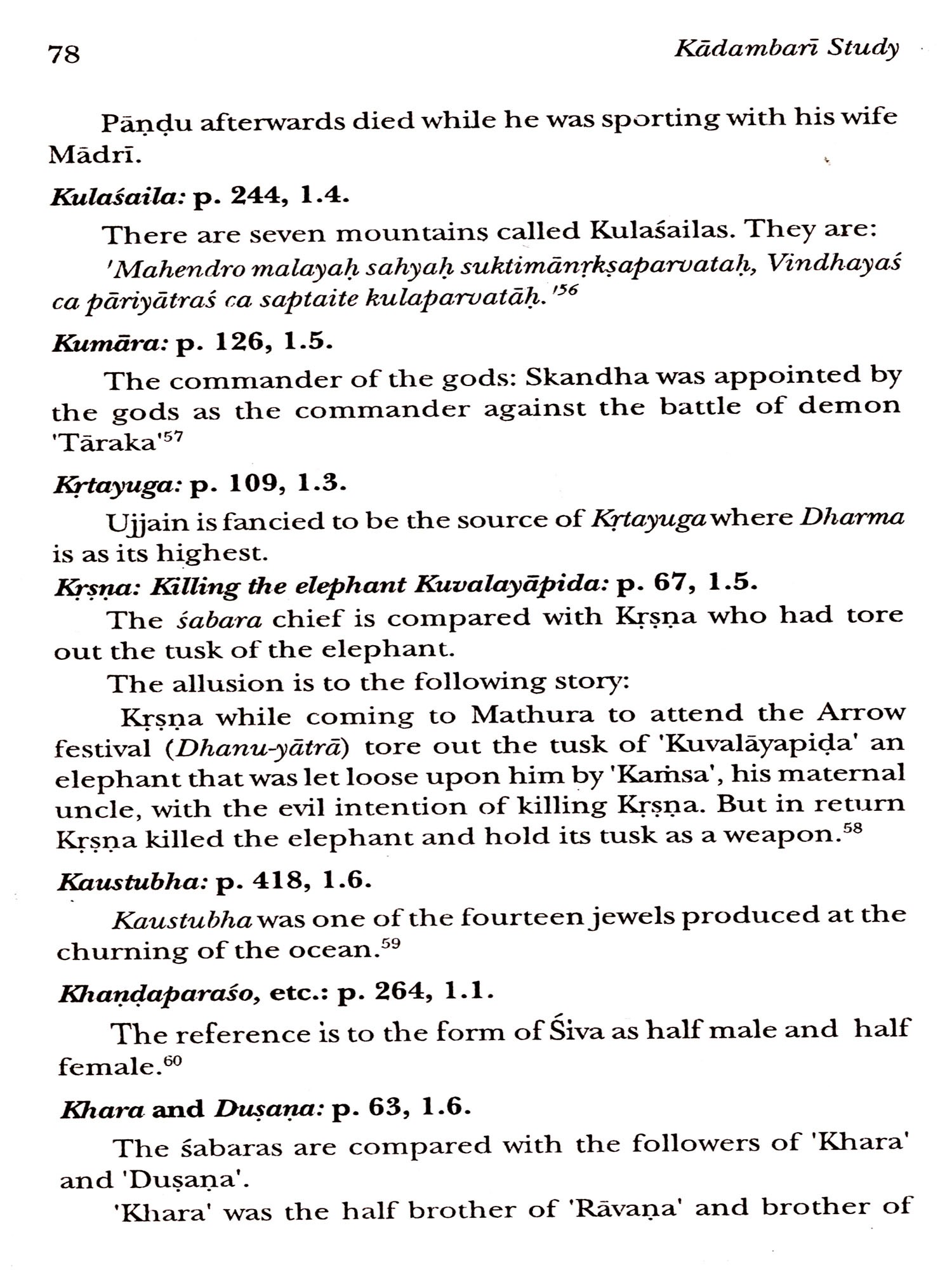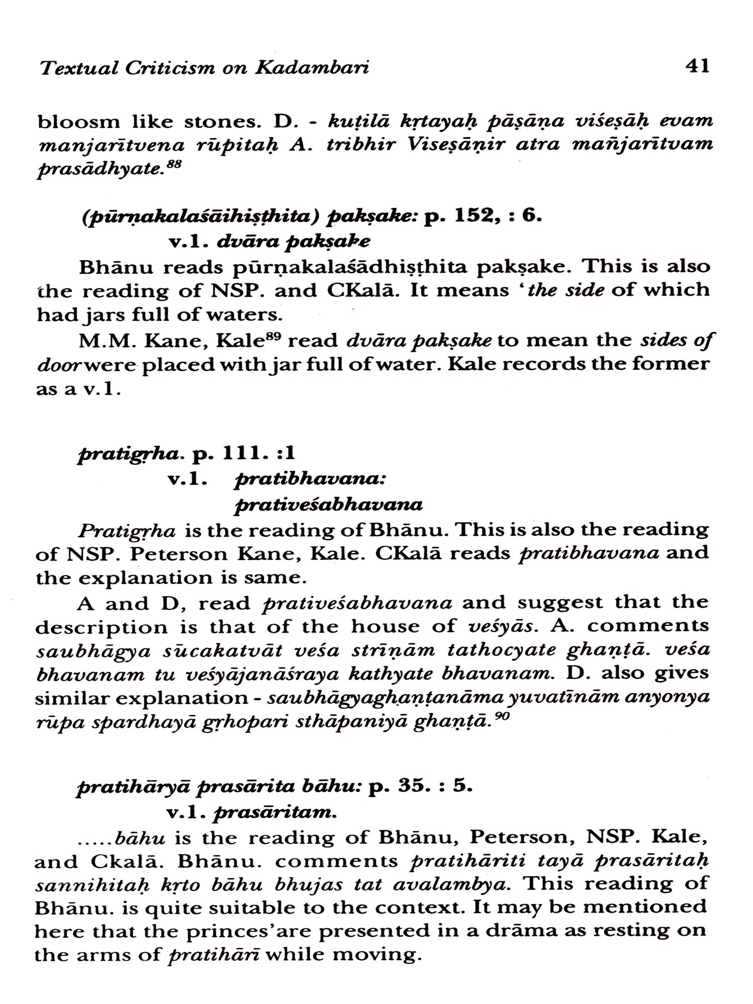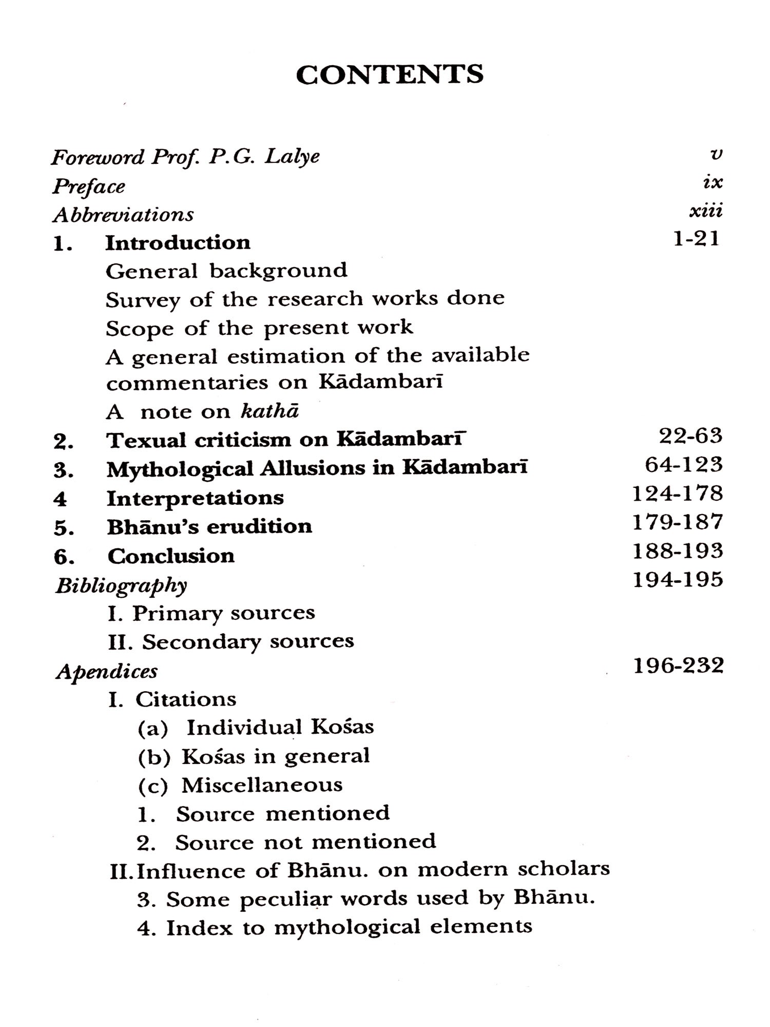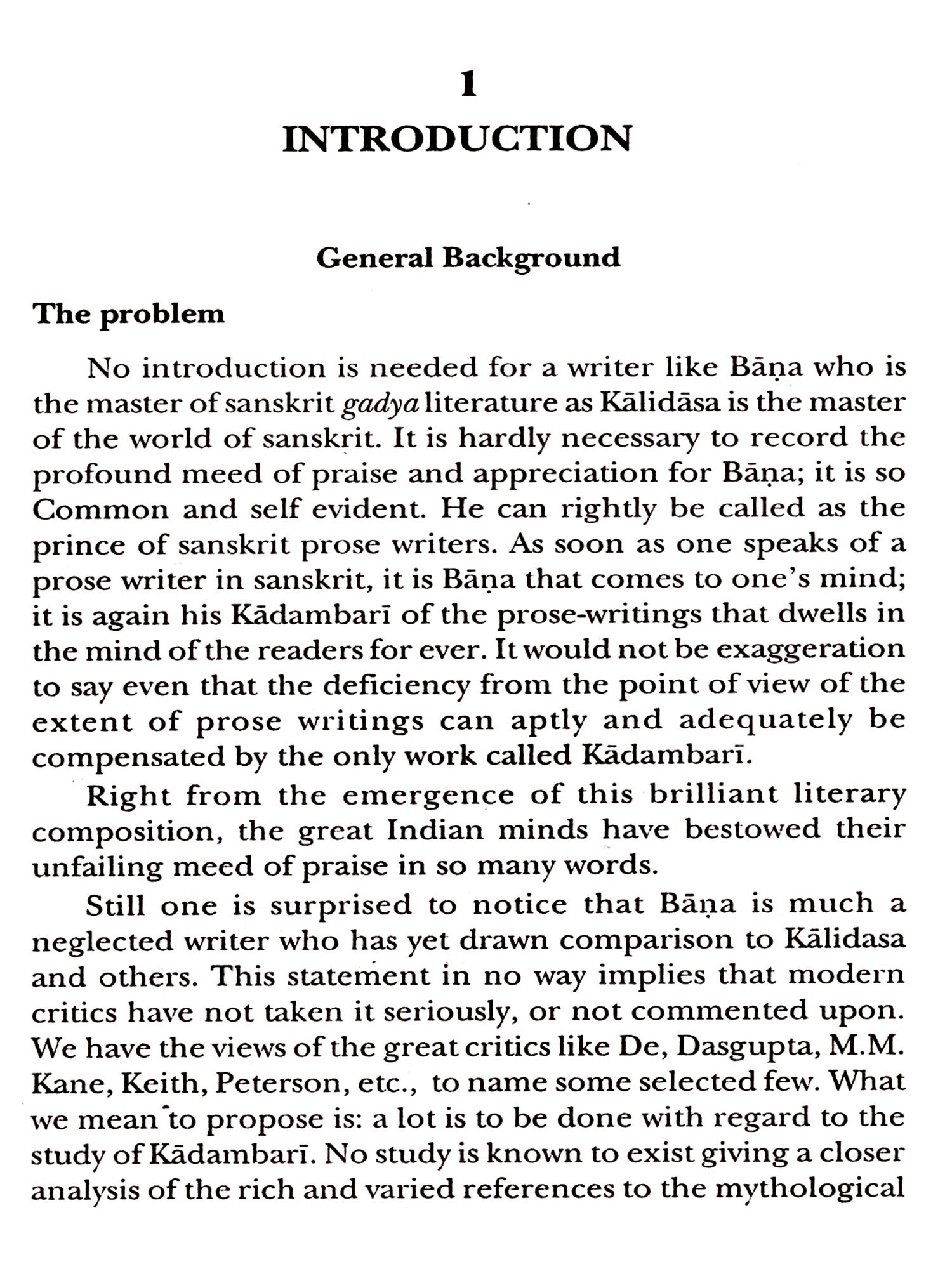 As soon as one speaks of a prose writer in Sanskrit it is Bana that comes to ones mind. Again it is his Kadambari that dwells in the mind of the readers forever, But it is sad to note that Bana has not drawn considerable attention of the modern critics in comparison to others poets; A lot is to be done with regard to the study of Kadambari No attention has been paid to the study of mythologies it is very difficult to understand Kadambari properly. No serious attempt is made to study the text of Kadambari from the point of view of textual criticism and study the available variants with a view to give the probable and proper readings of Kadambari. With these objectives in mind, the present work was undertaken for a critical study.