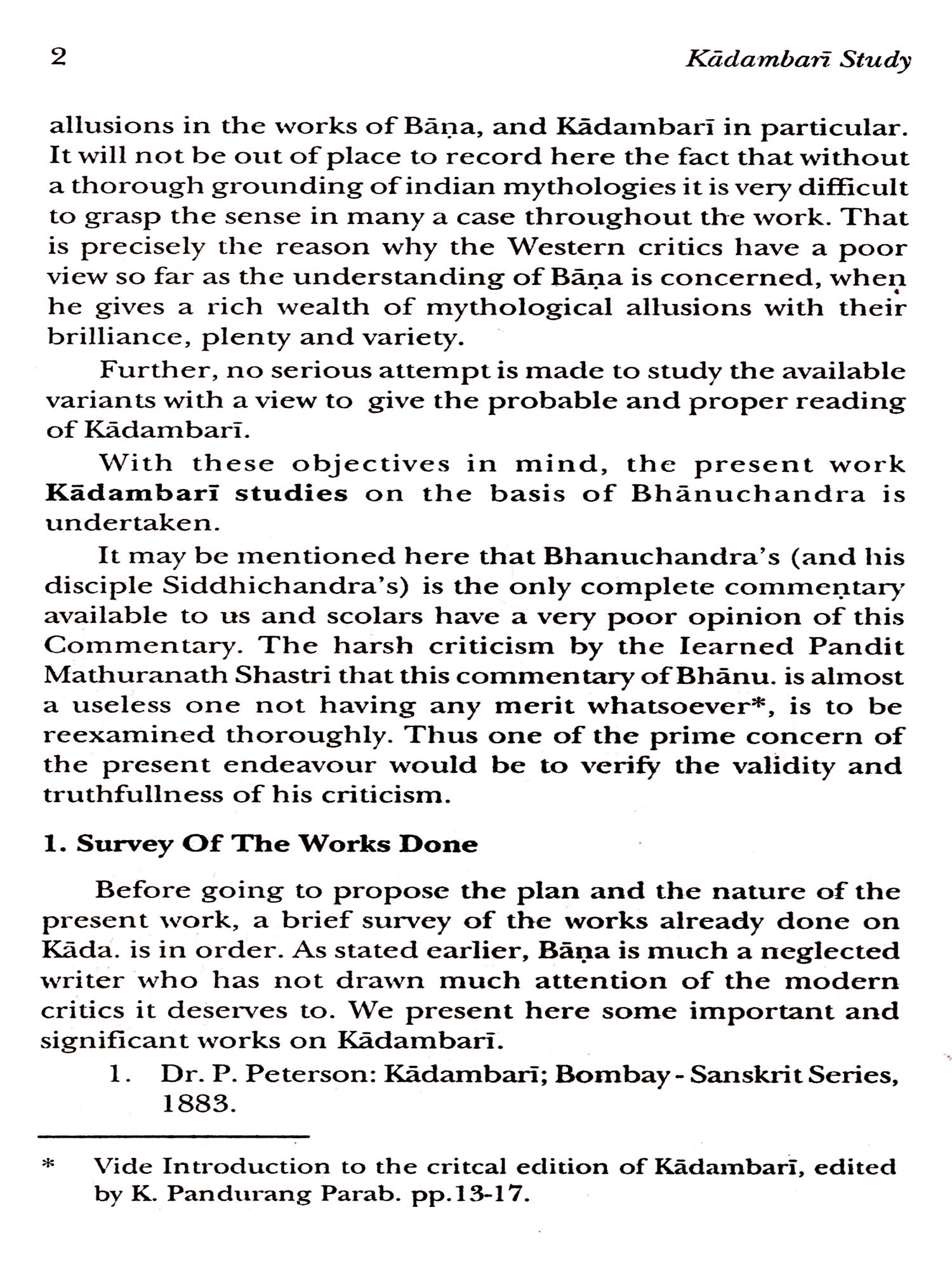 The present work bases its study and analysis on the Purvabhaga of Kadmbari mainly in the light of the commentary of Bhanuchandra. It is arrnged in six chpters including the introduction and conclusion where a general estimation of the commentaries on Kādambarī is presented. The second chapter is devoted to textual criticism of Kadambari. The criticism of the editor regarding the text have been thoroughly examined. The third chapter is devoted to mythological allusions in Kadambari. The fourth chapter deals with the interpretation, on the basis of the commentary of Bhanuchndra along with two unpublished commentaries namely Amoda and Darpana. Fifth and Sixth chapters are devoted to the exposition of the scholarship of Bhanuchndra, and special features of the commentary.