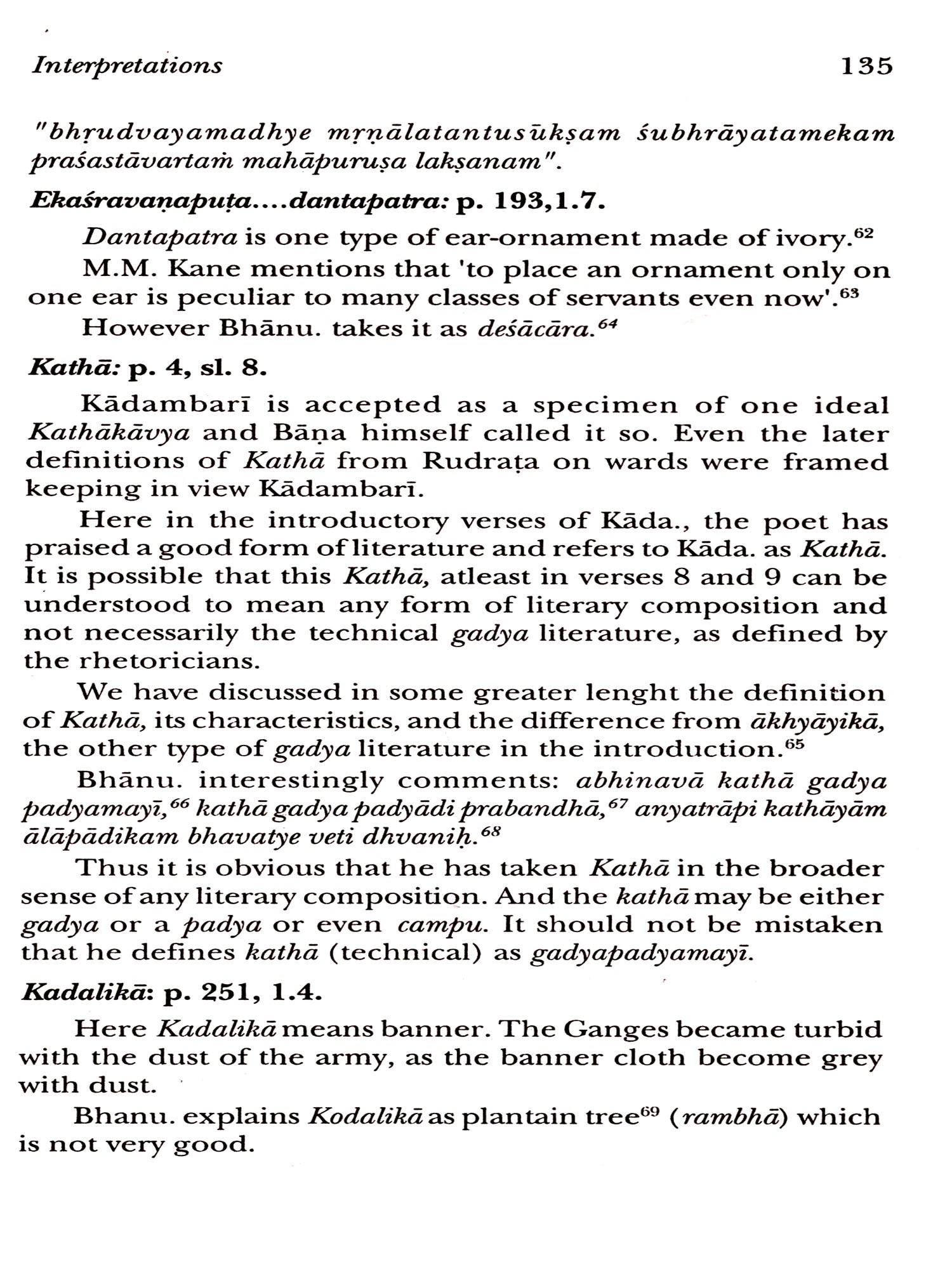 Dr. Mrs. Jayanti Tripathy has highlighted the merits of Bhanucandra (Dasa) a commentator of Banas Kadambari. She has critically evaluated the various devices employed by him to bring the right import of the composition of Bana and has brought home the greatness of the prose composition-Kadambari.