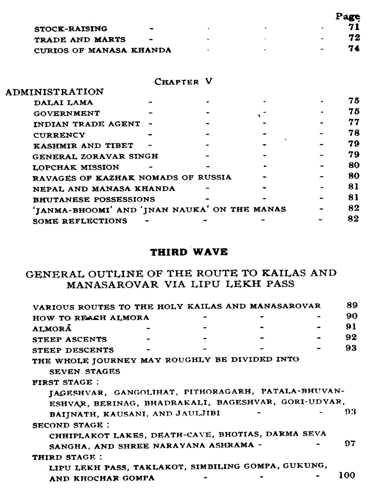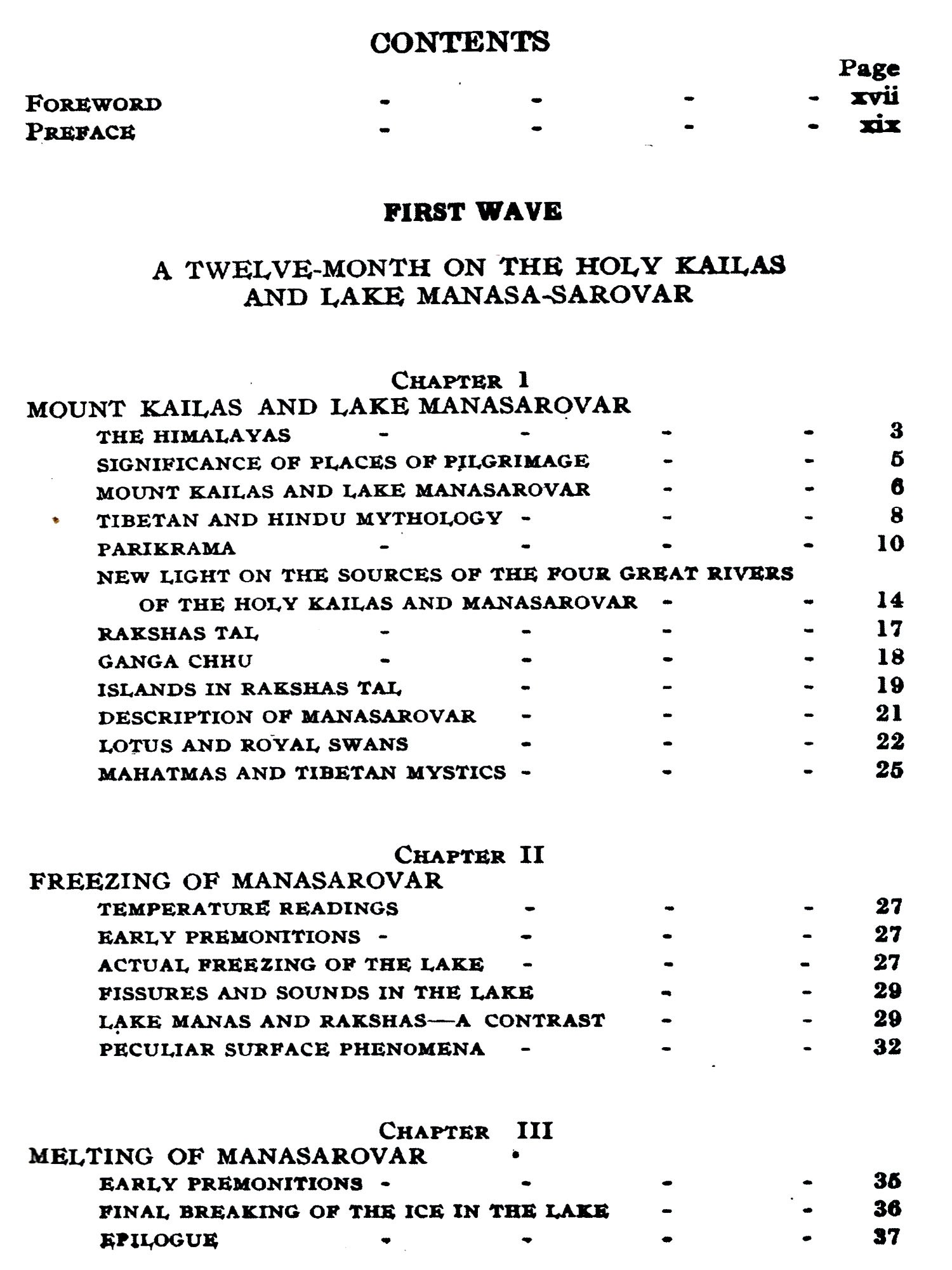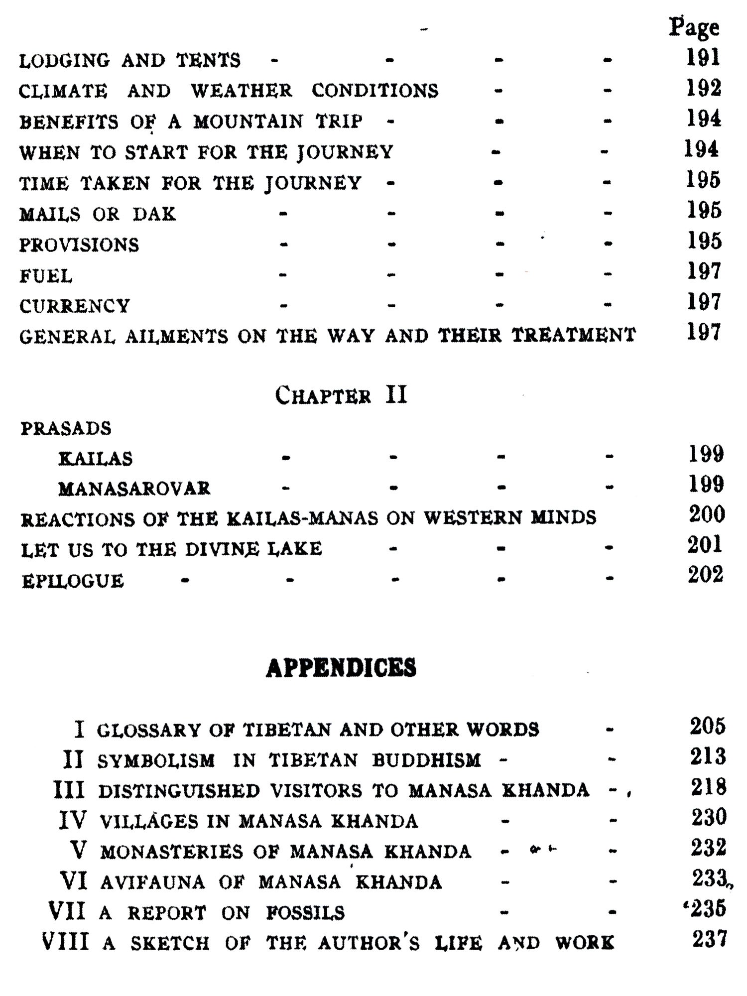 The author had the privilege of travelling in 1928, for the first time, in Western Tibet on a visit to these Holy places. He went from Srinagar (Kashmir) through Ladakh, Gartok, Gyanima Mandi, round Kailas and Manasarovar, to Taklakot, Khocharnath, Chhakra Mandi, again to Gartok, and back to Rishikesh, by the Gunla-Niti pass.
