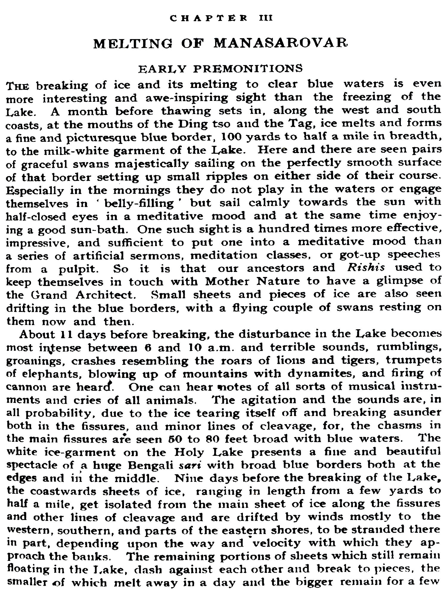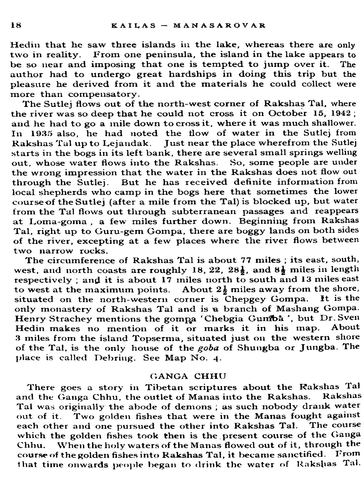 In 1935 he undertook a second journey from Mukhuva (Gangotri) through Nilang by the Jelukhaga pass, Thuling, Mangnang, Dapa, Dongpu, Sibchiliım, Gyanima Mandi, Kailas-Manasarovar, Chhakra Dongpu, Mandi, and back to Gangotri by the Damjan-Niti pass. In 1936-37 and again in 1938 he travelled from Almora by the Lipu Lekh pass and returned by the same route. He had the privilege of staying for a full twelve-mouth in the Thugolho Monastery on the southern shores of Manasarovar for his spiritual sadhana. In the course of these travels, he had opportunities of tracing the 'Four Great Rivers' of this Region, namely the Brahmapurta, the Indus, the Sutlej, and the Karnali, to their sources, of going over the frozen lake of Rakshas Tal from east to west and north to south, and landing on the two islands in it. He visited these regions again in 1939 by the Unta-dhura, Jayanti, and Kungri-bingri passes.