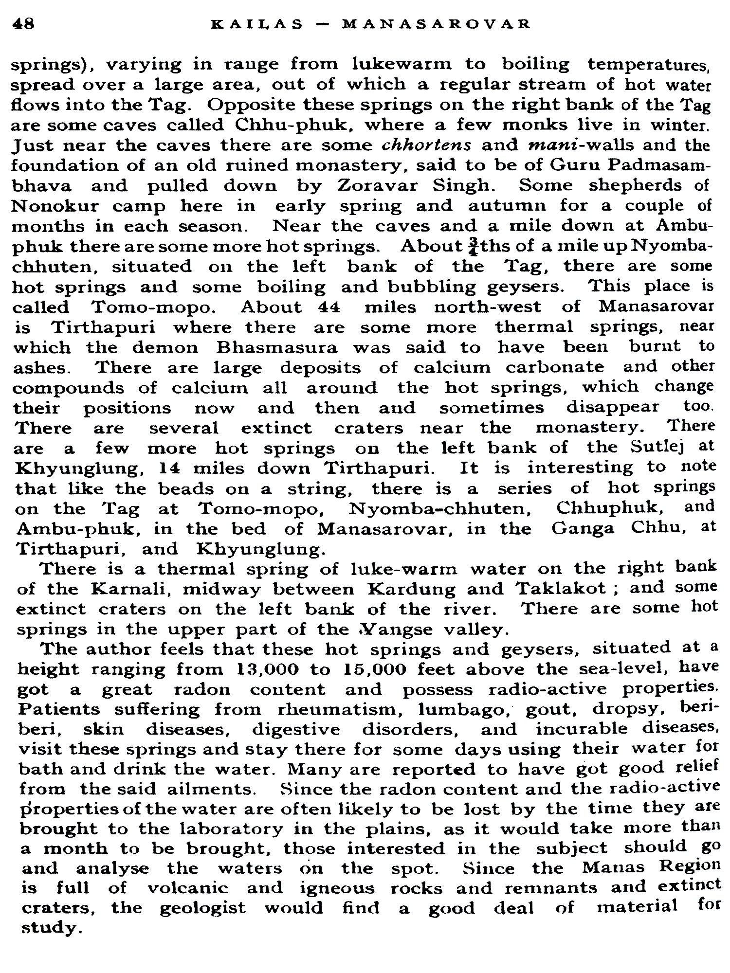 The author has been visiting these places regularly every year and staying there for periods ranging from two to six months; besides, he had occasion to spend a continuous sixteen-month, a second time in 1943-44 on the shores of the Holy Manasarovar at Thugolho. In all, he completed 23 parikramas or circumabulations of the Mount Kailas and 25 of the Lake Manasarovar, of which 7 rounds were done in winter when the surface of the entire Lake was frozen. He collected some fossils from the Ganga Chhu and Thugolho in 1945 and from Bongza range in Central Tibet in 1947. In 1946 he visited the Deserted Cave-City of Pangtha.