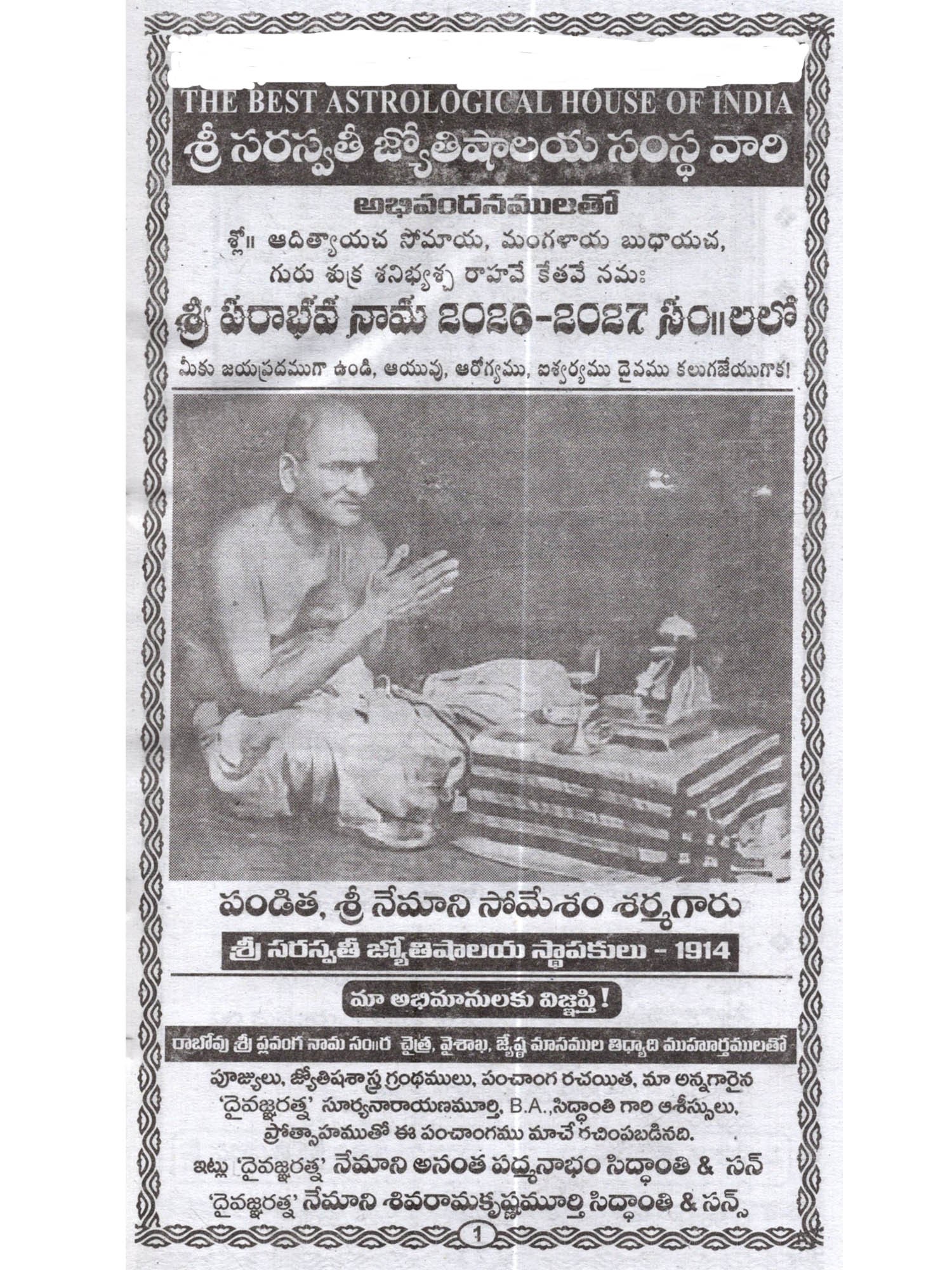 శ్రీ నేమాని వారి: శ్రీ క్రోధి నామ సంవత్సర గంటల పంచాంగము- Sri Nemani Vari: Sri Krodhi Nama Yearly Sanvatsara Gantala Panchangamu in Telugu (2025-2026)