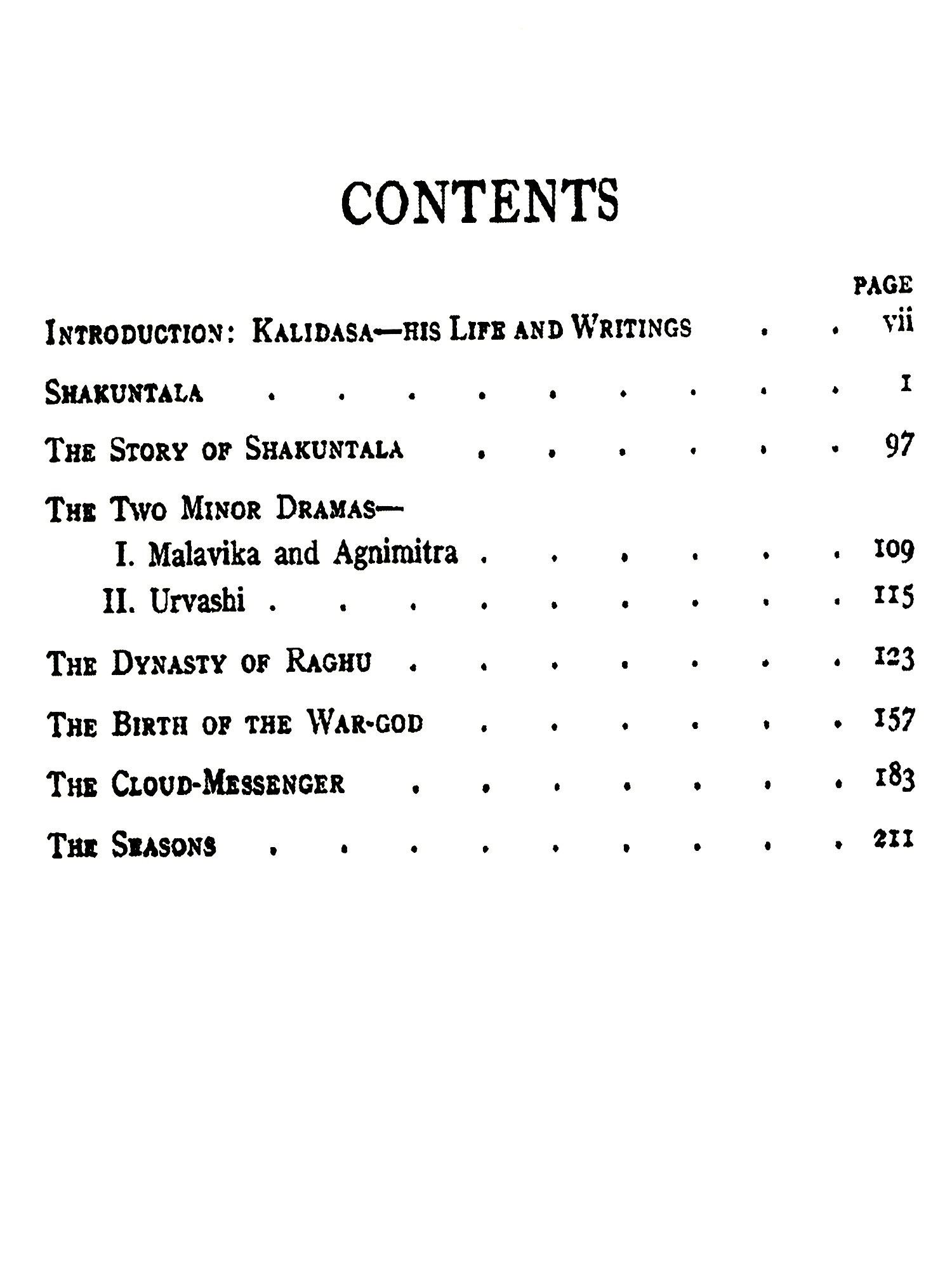 KALIDASA probably lived in the fifth century of the Christian era. This date, approximate as it is, must yet be given with considerable hesitation, and is by no means certain. No truly biographical data are preserved about the author, who nevertheless enjoyed a great popularity during his life, and whom the Hindus have ever regarded as the greatest of Sanskrit poets. We are thus confronted with one of the remarkable problems of literary history. For our ignorance is not due to neglect of Kalidasa's writings on the part of his countrymen, but to their strange blindness in regard to the interest and importance of historic fact. No European nation can compare with India in critical devotion to its own literature. During a period to be reckoned not by centuries but by millenniums, there has been in India an unbroken line of savants un-selfishly dedicated to the perpetuation and exegesis of the native masterpieces. Editions, recensions, commentaries abound; poets have sought the exact phrase of appreciation for their predecessors: yet when we seek to reconstruct the life of their greatest poet, we have no materials except certain tantalising legends, and such data as we can gather from the writings of a man who hardly mentions himself.