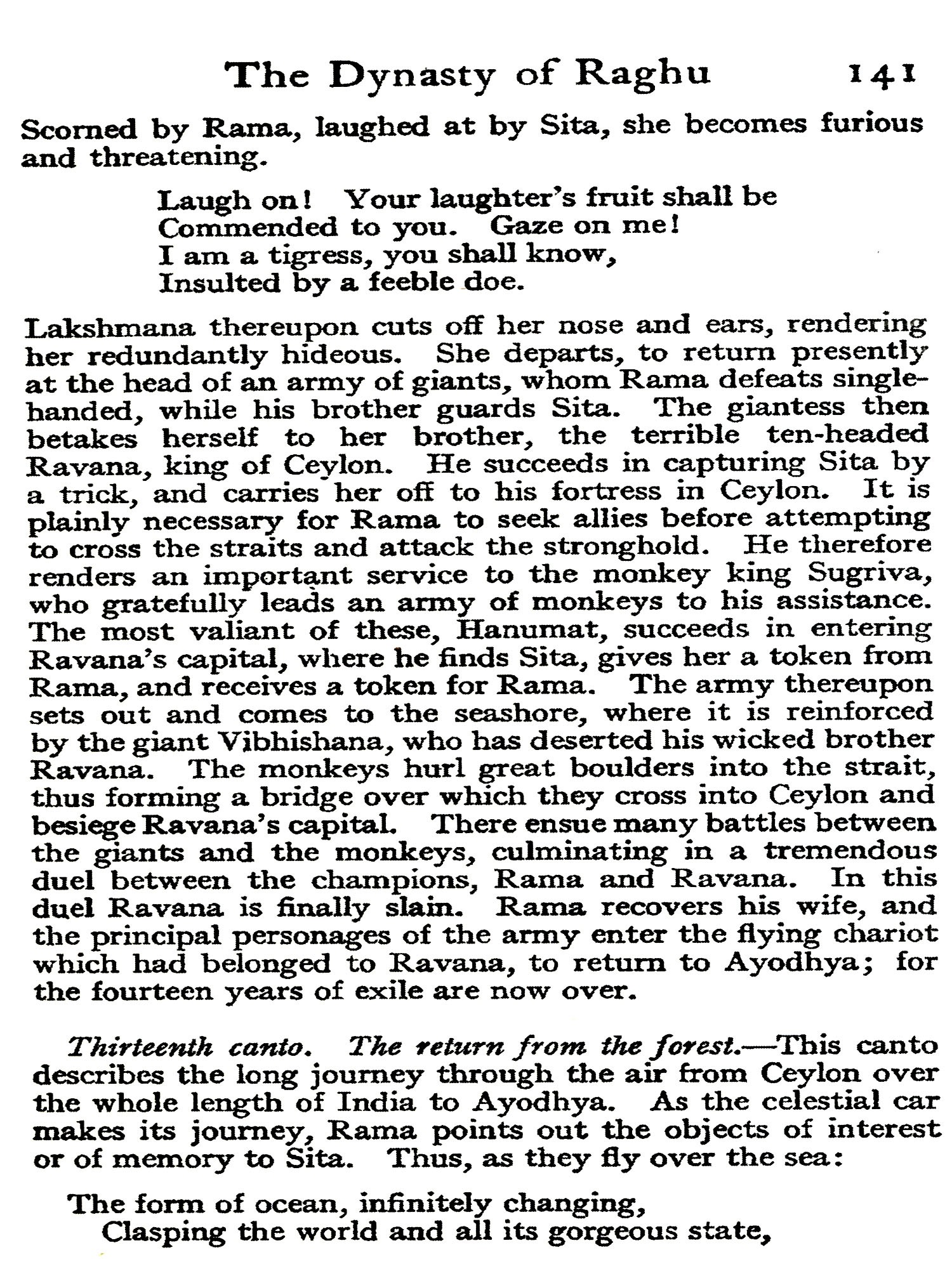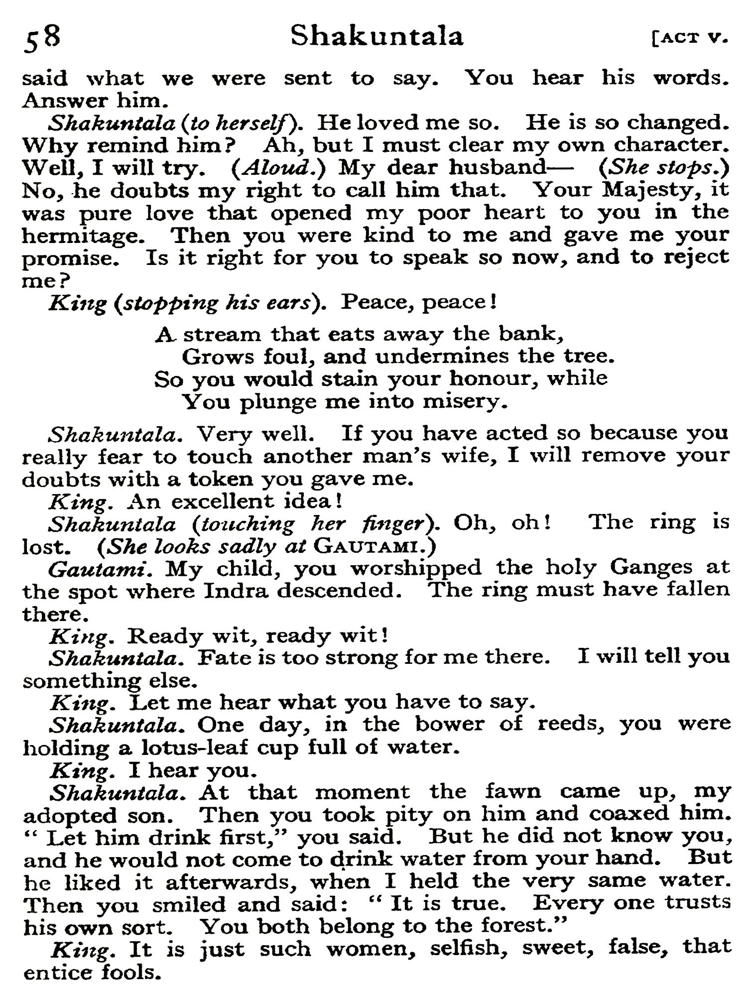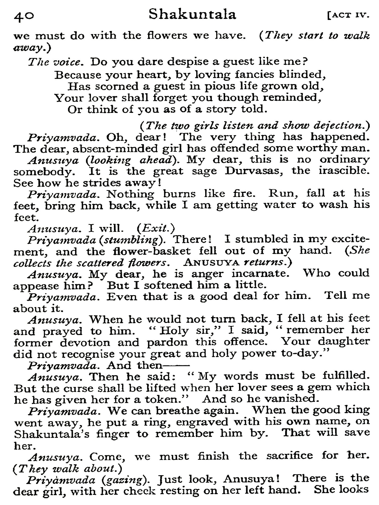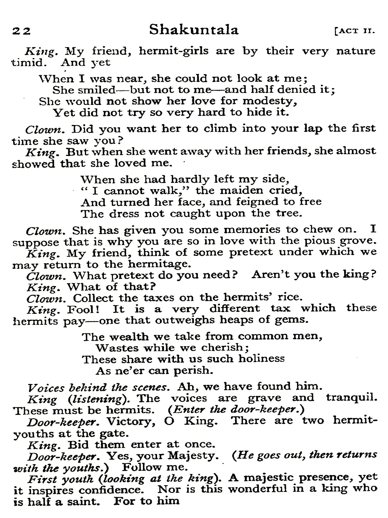 The rejected counsellor planned a cruel revenge. He took the handsome ox-driver from the street, gave him the garments of a savant and a retinue of learned doctors, then introduced him to the princess, after warning him that he was under no circumstances to open his lips. The princess was struck with his beauty and smitten to the depths of her pedantic soul by his obstinate silence, which seemed to her, as indeed it was, evidence of profound wisdom. She desired to marry Kalidasa, and together they went to the temple. But no sooner was the ceremony performed than Kalidasa perceived an image of a bull. His early training was too much for him; the secret came out, and the bride was furious. But she relented in re-sponse to Kalidasa's entreaties, and advised him to pray for learning and poetry to the goddess Kali. The prayer was granted; education and poetical power descended miraculously to dwell with the young ox-driver, who in gratitude assumed the name Kalidasa, servant of Kali. Feeling that he owed this happy change in his very nature to his princess, he swore that he would ever treat her as his teacher, with profound respect but without familiarity. This was more than the lady had bargained for; her anger burst forth anew, and she cursed Kalidasa to meet his death at the hands of a woman. At a later date, the story continues, this curse was fulfilled. A certain king had written a half-stanza of verse, and had offered a large reward to any poet who could worthily complete it. Kalidasa completed the stanza without difficulty; but a woman whom he loved discovered his lines, and greedy of the reward herself, killed him.
