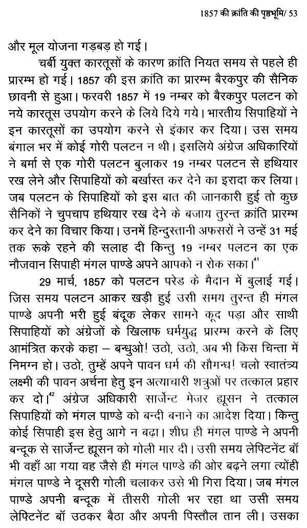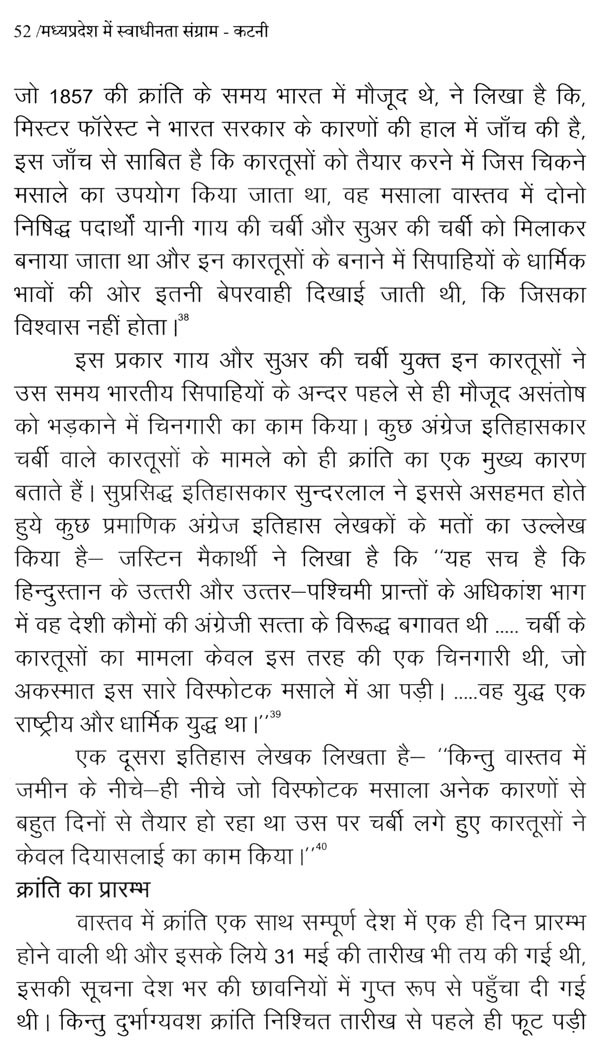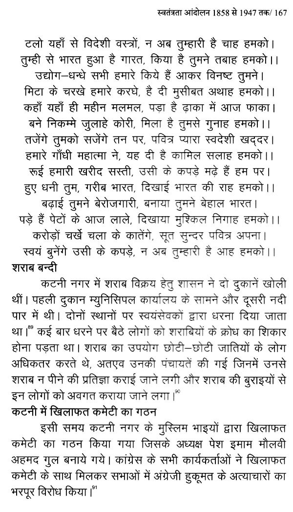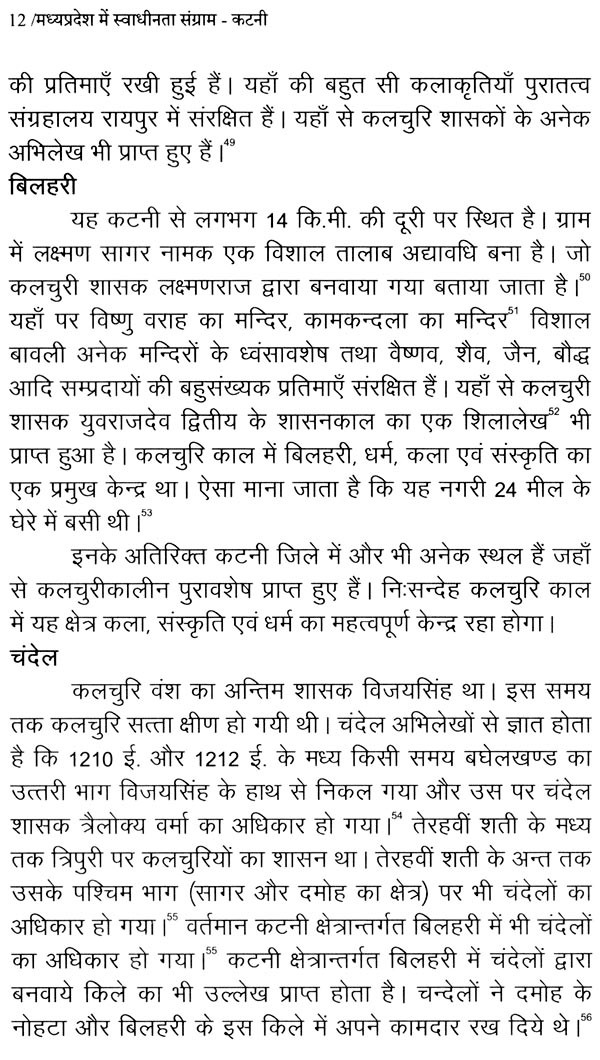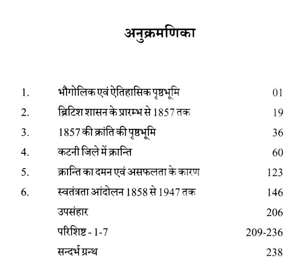 तीसरे अध्याय में 1857 के प्रथम स्वतंत्रता संग्राम के कारणों का संक्षेप में वर्णन किया गया है। इस अध्याय में 1857 के इतिहास में सुप्रसिद्ध इतिहासकारों विनायक दामोदर सावरकर, सुरेन्द्रनाथ सेन, पं. सुन्दरलाल के अतिरिक्त तत्कालीन घटनाओं के प्रत्यक्षदर्शी मोईनुद्दीन हसन एवं अन्य इतिहासकारों के विवरणों का यथा-स्थान उल्लेख किया गया है। चौथे अध्याय में कटनी क्षेत्र में 1857 की क्रान्ति के कारण, घटनाओं, विजयराघवगढ़ राजपरिवार, 1857 के कटनी क्षेत्र के प्रमुख सेनानी, क्रांति के प्रमुख स्थलों आदि का विस्तृत वर्णन किया गया है। पांचवे अध्याय में 1857 की क्रान्ति के दमन व उसके उपरान्त इस क्षेत्र में क्रान्ति के प्रभाव एवं परिणामों का उल्लेख करते हुए इसकी असफलता पर प्रकाश डाला गया है। छठवें अध्याय में स्वतंत्रता आन्दोलन के दौरान इस क्षेत्र में जनजागरण, कांग्रेस की स्थापना, तिलक युग की घटनाएँ एवं इसके उपरान्त महात्मा गाँधी द्वारा चलाये गए सत्याग्रह, सविनय अवज्ञा आन्दोलन, भारत छोड़ो आन्दोलन आदि को राष्ट्रीय घटनाक्रमों से जोड़ते हुए विवरण प्रस्तुत किया गया है। इसी अध्याय में गोवा मुक्ति आन्दोलन की भी संक्षिप्त जानकारी प्रस्तुत करते हुए 1 नवम्बर, 1956 को मध्यप्रदेश के पुर्नगठन तक का उल्लेख किया गया है। अन्त में संक्षेप में उपसंहार प्रस्तुत किया गया है।