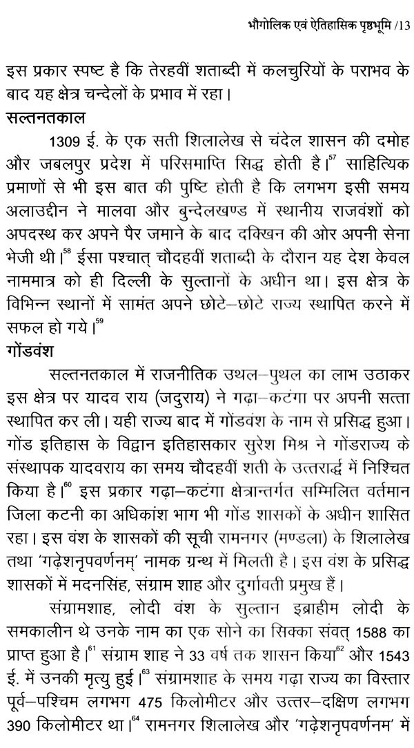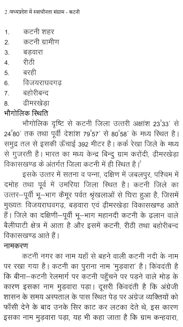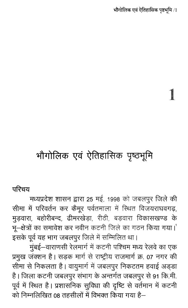 प्रस्तुत पुस्तक के प्रथम अध्याय में कटनी जिले की संक्षिप्त भौगोलिक एवं ऐतिहासिक पृष्ठभूमि का उल्लेख किया गया है। द्वितीय अध्याय में इस क्षेत्र में अंग्रेजी शासन के प्रारम्भ सन् 1818 से 1857 तक की घटनाओं का विवरण है। इन दिनों यह क्षेत्र ठगों और पिंडारियों के आतंक तथा अंग्रेज अधिकारी कर्नल स्लीमैन द्वारा जनहित में कठोरता के साथ किये गये उनके दमन के कारण चर्चित था।