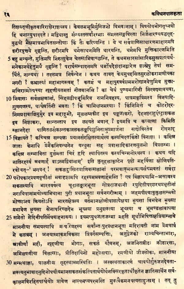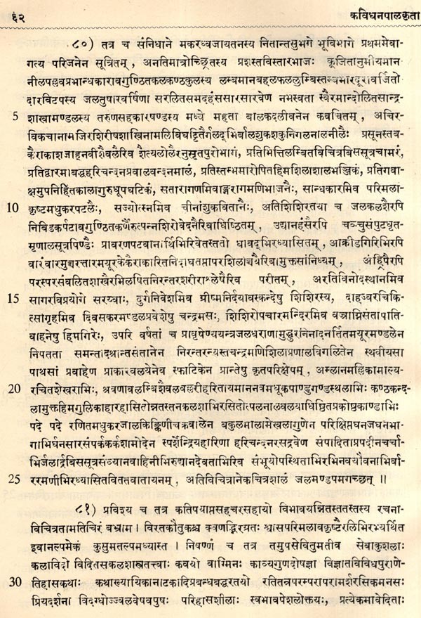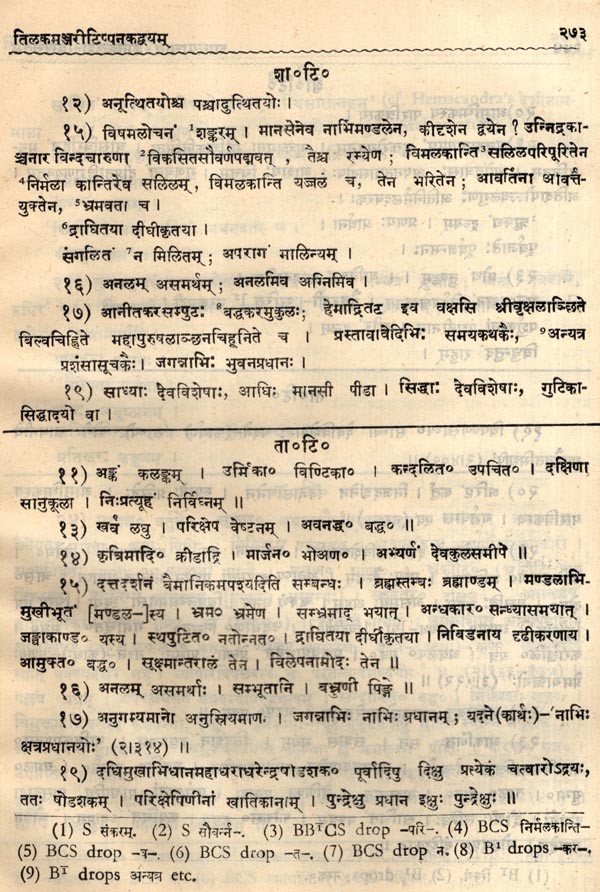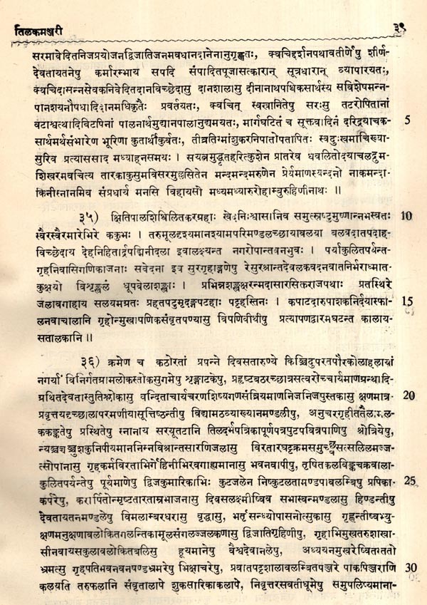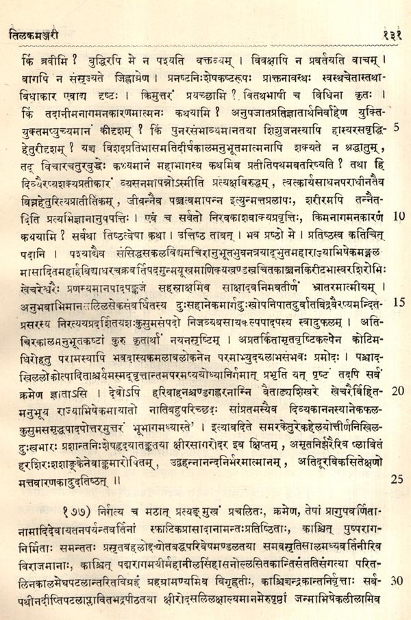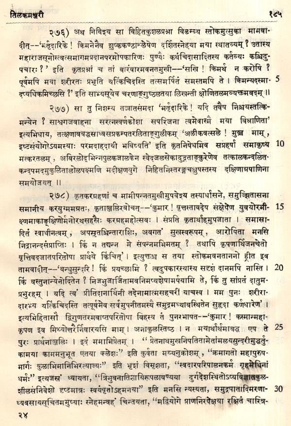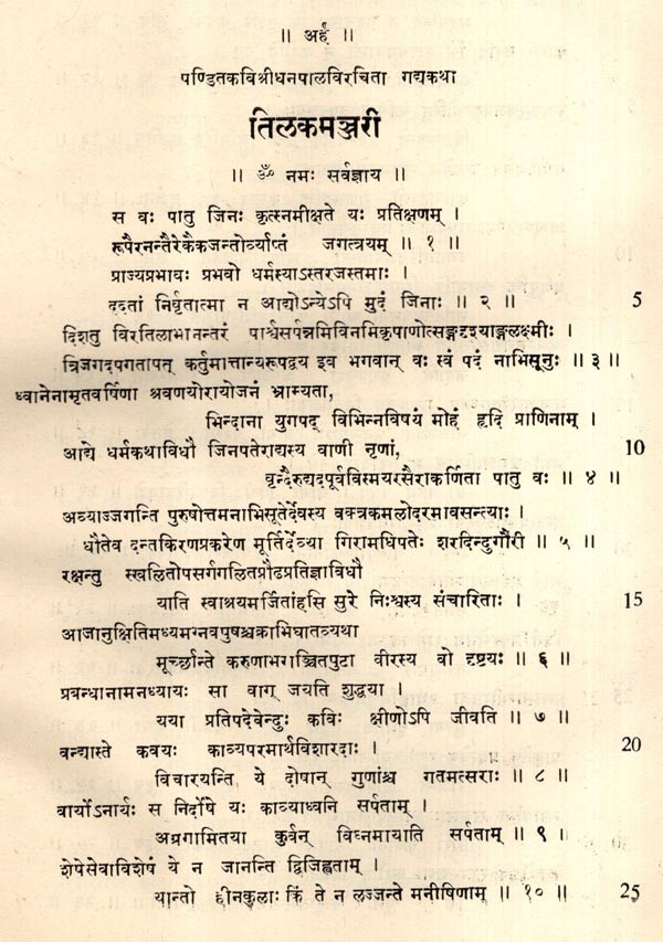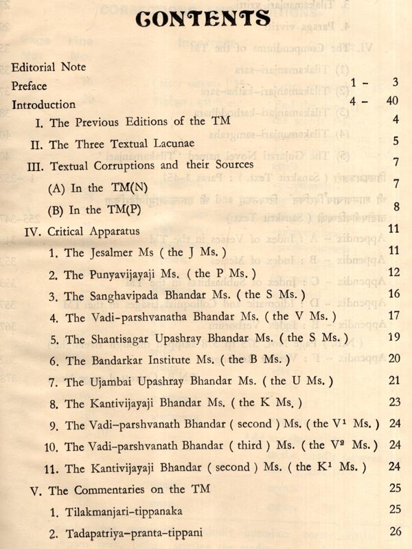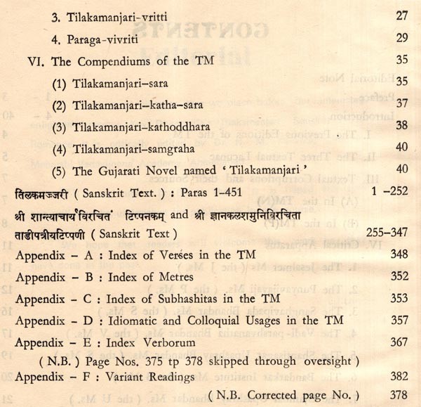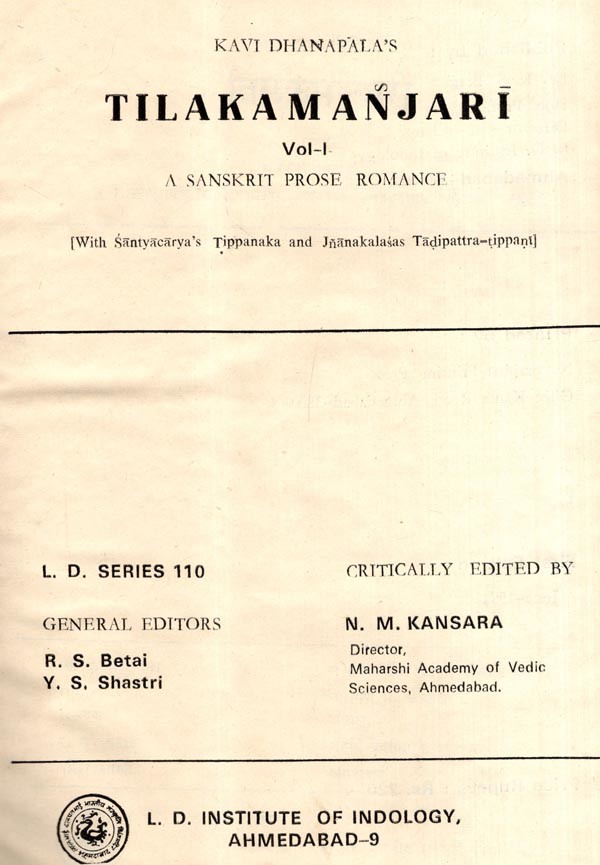 The Sanskrit text of the Tilakamanjari of Kavi Dhanapala of Dhara was first published in full in 1933 A.D. by the Nirnay Sagara Press, Bombay. It was edited by Pandits Bhavadatta Shastri and K. B. Parab in the Kavyamala Series (No. 85), and was issued in a single volume of three hundred fifty pages. The second edition, TM(N), published by them in 1933 A.D., was more or less a reprint preserving intact almost all the hundreds of mistakes and misprints of the first edition. The publication of a fairly correct edition with three commentaries, viz., Santyacarya's Tippanaka, Padmas-agara's Vyakhya and Vijayalavanyasuri's Vivrti, was started under the patronage of Sheth Shri Ishwardas Mulachandra from Ahmedabad in the year 1941 A.D. in Shri Vijayanemisüri Granthamala (No. 27), but somehow it did not proceed beyond the introductory verses and a part of the first sentence, i.e., covering pages 1 to 9 of the for TM (N). The work, with the two of the above commentaries, was again taken up for publication in V.Sam 2008 (i.e. 1952 A.D.) under the auspices of Shri Vijayalavanya-sari Jnana Mandira, Botad (Saurashtra); this time the Vyakhya of Padmasagara was dropped. Unfortunately, the learned author of the Paraga-viveti, Shri Vijayalavanyasari, left for the yonder world before the work was published in full. The incomplete edition published so far covered in three volumes almost two-thirds of the complete text of the work, i.e., covering the text portion upto two hundred twenty-six out of total number of four hundred twenty-eight pages of the TM(N).