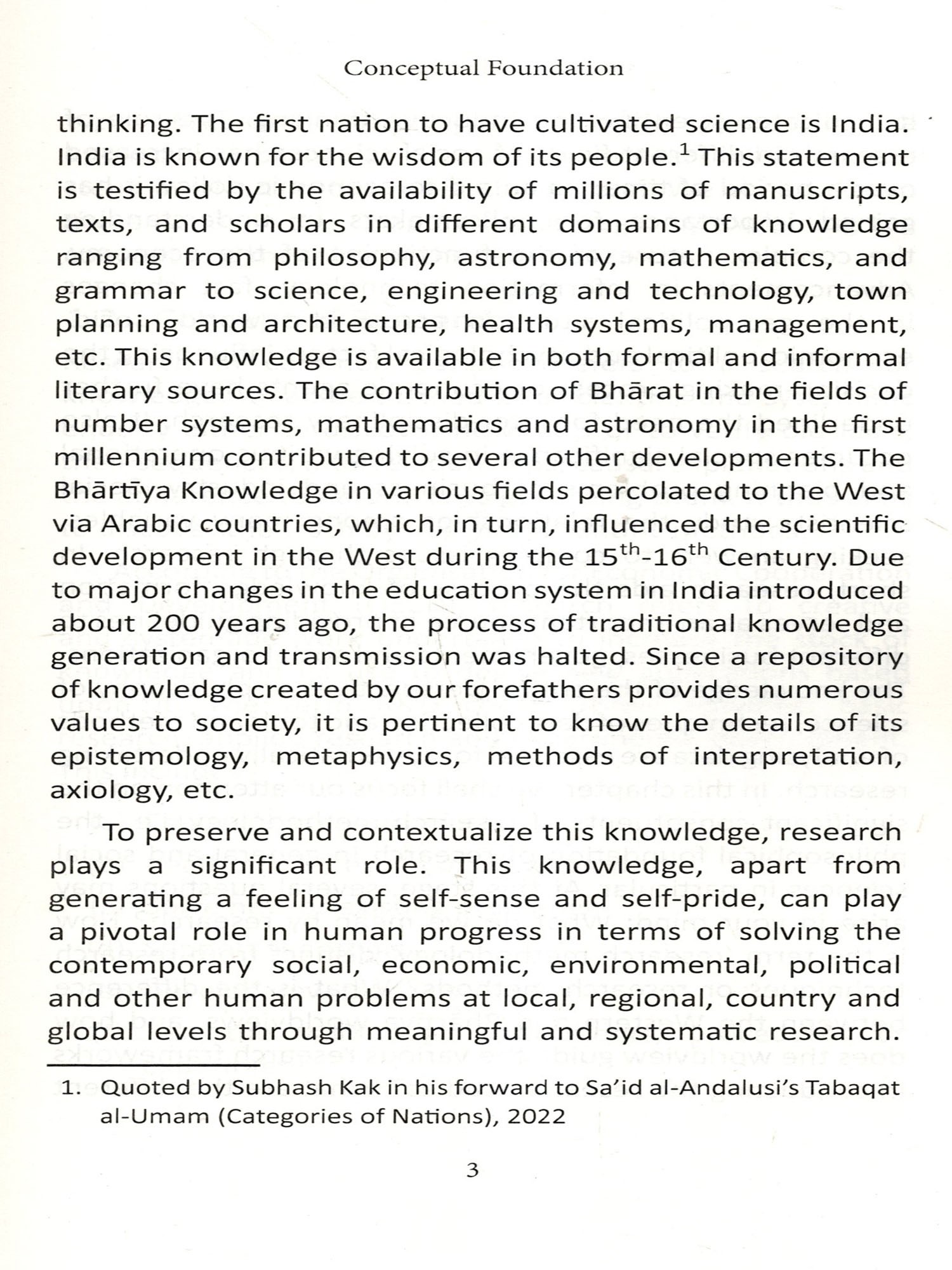 Further, now a days, a lot of things are being talked of about Bhartiya knowledge system highlighting the availability of millions of manuscripts, texts, scholars in different domains of knowledge ranging from philosophy, astronomy, mathematics, grammar to science, engineering and technology, town planning and architecture, health systems, management etc. India's contribution in the fields of number systems, mathematics and astronomy in the first millennium, which led to several other developments, is highly appreciated. However, in the contemporary discourse on the Bhartiya knowledge system, the following questions need due attention:
