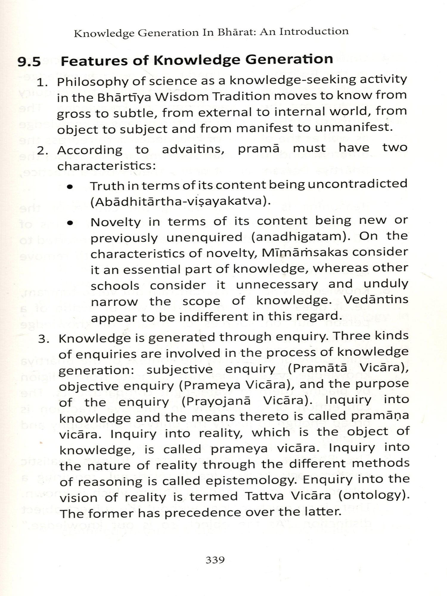 On observing closely, we realize the consequences these assumptions forbear on all aspects of human knowledge. The Western Epistemology of recognizing only the external world (thoughts and objects) as real has led to several contradictions like science vs religion, realism vs constructivism, rationalism vs empiricism, induction vs deduction, nominalism vs realism, methodological individualism vs methodological wholism, and methodological monism vs methodological pluralism. Integral Vision of Reality as envisioned in the Bhartiya World-View has led to Epistemological Resonance, leading the seeker gradually from gross to subtle, external to internal, object to subject, and manifest to unmanifest. Knowledge is not Purush Tantram but Vastu Tantram i.e. it does not depend on the will or action of a person but on sources or means of knowledge (Praman janyam). The Bhartiya Epistemology is thus essentially realistic in nature.