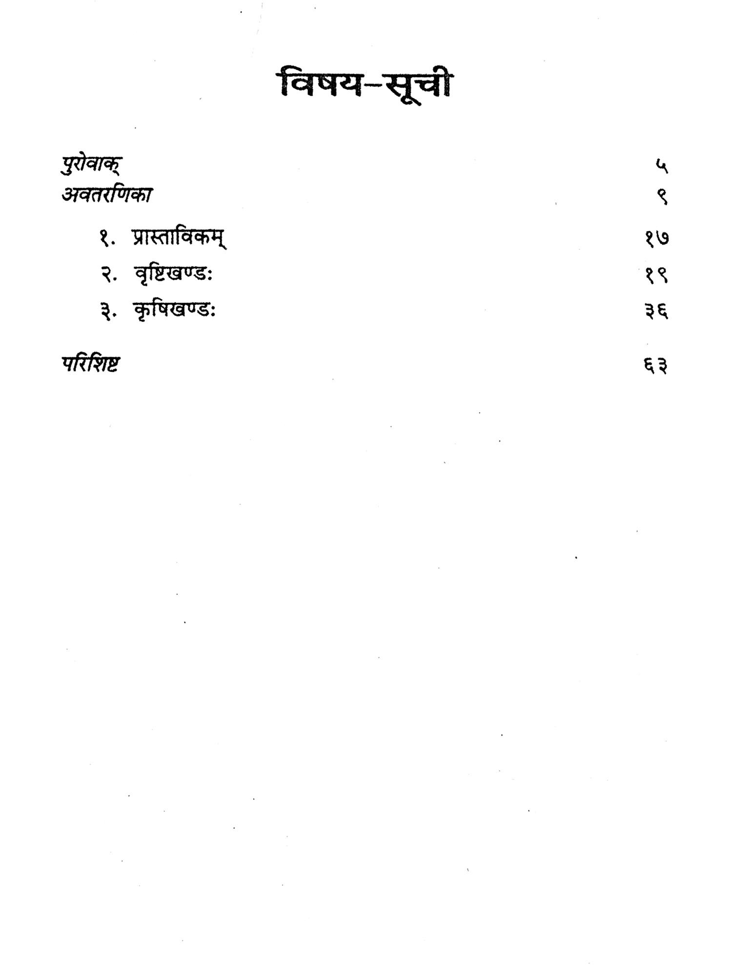 ११. १२. प्रस्तुत ग्रन्थ के सम्पादन से मन में सन्तोष है कि पाठकगणों में से कोई उत्साही अनुसन्धाता इस अवरुद्ध अनुसन्धान को आगे बढ़ायेगा। मुझे पूर्ण विश्वास है कि प्राचीन भारतीय विद्या वृष्टिज्ञान तथा कृषि सम्बन्धी अनेक महत्वपूर्ण सूचनाओं एवं विधियों से भरी है। आवश्यकता है उसे ढूँढ़ने तथा प्रयोग करने की।