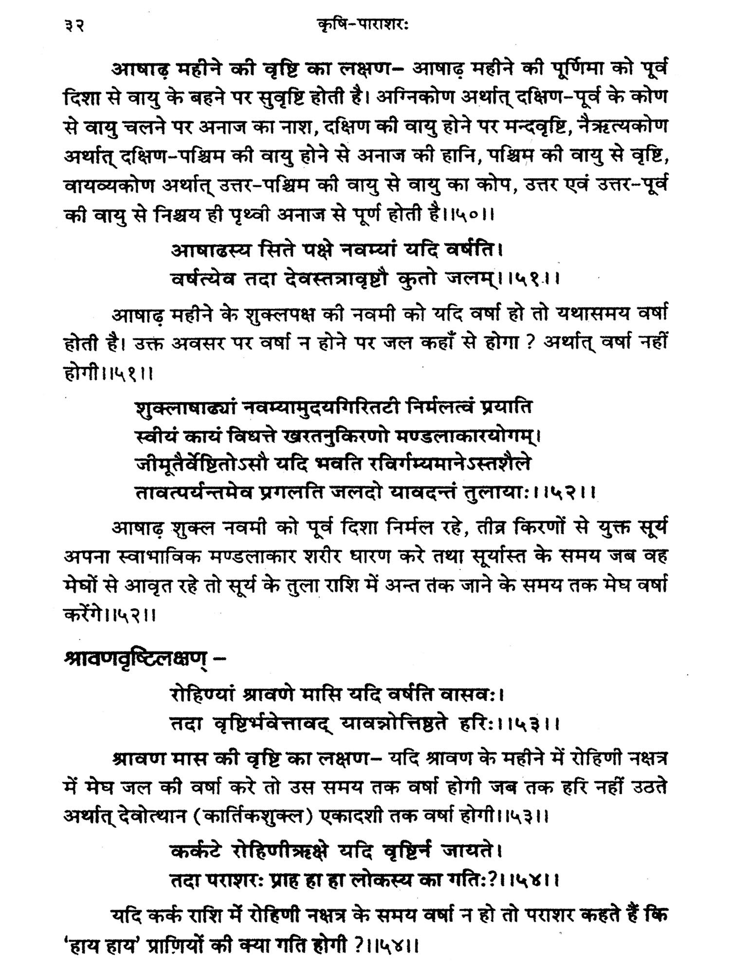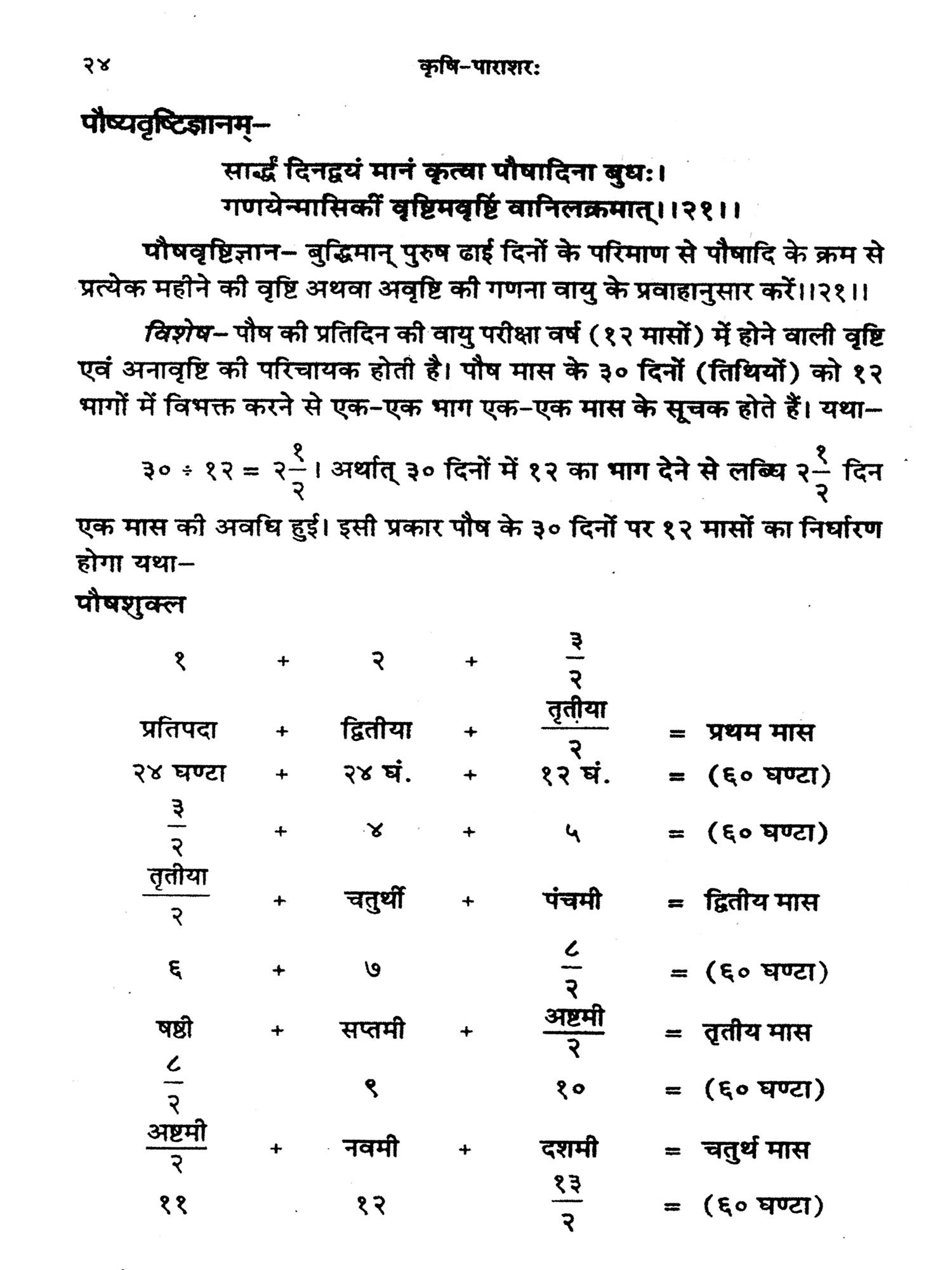 ७. ८. कृषि पराशर के आरम्भ में कृषि के लिए वृष्टि को अत्यन्त आवश्यक बतलाते हुए केवल एक मास (पौष) की वायु की दिशा और गति के आधार पर पूरे वर्ष में होने वाली वृष्टि का अनुमान करने की अद्भुत विधि दी गई है।