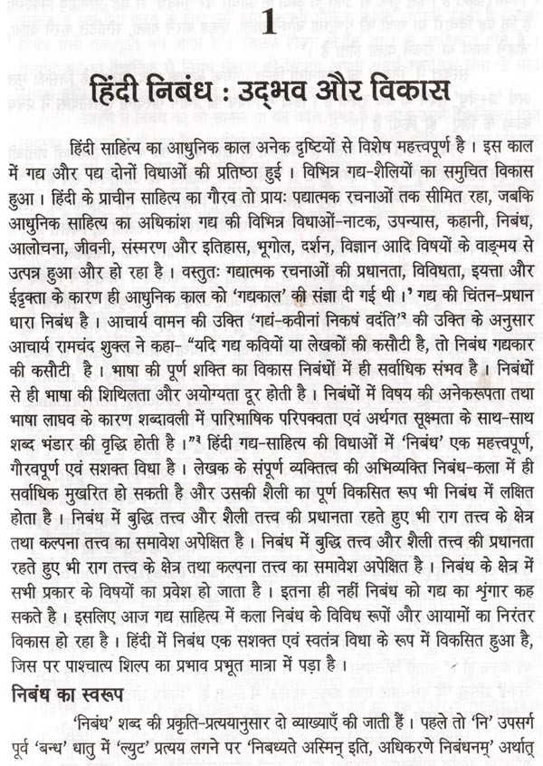 निबंध हिंदी साहित्य की अद्यतन श्रेष्ठ विधा है। इसका कारण यह है कि निबंध में काव्य जैसी रमणीयता, भावुकता एवं सरसता होती है, कहानी जैसा विनोदपूर्ण 'बतरस' होता है, नाटक जैसी गतिशीलता, अभिनेयता, संवादात्मकता एवं प्रभावान्विति होती है, जीवनी जैसा आत्मविश्लेषण, निजीपन एवं व्यक्तित्त्व की विवृत्ति होती है, संस्मरण जैसी विवरणात्मकता, निष्पक्षता, मार्मिकता एवं निजता होती है, रेखाचित्र जैसी चित्रात्मकता, आत्मानुभूति, मनोवैज्ञानिकता एवं कल्पना प्रवणता होती है। इतना ही नहीं निबंध को गद्य का श्रृंगार कह सकते है। पं. रामचन्द्र शुक्ल के कथनानुसार "यदि गद्य कवियों की कसौटी है, तो निबंध गद्यकार की कसौटी है।" इसमें संदेह नहीं कि निबंध में ही गद्य के सौंदर्य एवं माधुर्य का पूर्ण विकास होता है, निबंध में ही गद्य की अभिव्यंजना शक्ति का पूर्ण चमत्कार दृष्टिगोचर होता है और निबंध में ही गद्य की उक्ति वैदग्ध्य एवं अर्थ-दीप्ति के दर्शन होते है। अतः निबंध के स्वरूप को देखकर स्पष्ट हो जाता है कि साहित्य की अन्य विधाओं की अपेक्षा निबंध अभिव्यक्ति का अलग एवं अनोखा रूप है, इतना ही नहीं 'निबंध' साहित्य रूपी उपवन का सुगंधित पुष्प है, जिसमें लेखक के प्रौढ़ चिंतन का परिचय मिलता है।