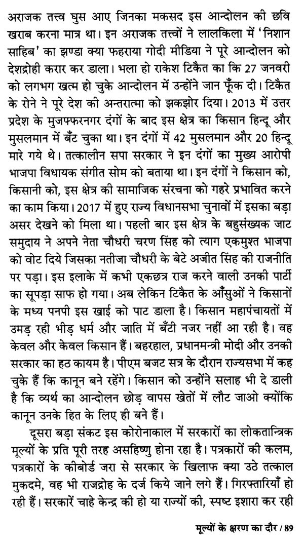 सूक्ष्म-शब्दजाल उन्मुख अकादमिक विमर्श और आसानी से समझ में आने वाले अखबारी लेखन के बीच अक्सर एक विभाजन रेखा बनायी जाती है। यह विभाजन रेखा हमारे बौद्धिक जुड़ाव के गिरते स्तर के मुख्य कारणों में से एक रही है। सार्वजनिक टिप्पणीकारों का एक वर्ग- जो अक्सर समाचारपत्रों और वेब पोर्टलों में योगदान करते हैं- गम्भीर शैक्षणिक कार्यों के प्रति उदासीन रहते हैं। यह उदासीनता उनके स्पष्टीकरण को उथला और सतही बनाती है। दूसरी ओर, शिक्षाविद् समकालीन प्रश्नों के महत्त्व को समझने में विफल रहते हैं। वे हमेशा सामाजिक मुद्दों का जवाब देने में देर करते हैं। अपूर्व जी के लेख इस सम्बन्ध में बेहद प्रासंगिक हैं। इन लेखों में सामाजिक मुद्दों की समीक्षा इस अन्दाज से की गयी है कि न केवल उस विषय की तात्कालिकता को स्पष्ट किया जा सके अपितु उसके व्यापक ऐतिहासिक प्रभाव को भी विश्लेषण की परिधि में बाँधा जा सके।