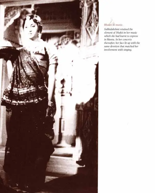 Equally memorable is her foray into films. Cast as Meera, Krishna's self-willed mortal consort. M.S. became the incarnation of the people's vision of this saint-poet - an identity she would willingly embrace at the behest of her husband.