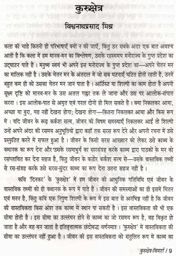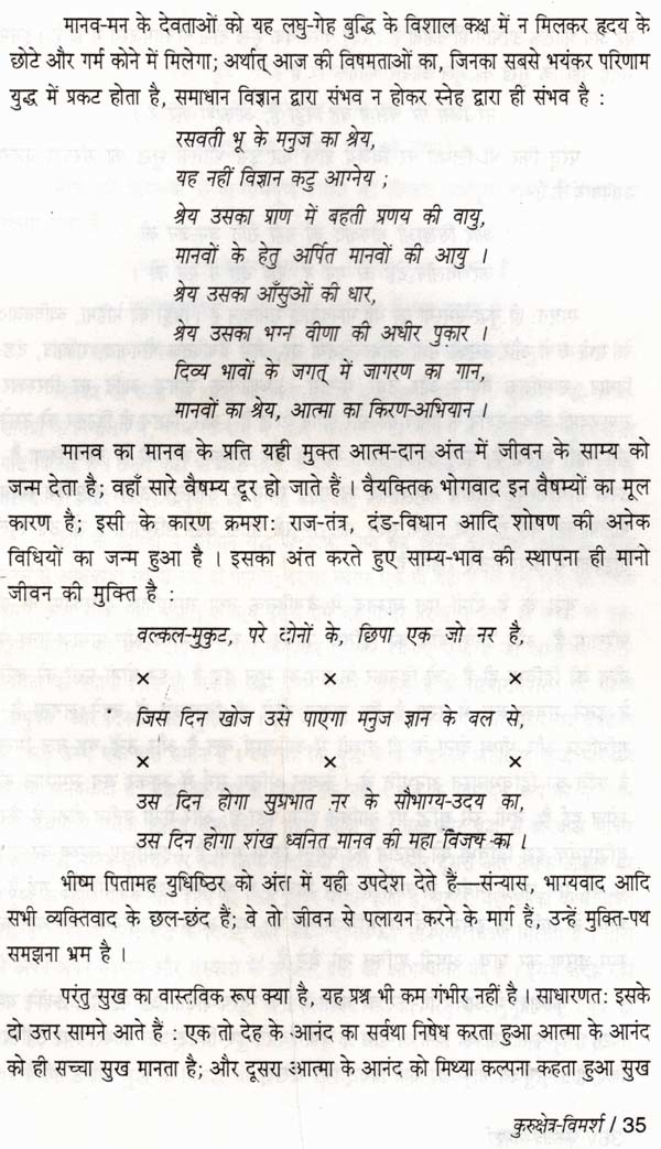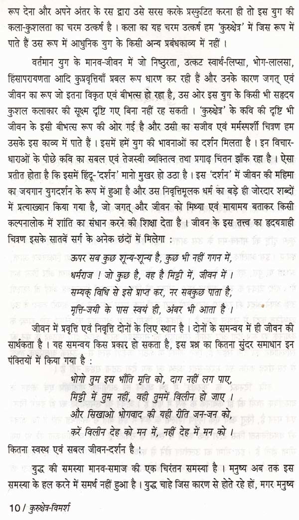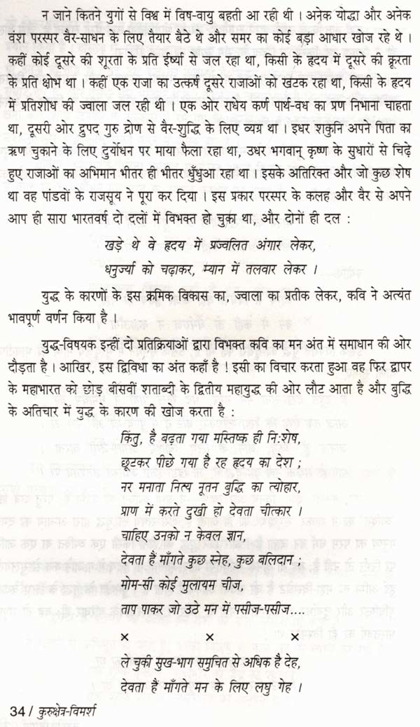 ये पंक्तियाँ दिनकर के मानस को पूरी तरह से खोलकर पाठकों के सामने रख देती हैं। कवि संक्रांति-काल का है, एक मूल्य-संघर्ष में पड़ा हुआ, स्थापित आदर्शों के प्रति द्वापर अर्थात् संदेह से भरा हुआ। अपनी समस्या का समाधान पाने के लिए वह महाभारत तक जाता है, लेकिन वहाँ भी वही हाल है, आग की लपटें उठ रही हैं...। समस्याएँ तो अनेक हैं, लेकिन जो मनुष्यता की सबसे बड़ी समस्या है और जो कवि को पागल बनाए हुए है, वह युद्ध से संबंधित है। महाभारत युद्ध-काव्य ही है और उसमें युधिष्ठिर तथा भीष्म-जैसे ज्ञानी और विचारवान् चरित्र हैं, इसलिए कवि का उसकी तरफ उन्मुख होना स्वाभाविक था। समस्या चूंकि बुद्ध की है, जो भावुकता का नहीं, विचार का विषय है, इसलिए आश्चर्य नहीं कि 'कुरुक्षेत्र' को विचार-काव्य माना गया और प्रायः उसी दृष्टि से इस पर विचार किया गया।