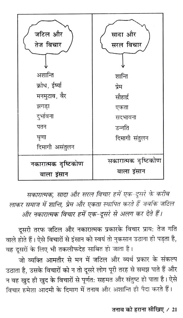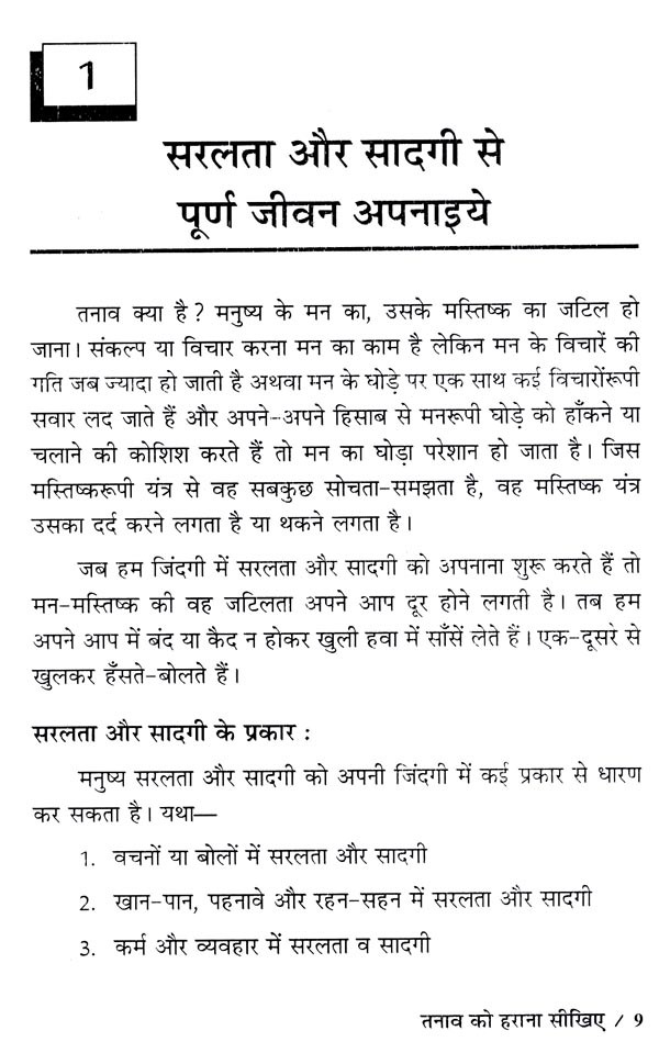 शान्त और खुशहाल जिंदगी जीने के लिए तथा जिंदगी में तरक्की प्राप्त करने के लिए यह जरूरी है कि हम तनाव से हमेशा मुक्त होकर रहें। लेकिन तनाव एक ऐसी बला है, जो अपने आप हमको मुक्ति प्रदान नहीं करती बल्कि हमें खुद कोशिश और मेहनत करके तनाव से मुक्ति हासिल करनी होती है।... इसके लिए पहले तनाव के स्वरूप को गंभीरता से समझना जरूरी है। तनाव हमारे पास किन-किन कारणों से, किन-किन स्रोतों से आया है, उसे समझना जरूरी है। यद्यपि तनाव के रूप-स्वरूपों की विस्तृत चर्चा हमने अपनी अगली पुस्तक 'तनाव-प्रबंधन' (Stress-Management) में की है लेकिन इस किताब में तनाव को हराने के कुछ ऐसे सिद्धान्तों और तरीकों की चर्चा अवश्य की है, जो तरीके हमारी सामान्य (व्यावहारिक) जिन्दगी से गहरे रूप से जुड़े हुए हैं। ये वे तरीके हैं, जो इंसान को खुद को समझने में तथा दूसरों को समझने में सहायता प्रदान करते हैं।