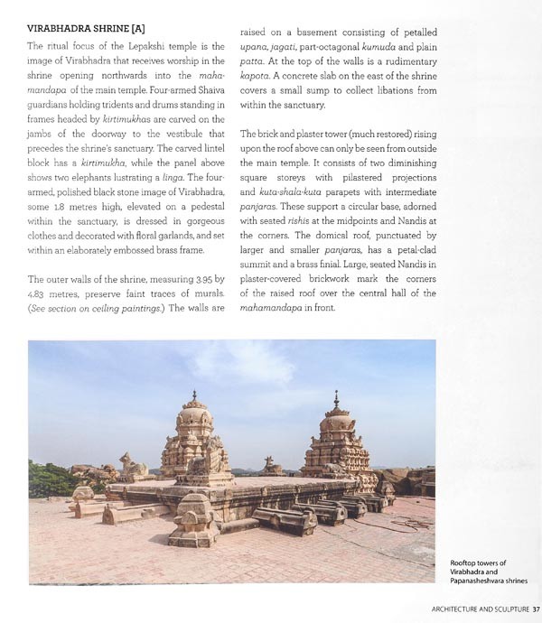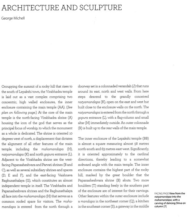 The great temple that crowns a rocky rise overlooking the small town of Lepakshi in southwest Andhra Pradesh must be regarded as one of the most architecturally magnificent and artistically refined Hindu monuments of the sixteenth century in southern India. Dedicated to Virabhadra, a fierce form of Shiva, the Lepakshi temple is of outstanding interest for its beautiful stone carvings and painted ceilings, among the finest and best-preserved examples of these arts from the Vijayanagara era. Located 15 kilometres along a minor road off National Highway 7. Lepakshi is now attracting increasing numbers of visitors from Bengaluru and Hyderabad. Hence the need for a thorough description and explanation of the temple's wonderful sculptures and paintings. In the first part of the volume, which serves as an introduction, the authors consider the religious background to the Lepakshi temple, drawing on current beliefs, practices and illustrations of popular legends, as well as the available historical data gleaned from ancient inscriptions, for which summaries are given. Here, too, they situate the monument within the architectural and artistic context of the period. The second part of the volume describes the overall layout of the temple, and then directs readers through the monument, beginning with the Virabhadra shrine and ending with features in and beyond its outer enclosure. Here, the most important architectural attributes and sculptures are all described. The ceiling paintings that are the glory of Lepakshi form the subject of the volume's third part. These are fully illustrated and the divine and human figures in the various narratives identified. In the fourth part, the costumes and textiles depicted in the paintings are shown to be representations of contemporary cloth designs and manufacturing techniques. The volume concludes with a glossary, bibliography and index.