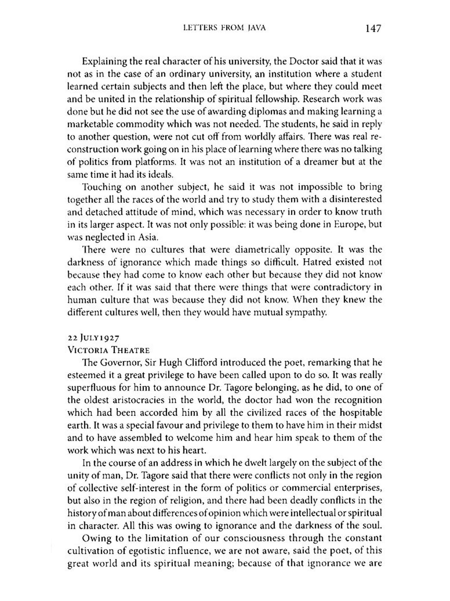 I have had a pamphlet sent me by a distinguished American artist who spent three years of his life in Bali, an island near Java. Some remnant of Old India remains stranded in that lonely place for centuries. Its voice comes to me across the sea mingled with the murmur of lovely palm groves. Why not pay a visit to that prisoner of time and see if it has a language that I dimly understand?