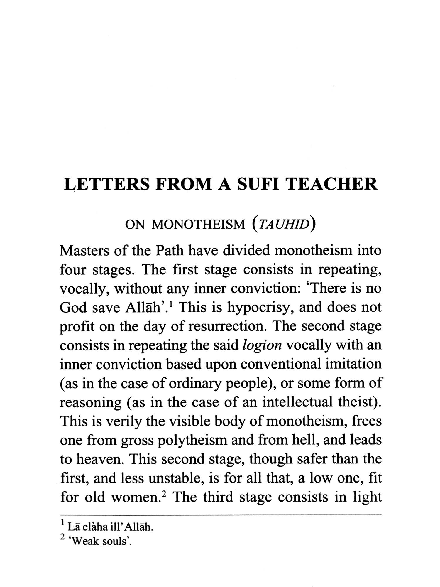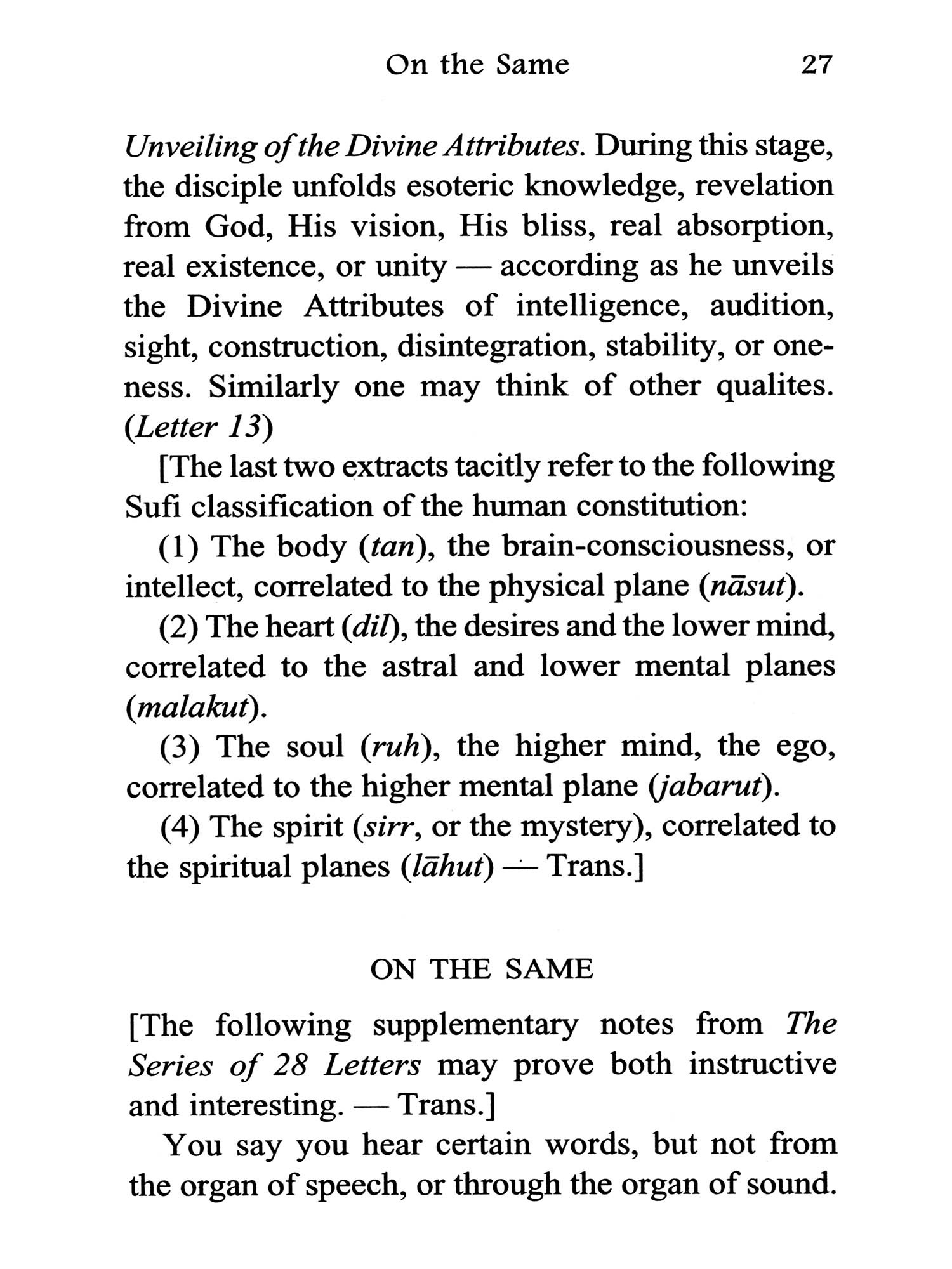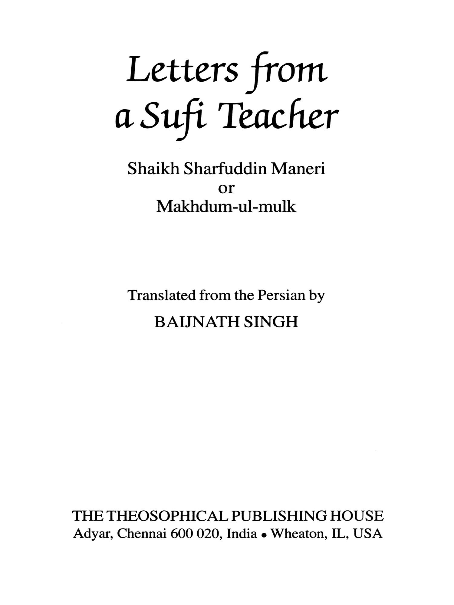 The present booklet consists of the translation of copious extracts from Maktubat-i-Sadi, the most elaborate and comprehensive of the three published works, with notes occasionally added from the other two with a view to elucidate or complete the subject in hand. These extracts, it is hoped, will cover the greater part of, if not all, the principles inculcated in these books, and are expected to give the reader a fair knowledge of the teaching of the author in all its phases. Matters relating to mere exoteric rites, legends and traditions have been omitted. The translation does not pretend to be always very literal, but an honest attempt has been made to present a faithful rendering of the original to the English-speaking public, that they may be able to appreciate better the teachings of Islam, and that the Brotherhood of Creeds may have one more advocate to plead its cause before the tribunal of the human intellect.