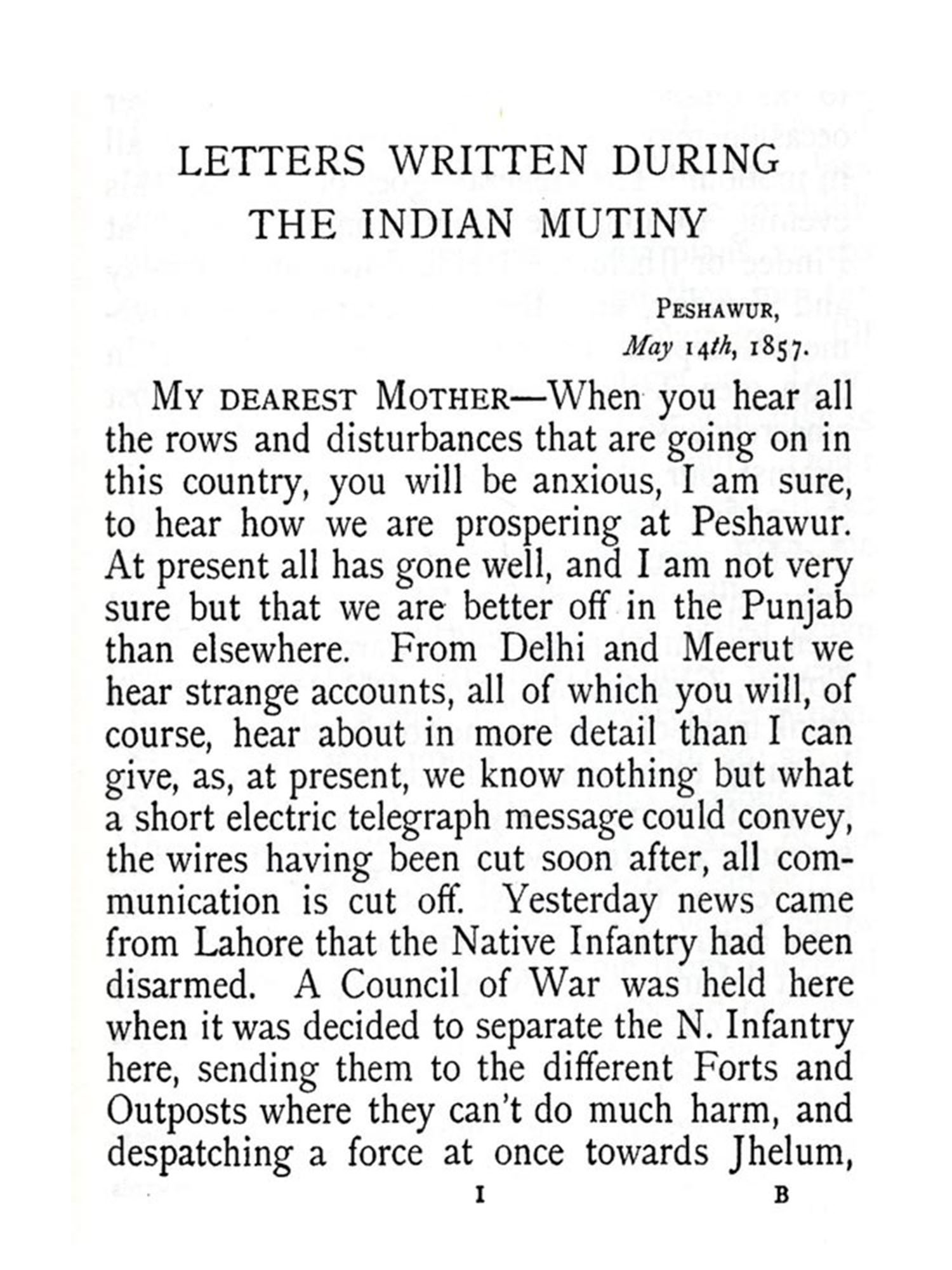 Since his death a packet of letters, labelled in his own handwriting "Letters written during the Mutiny by Fred. Roberts," has come to light. In these letters, thirty in number, is to be found the story of his personal experiences and adventures during the stirring days of 1857-58 as told to his father, mother, and sister. The first was written just as the earliest news of the disturbances at Meerut and Delhi reached him at Peshawar, and although it is evident that one or two are missing-not to be wondered at when the disturbed state of the country is borne in mind, -the majority reached their destination, and they tell their tale almost uninterruptedly to the day when he is able to give his family the joyful news that his leave has been sanctioned and that he is starting for home.