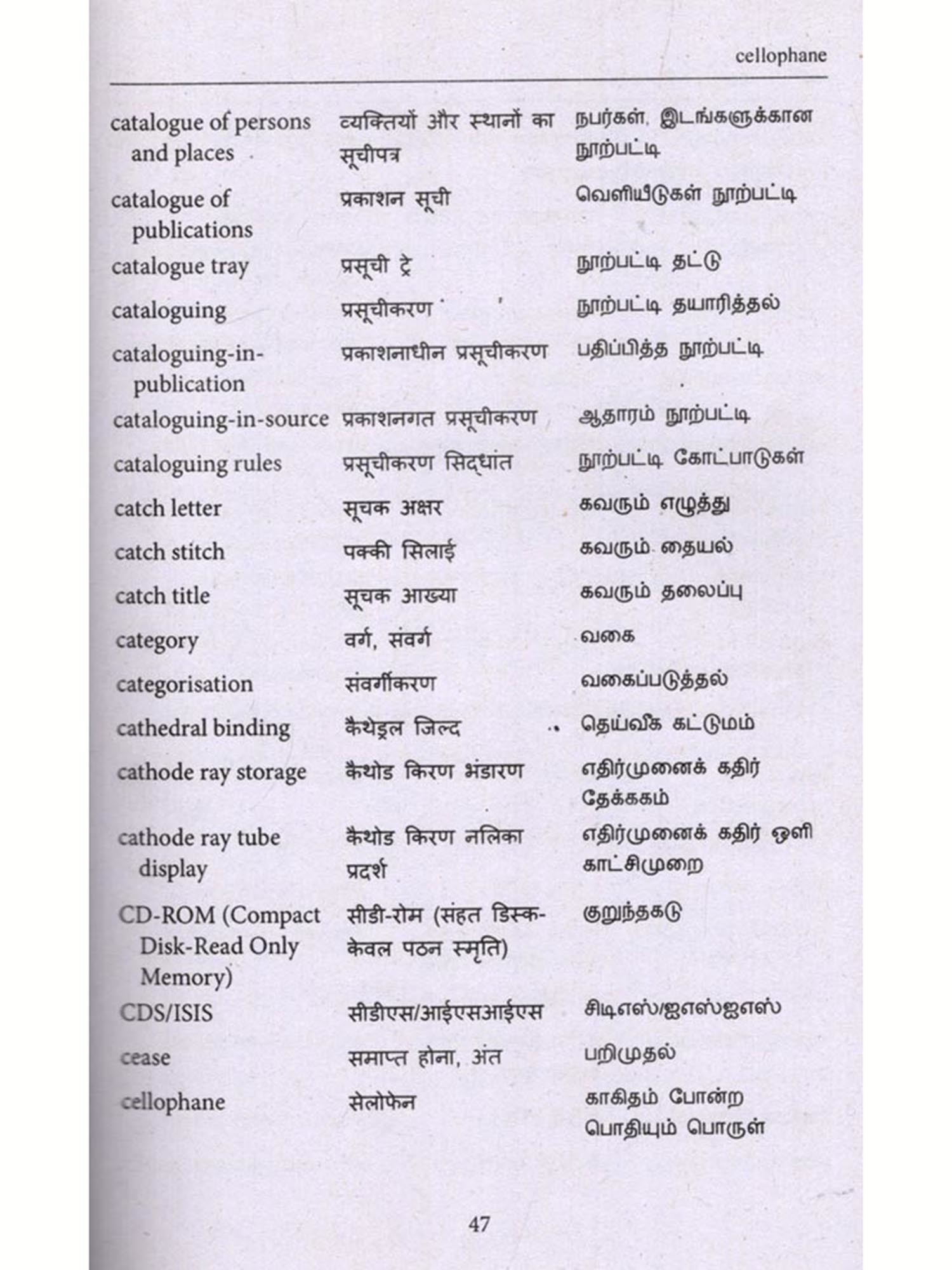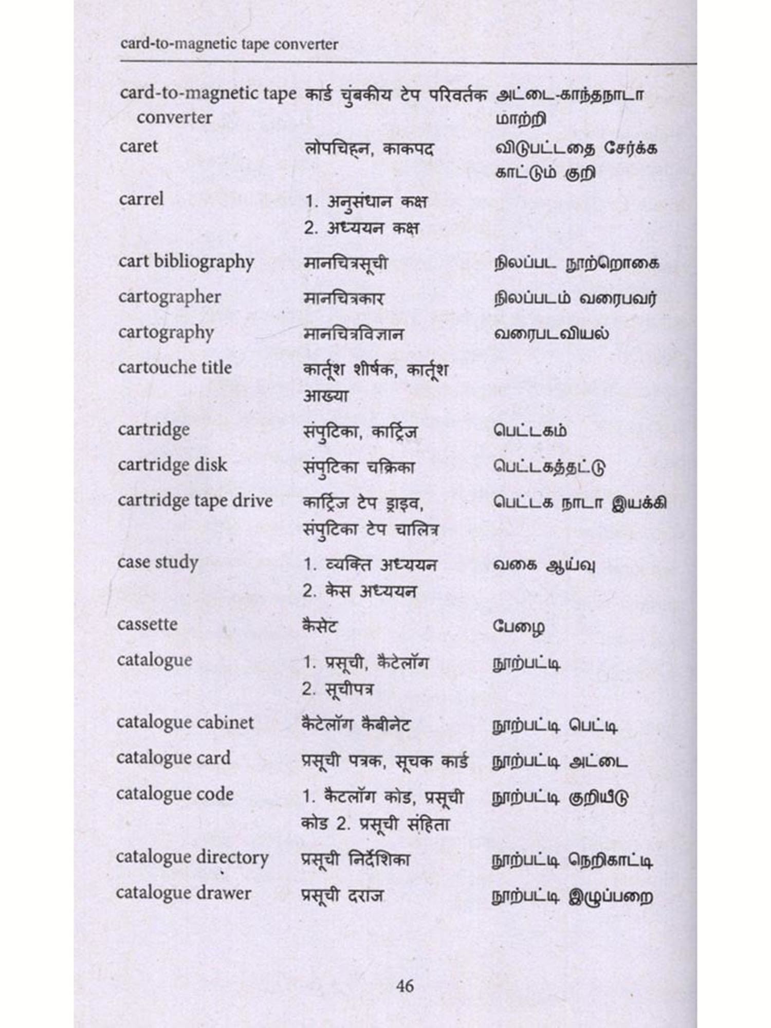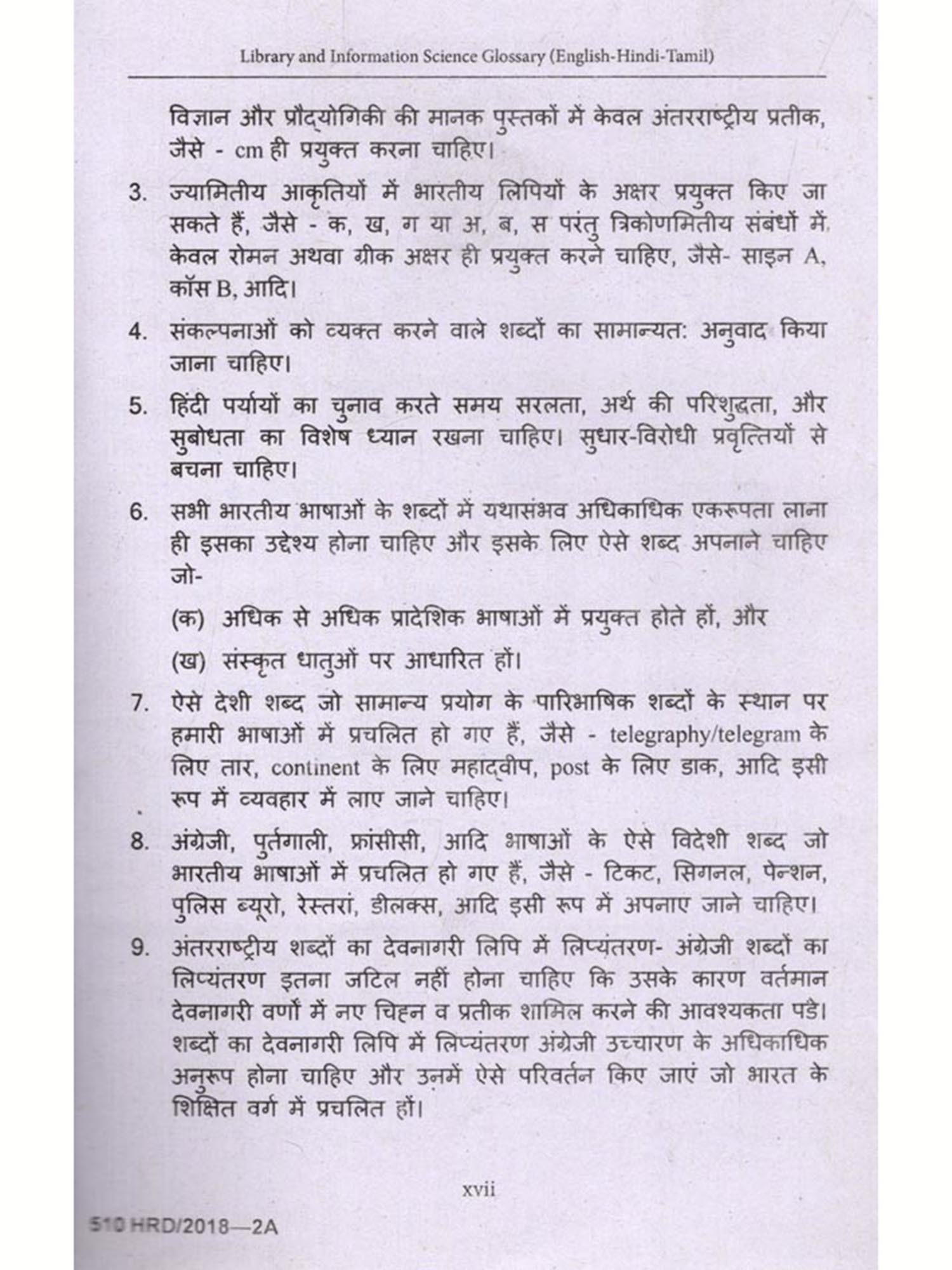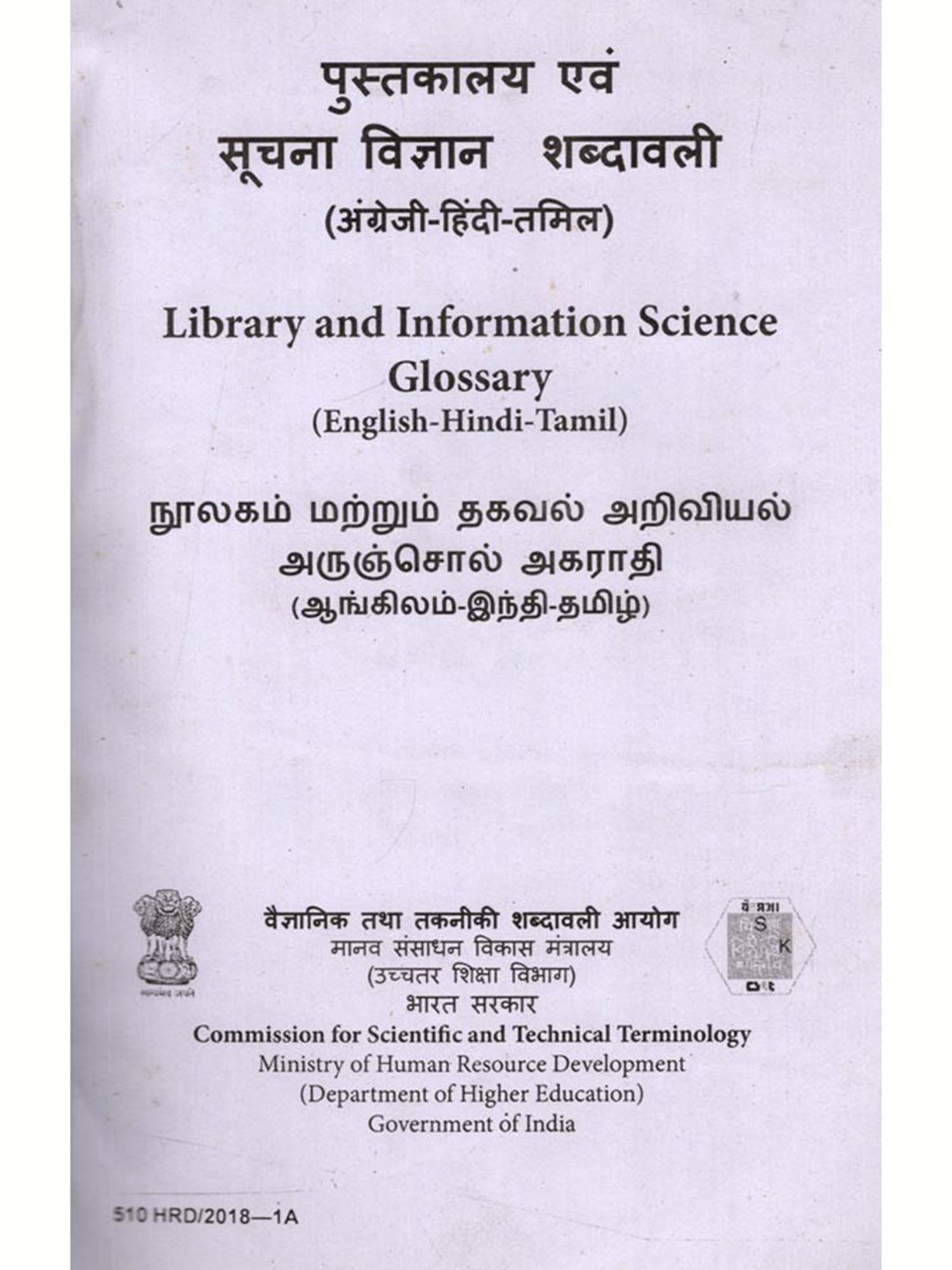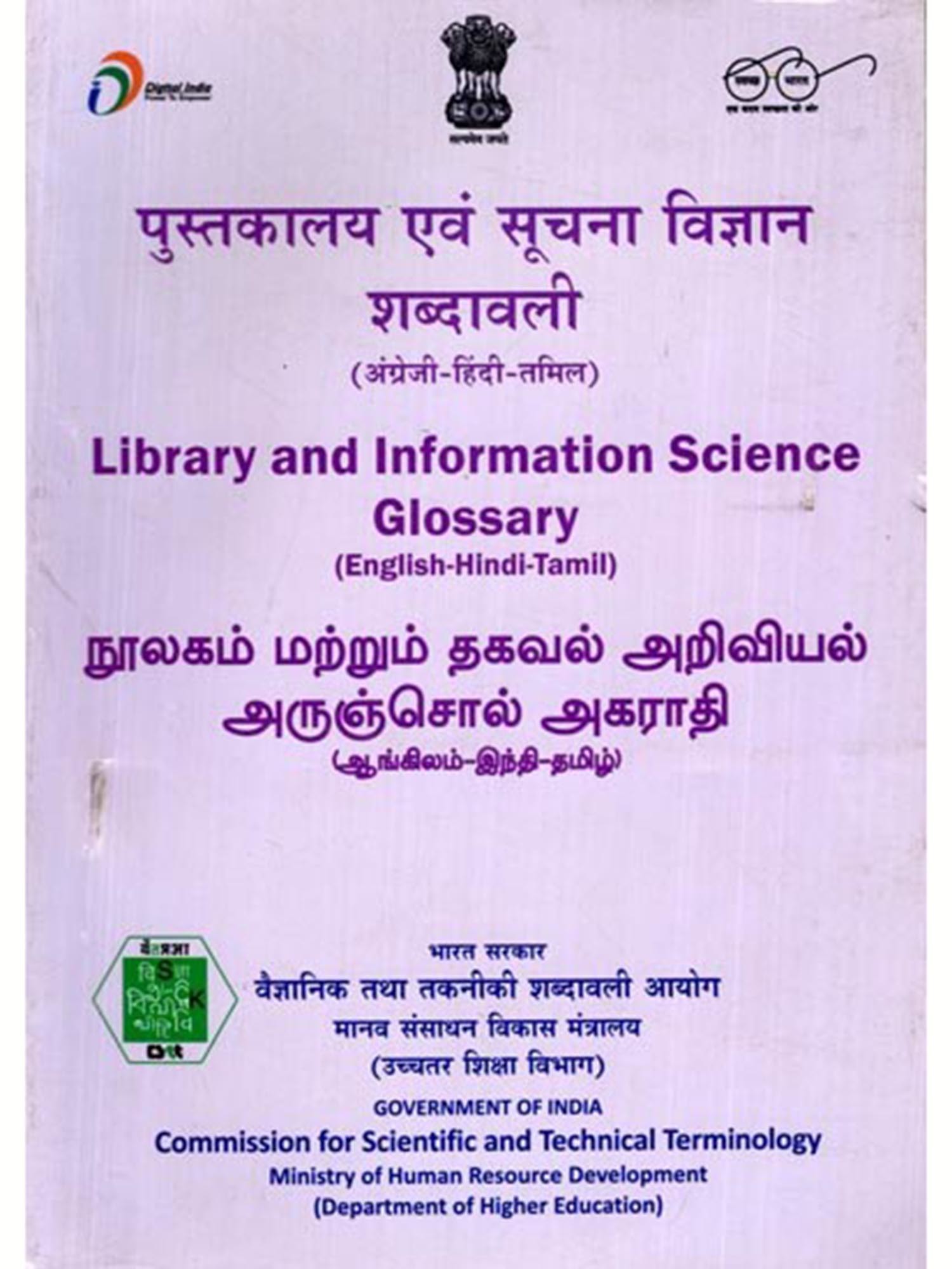 India is a multilingual country and its treasure of knowledge is available in Sanskrit and Hindi alongwith all other Indian languages. Therefore, CSTT has already published glossaries, definitional dictionaries, university level text books in various subjects in Hindi and other Indian languages as Economics (English-Bodo), Medical (English-Odia), History (English-Orria) etc and simultaneously the works in other Indian languages in various subjects like Assamia, Telugu, Santhali, Manipuri, Punjabi, Gujarati is going on. The objective of the CSTT is to prepare glossaries, definitional dictionaries, study material in all other Indian languages. Keeping in view of these objectives, CSTT started preparing glossaries, definitional dictionaries in other Indian languages also. Under this scheme, the Glossary of Library and Information Science in Tamil language is being published.
