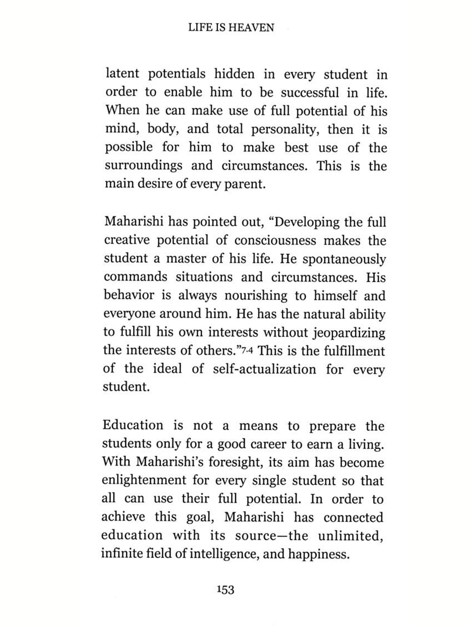 Maharishi's programs bring perfection to individual and national life by reuniting all the areas of life to their source which transcends material existence-the unified field out of which all the laws of nature and sub-atomic particles emerge according to modern science. Enlivening the connection with the source of life the source of infinite peace, energy, intelligence, and creativity-brings out the infinite bliss within everyone and creates fulfillment in every area of life.