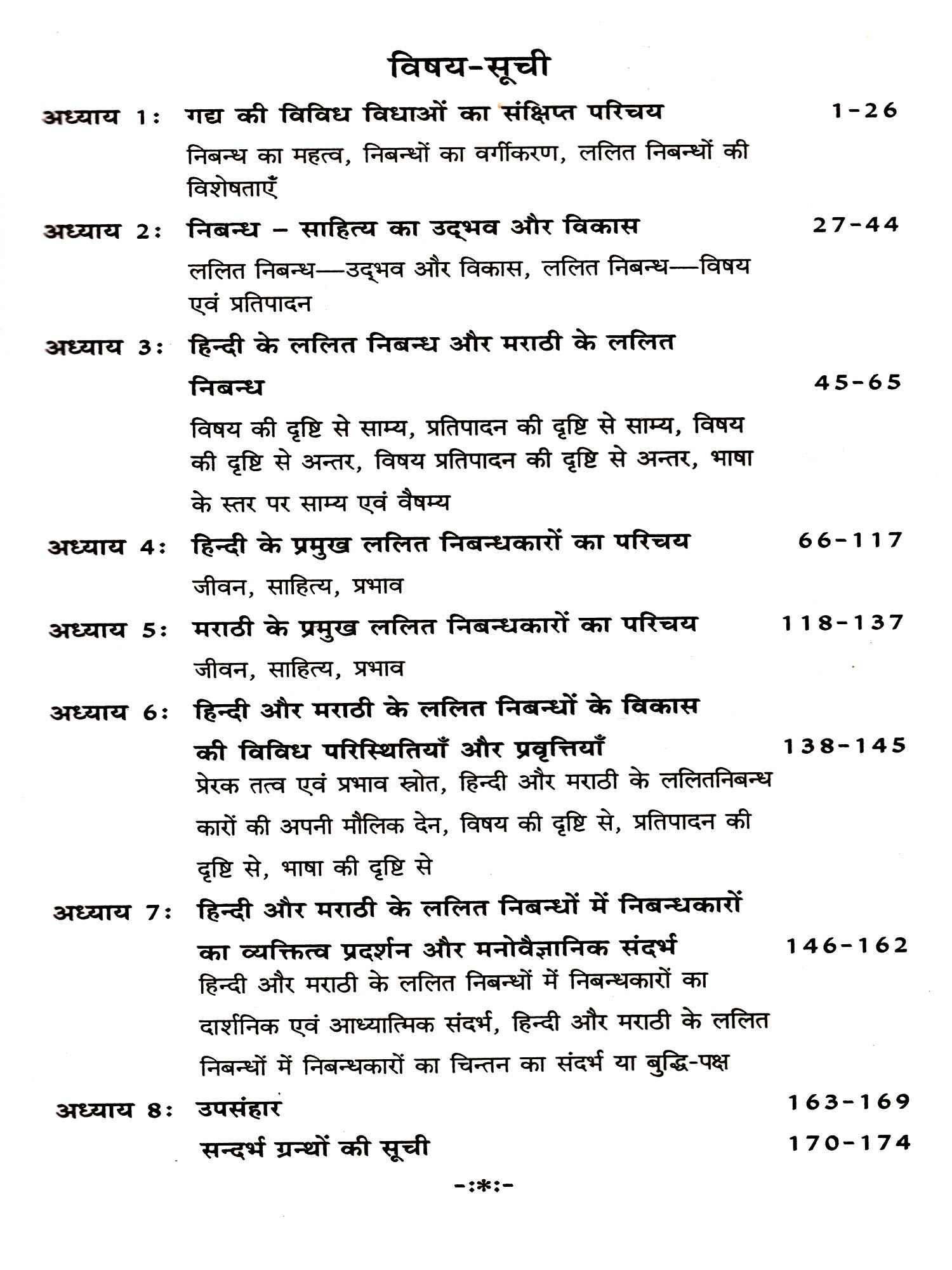 पाँचवे अध्याय में हमने समानान्तर रूप से मराठी के प्रमुख ललित निबंधकारों का परिचय देते हुए उनके जीवन साहित्य और उनके साहित्य पर पड़े विशिष्ट प्रभावों को आकलित किया है। वस्तुतः अन्य भारतीय भाषाओं की तरह मराठी में भी निबंध साहित्य की शुरूआत अंग्रेजी सत्ता के पूर्णतः प्रस्थापित हो जाने के बाद ही हुई है। अतः छठे अध्याय में हमने हिन्दी और मराठी के ललित निबंधों के विकास की विविध परिस्थितियों एवं प्रवृत्तियों का विश्लेषण और मूल्यांकन किया है।
