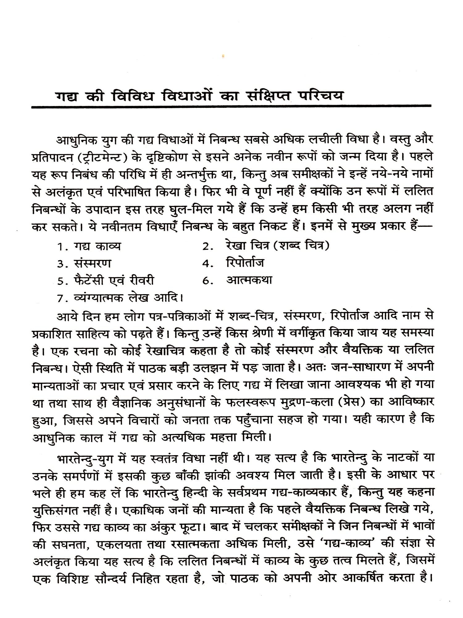 प्रस्तुत शोध ग्रंथ सात अध्यायों में प्रसूत है। पहले अध्याय में गद्य के विविध विधाओं का सक्षिप्त परिचय देते हुए निबंध के महत्व उनके वर्गीकरण के साथ ललित निबंधों की विशेषताओं पर प्रकाश डाला गया है। निबंधों के शिल्प पक्ष पर विशेष विचार आये हैं किन्तु वैयक्तिक निबंधों ने पाठकों का ध्यान विशेष आकृष्ट किया है तथापि गवेषणात्मक दृष्टि से उसका पक्ष अभी अधूरा है। ललित निबंध में लेखक अपनी स्पष्टता अपनी सादगी और सरलता के बल पर संस्मरण सुनने या यात्रा का आनंद देता है। उसकी किस्सागोयी, लतीफागोई और यायावरी वृत्ति पाठकों का विशेष रंजन करती है। हमने इन विशेषताओं को दोनों भाषा के साहित्य में लक्षित किया है।