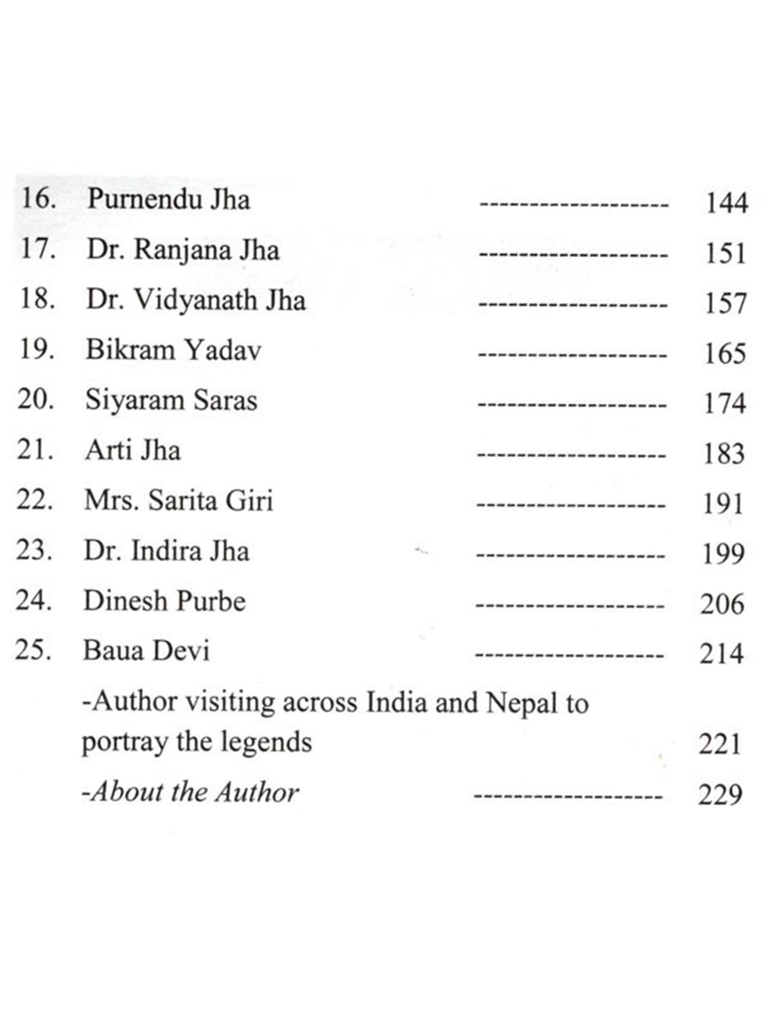 The anthology book titled "The Living Legends of Mithila -Part-2" featuring 25 legends is an exceptional work that highlights an array of prominent personalities from different fields of life bringing forth their manifold traits such as their individual achievements, their distinctions in various settings, their literary acumen, their internationally acclaimed diplomatic merit, their contributions to the domain of education and further afield, their meteoric rise in the political arena, their artistic and creative excellence, their yeoman services to the fields of health care and research, their scintillating performances in serving the society in a selfless manner and their stellar reputation as figures of top quality nature.