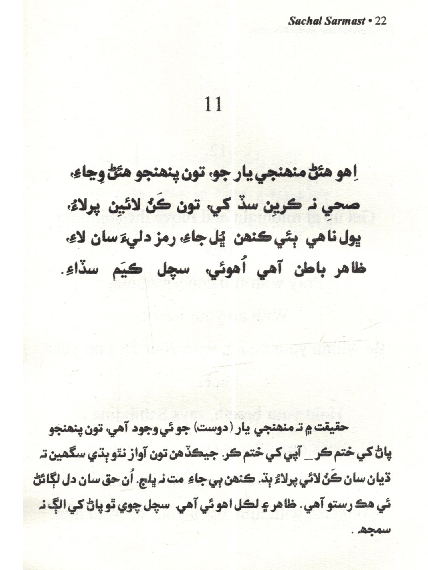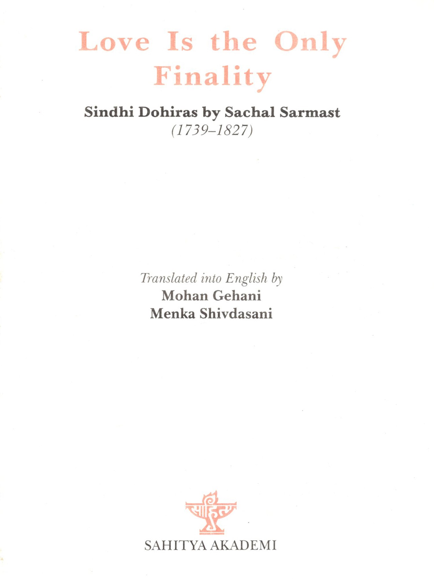 Sachal Sarmast (1739-1827), ('the divinely intoxicated') was a Sufi mystic poet who composed poetry in five languages-Sindhi, Saraiki, Persian, Punjabi and Urdu. Born in 1739, he is considered next only to Shah Latif as part of the Holy Trinity of Sindhi literature, which also includes Sami. In a world that is rent with hatred, strife and extremist polarity even as it has entered a space age that does not recognise boundaries, the Sufi ethos and value structure continue to be relevant. More than three centuries ago Sachal had declared: "I feel Ram and Rahim as one. Enjoy the happiness of Love/ Distinctions between/ Believers and non-believers are futile Reject the sense of otherness. These translations of Sachal's dohiras from the original Sindhi, which speak of true Sufi thoughts, are an important reminder of the need for mankind to live in harmony and unity in a deeply divided world.