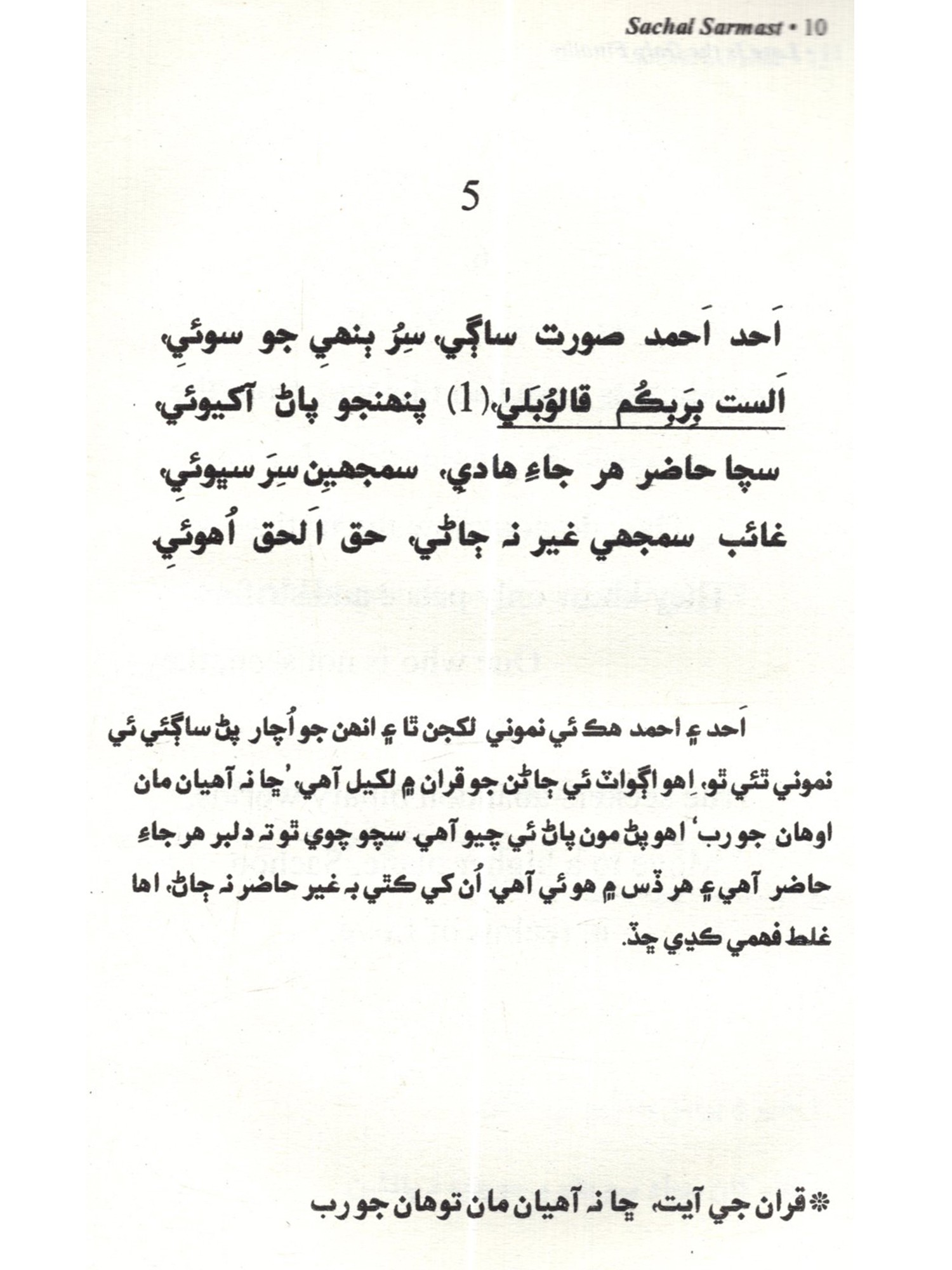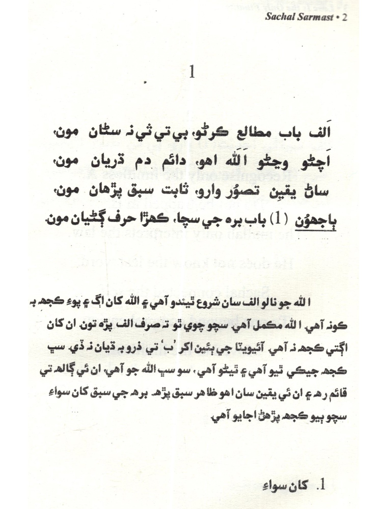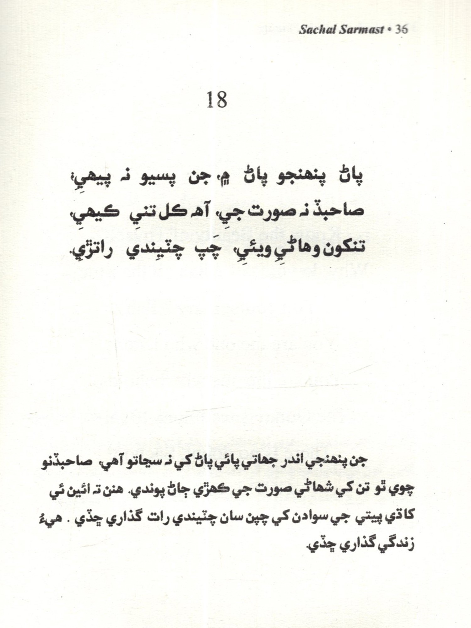 Sachal, a Sufi mystic poet, was born in 1739 and named Abdul Wahab Farooqi at birth. Orphaned at a young age when his father, Faqir Salahuddin passed away, he was brought up by his uncle, Faqir Khawaja Abdul Haq, who educated him in all worldly matters and was his preceptor and spiritual guide; Sachal considered his uncle his Murshid, or religious teacher, all his life. Sachal, who lived to the ripe age of 90 years and died in 1827, was highly educated and fluent in many languages. He knew Arabic very well and composed poetry in five languages i.e. Sindhi, Saraiki, Persian, Punjabi and Urdu. His 'Diwan' (Diwan Aashkara) of Persian Ghazals was published by the then ruler of Khairpur H. H. Ali Murad Khan Talpur. Known as Sachal "Sarmast'-which may be roughly translated as 'divinely intoxicated' - Sachal is considered only next to Shah Latif in Sindhi literature. Here it would not be out of place to delve a little deeper into the philosophical core of Sachal's poetry. It is acknowledged that humans assumed their present form about 1,00,000 years ago. For more than 90,000 years they have remained as hunters and food gatherers but bewildered by their relationship and status in the natural world. Human beings are in awe of nature but still have the capacity to tame it and harness its energies for their benefit. Humans have also moved across the globe many times over in search of food. All this has induced latent anxiety and a sense of insecurity. They have sought to address that insecurity by invoking nature as an ally, conceiving of the supernatural in the form of God, to whom one can turn in an hour of need, and who would be an enormously powerful force. That is the foundation stone of all religions that have sprung up over time. Broadly speaking, religion has been presented at two different levels the world over. At the ritualistic level, God needs to be propitiated by observing rites and sacrifices. At the other level, there are seekers who probe the supernatural to know the nature of Truth itself. The aspect of ritual observances has been in the realm of the priestly class, which, over time, has organised itself on hierarchal lines. In the Hindu religion, it has been characterised by the Brahminical priestly class and in Islam, it is the Mullah, Maulvi, Qazi and others of the same ilk who have taken it upon themselves to interpret enforce 'true' religion. Ascetics and true seekers follow a different path; the philosophers and seers seek knowledge. It has been observed that in History there have been periods where the political establishment and priestly establishment have formed an exploitative and oppressive alliance that results in the misery of the masses. In such cases, philosophers and other spiritual seekers emerge to challenge such forces. In the case of Hinduism, it was the Bhakti cult that resulted in eliminating the priestly class and establishing a direct relationship between the deity and devotee. In Islam, it was the Sufi saints and Sufi philosophy that rose in revolt against the priestly establishment. There were many instances when Sufi saints were punished with death by the religious establishment. Yet, since it was the voice of the mute multitude, it spread widely in Persia and Western India. In the Indian context, both trends often merged as according to the Upanishads and Advaita Vedanta thought, the seeker ultimately declares Aham Brahmasmi. ('I am that Ultimate') and Sufi saints also declared 'In Al Haq' - 'I Am That Truth." The time when Shah Abdul Latif and Sachal emerged in Sind was one of external invasions, turmoil, and strife leading to untold misery to Hindus as well as Muslims alike. At the same time, the axis of local chieftains and religious establishment wrought unprecedented tyranny and misery for the common people. In such a situation, Mullahs, Maulvis and others connected with the traditional and orthodox religious establishment became hated figures. In this scenario, Sufi saints brought a whiff of freedom and solace and voiced their latent feelings, which struck a responsive chord with the mute multitude.