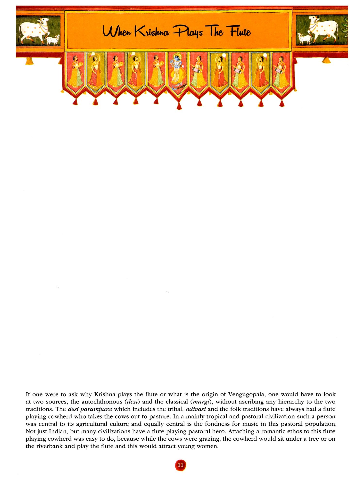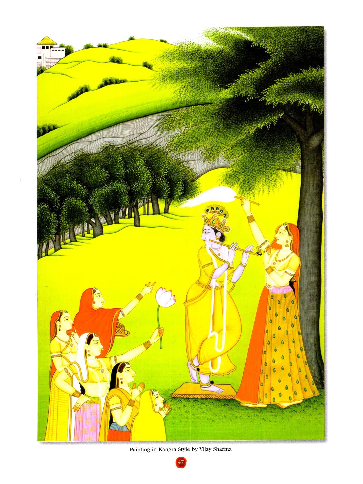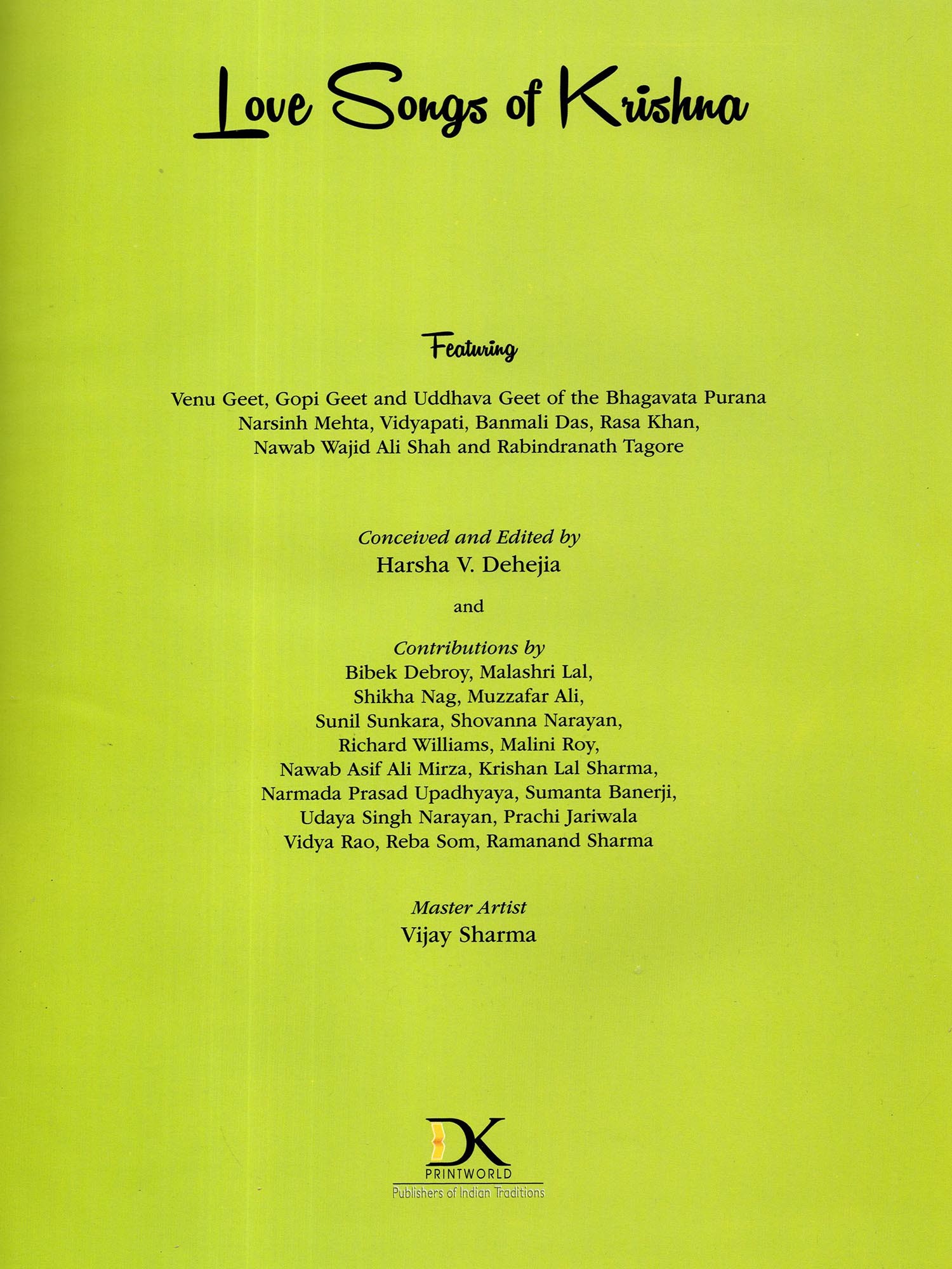 The shringara rasa of Krishna or the sensual and romantic love of Krishna finds a textual basis for the first time in the ninth century Bhagavata Purana. From then for a thousand years, poets and potters, chitrakars and sangeetkars, have celebrated this love in their artistic expressions. This book is a select compilation of these songs from the Bhagavata Purana, Narsinh Mehta, Vidyapati, Banmali Das, Rasa Khan, Nawab Wajid Ali Shah and Tagore. Each of these poets are touched by the sheer sensuality of the love of Krishna for the gopis and Radha and have expressed it in sonorous and mellifluous words. For the first time these poetic treasures have been transformed into gem like miniature paintings, so that one can resonate with the other. Krishna's message of madhurya is both shravya and drishya (heard and seen) in this book. Come, let us sit under the Kadamba tree, and listen to these songs and in them we are bound to hear the flute of Krishna.