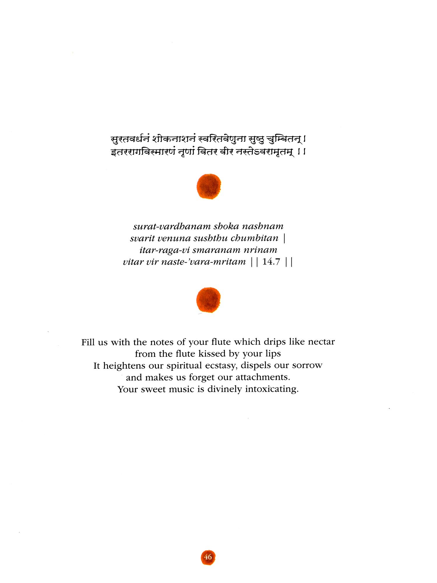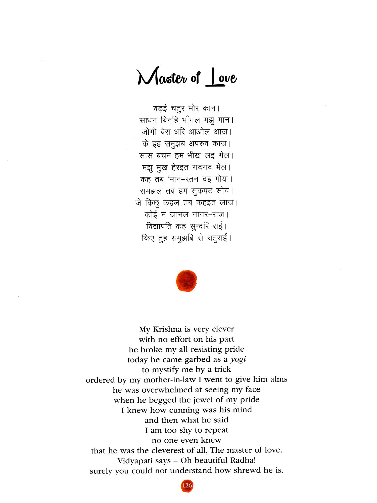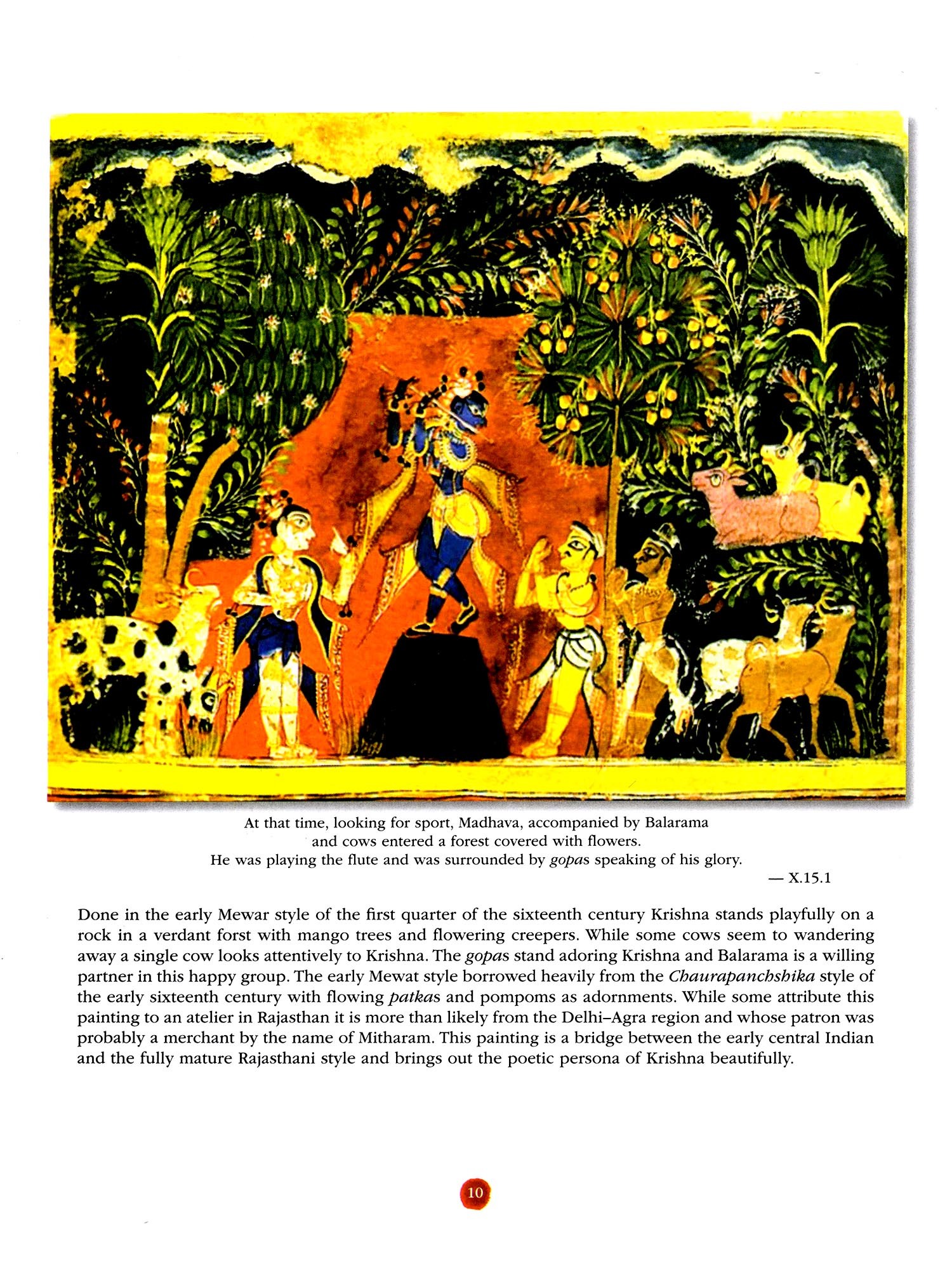 The shringara rasa of Krishna or the sensual and romantic love of Krishna finds a textual basis for the first time in the ninth century Bhagavata Purana. From then for a thousand years, poets and potters, chitrakars and sangeetkars, have celebrated this love in their artistic expressions. This book is a select compilation of these songs from the Bhagavata Purana, Narsinh Mehta, Vidyapati, Banmali Das, Rasa Khan, Nawab Wajid Ali Shah and Tagore. Each of these poets are touched by the sheer sensuality of the love of Krishna for the gopis and Radha and have expressed it in sonorous and mellifluous words. For the first time these poetic treasures have been transformed into gem like miniature paintings, so that one can resonate with the other. Krishna's message of madhurya is both shravya and drishya (heard and seen) in this book. Come, let us sit under the Kadamba tree, and listen to these songs and in them we are bound to hear the flute of Krishna.