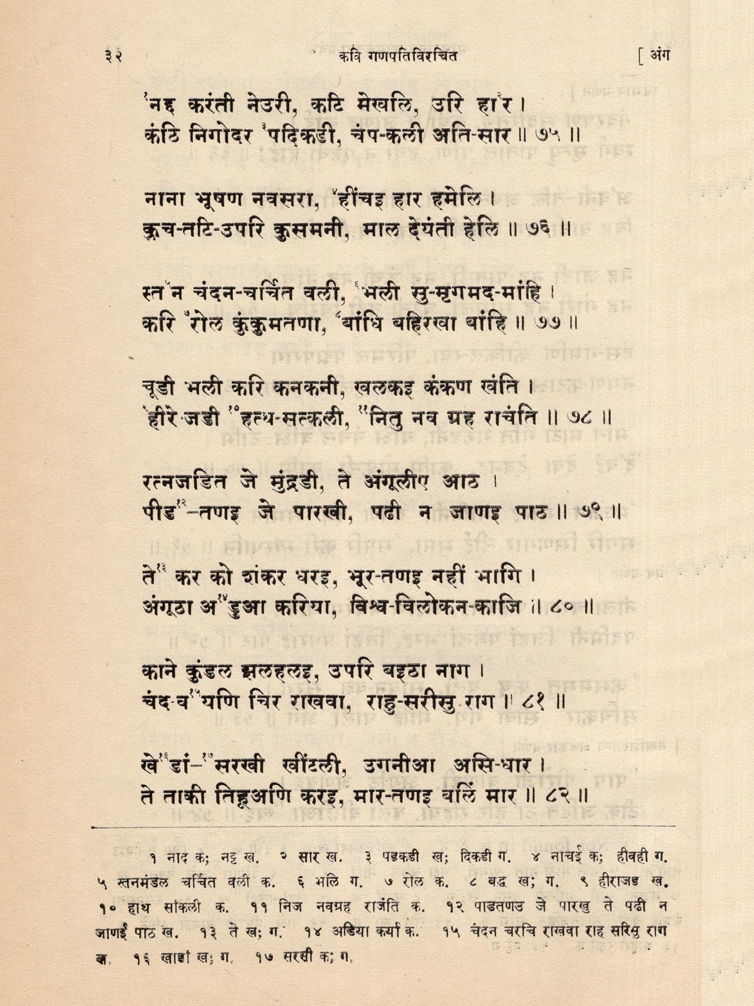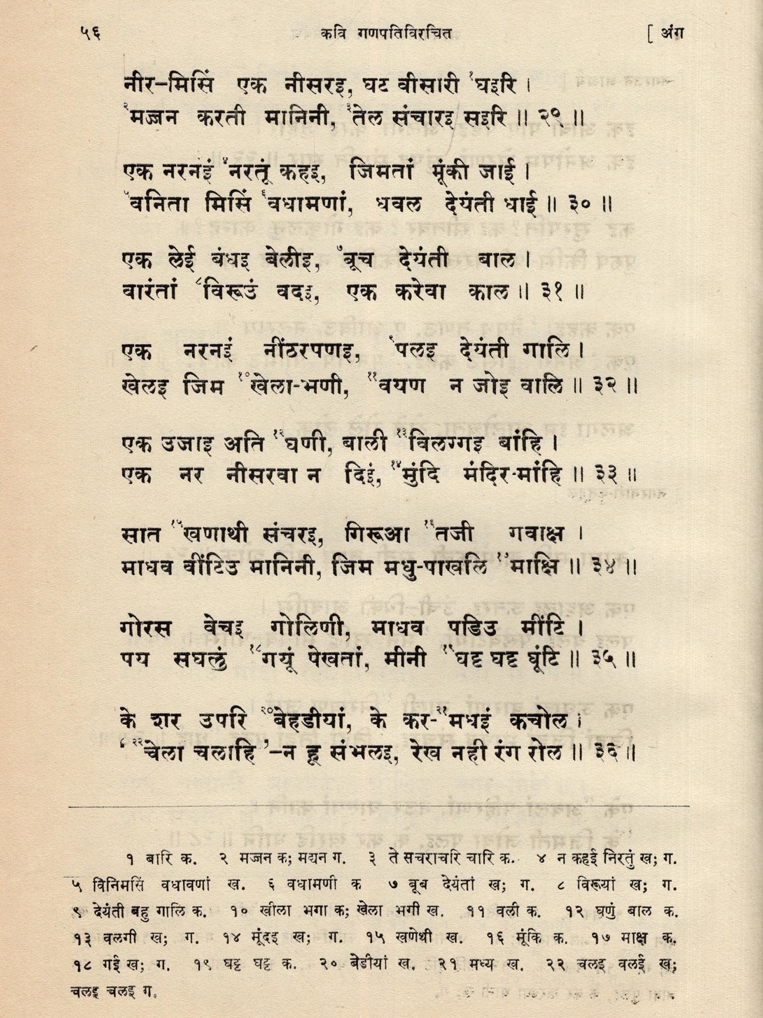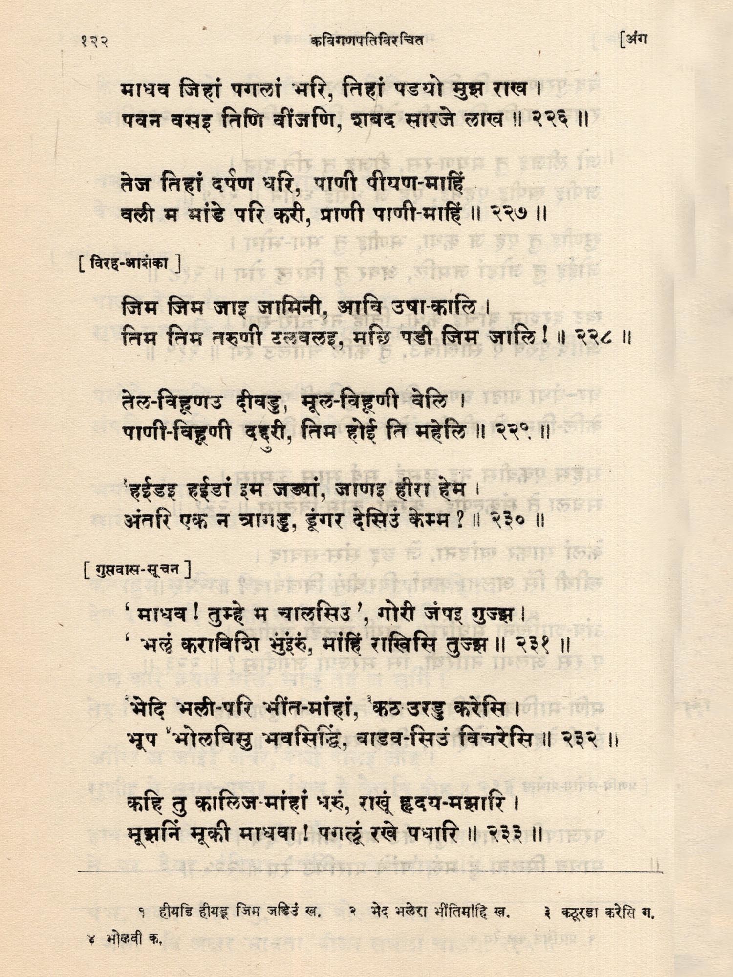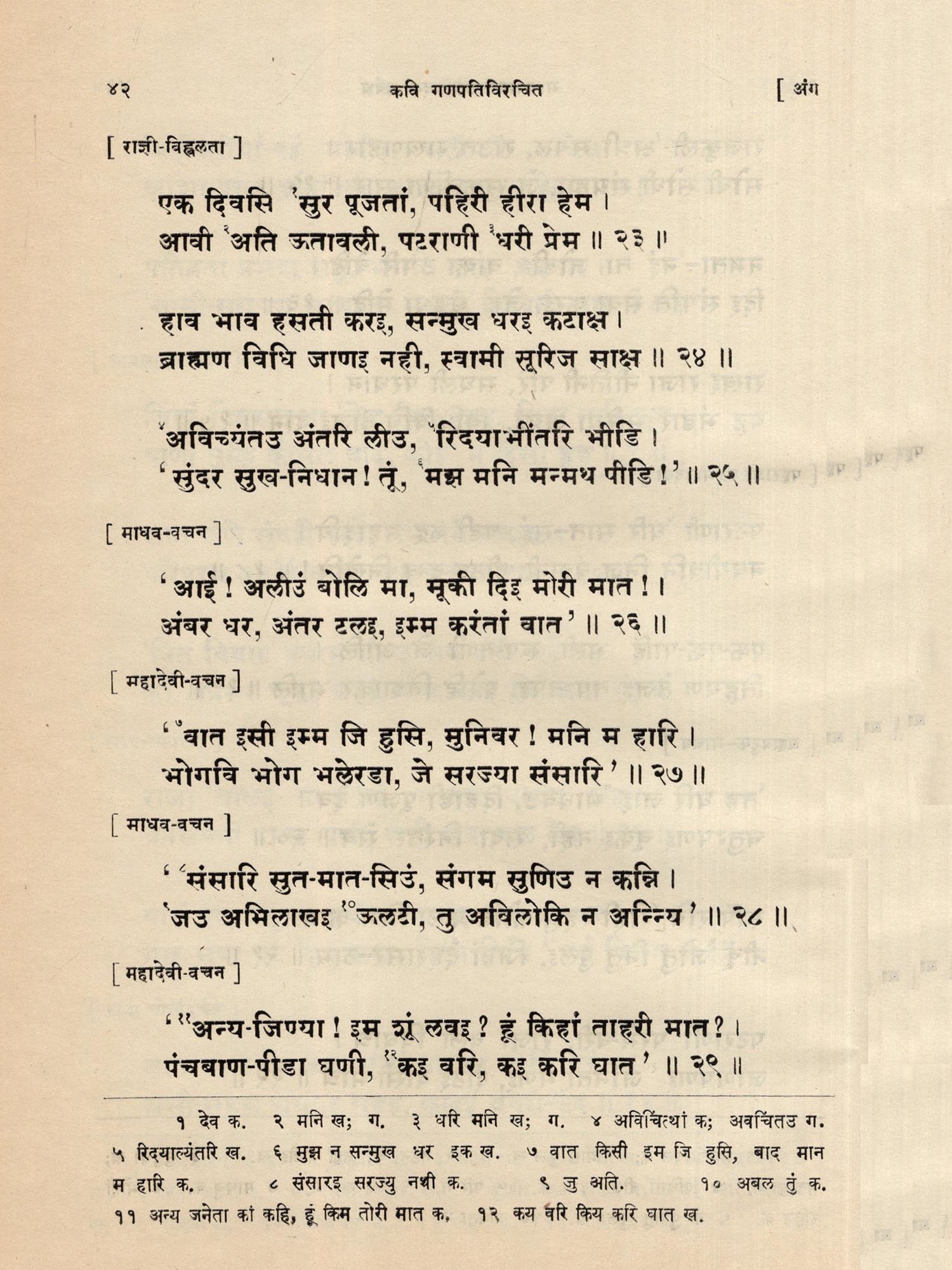 It is very common to find the description of pangs of love of a nayika (heroine) on separation from her lover given in dramas and in poems popularly known as seasonal songs or songs of the Twelve-months' cycle of the year the Baramasi songs. These constitute one of the principal items in the repertory of popular feminine music all over India even now, and especially so in Gujarat and Bengal. (See Kamakandala-Viraha Bara-Masa, Anga VI, duha 517-614). The romance of Madhavanala-Kamakandala by Ganapati is unique in describing the pangs of the hero also at the separation from his beloved (Anga VII, dūhá 137-172). Over and above these two songs of separa-tion, the poem indulges in a pleasant description of the pleasures and pastimes of the united lovers starting the description at all the three places from Fålguna, the month of Spring (Anga VIII, duhà 16-136).