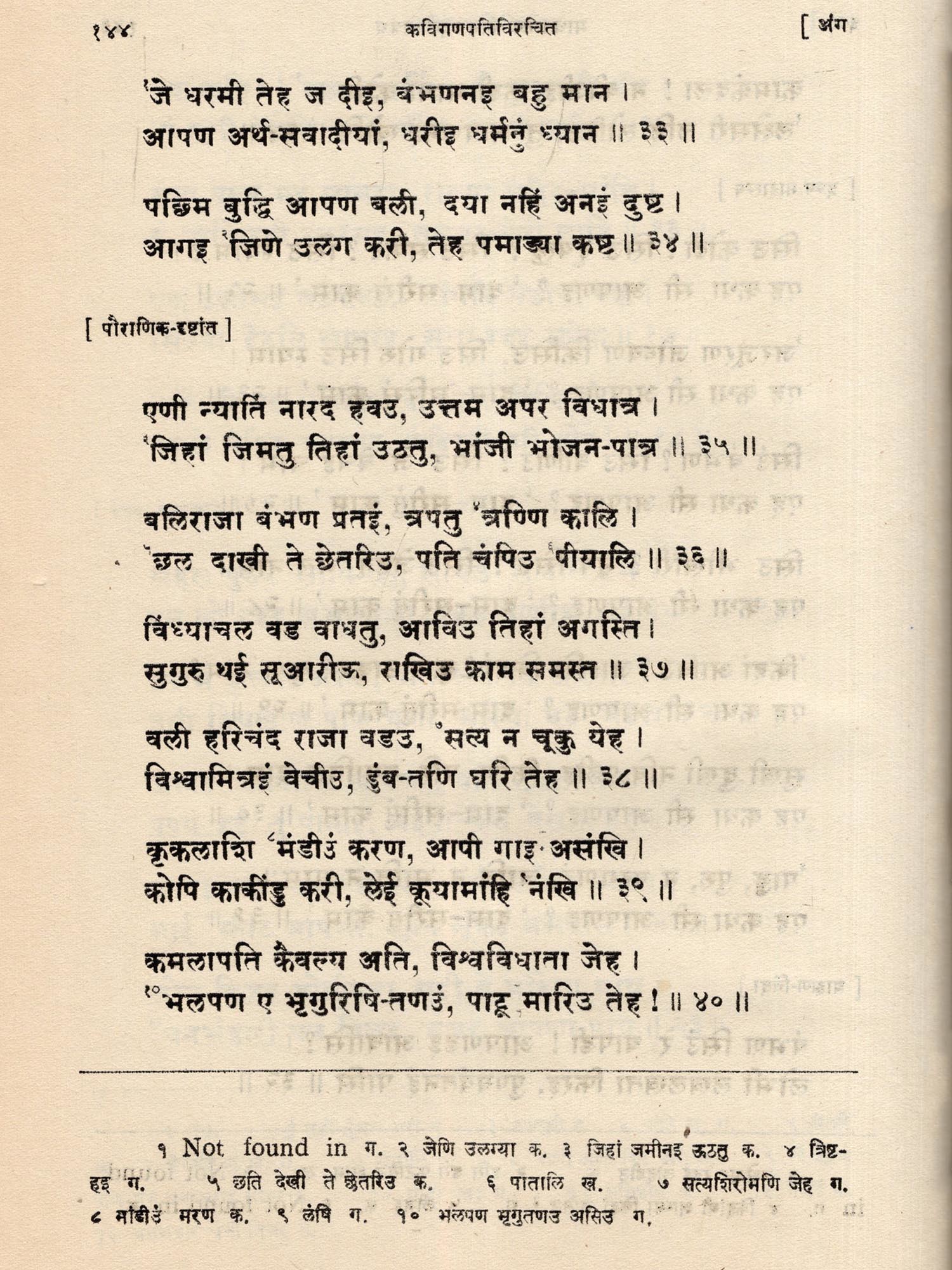 Prahelika, or a riddle, was a literary feature which they had inherited from their Sanskrit forbears, as mentioned by Dandin in his Kavyadarśa, as having sixteen varieties of the same. Heroine after heroine goes about offering riddles to men, after having solemnly resolved to marry only the happy suitor who is clever enough to solve them. Perhaps, in absence of public literary life, this was the only kind of cleverness which appealed to intelligent women. The Samasya-Vinoda occurs in the Madhavanala-Pra-bandha at as many as three places covering over two hundred verses (Anga V, duha 128-172; Anga VI, daha 643-761; and Anga VIII, duha 146-185).
